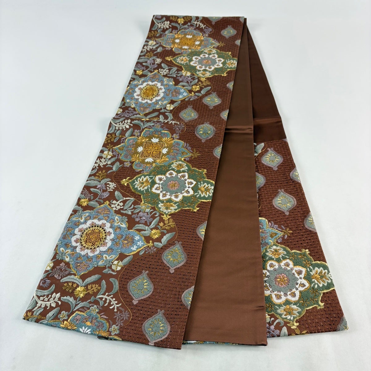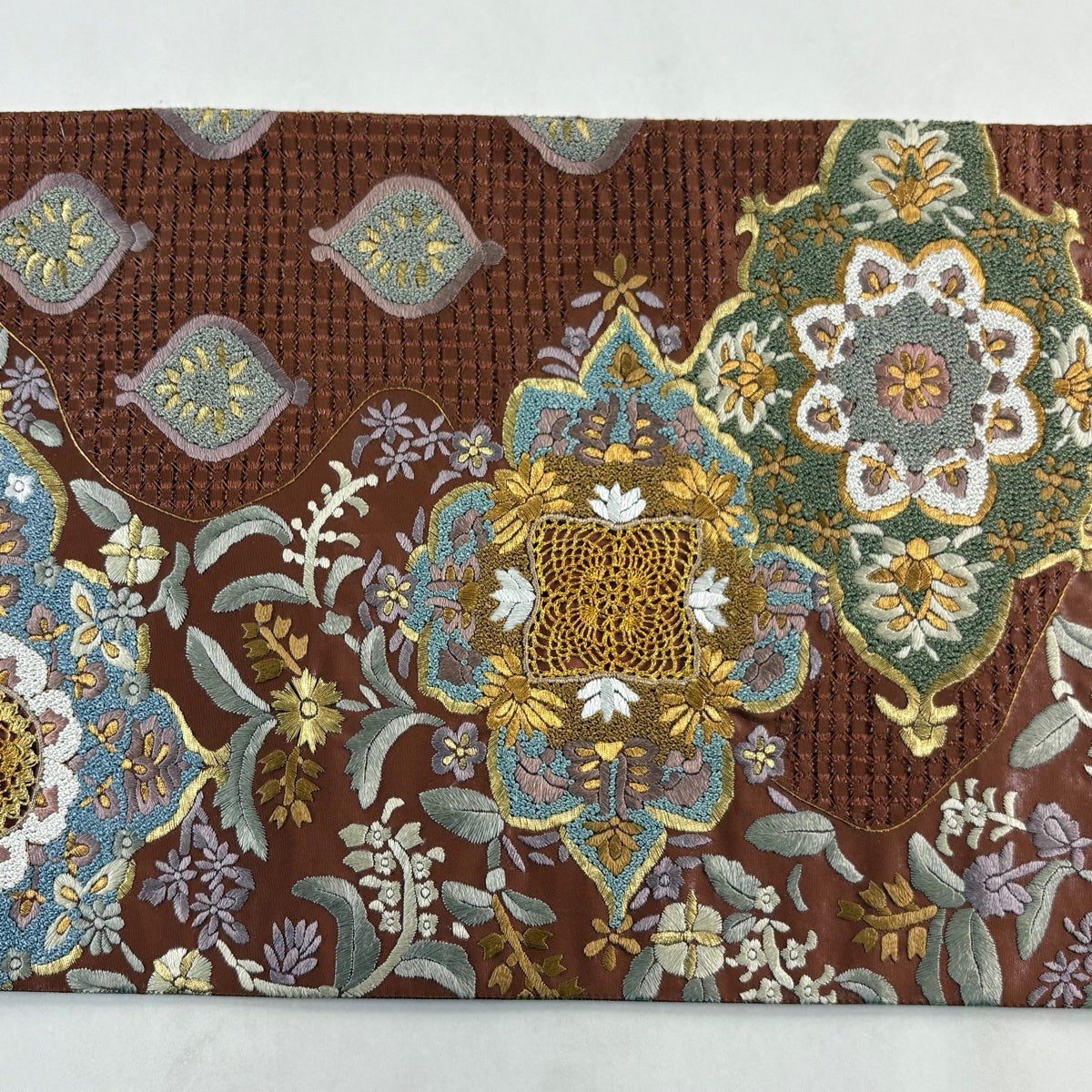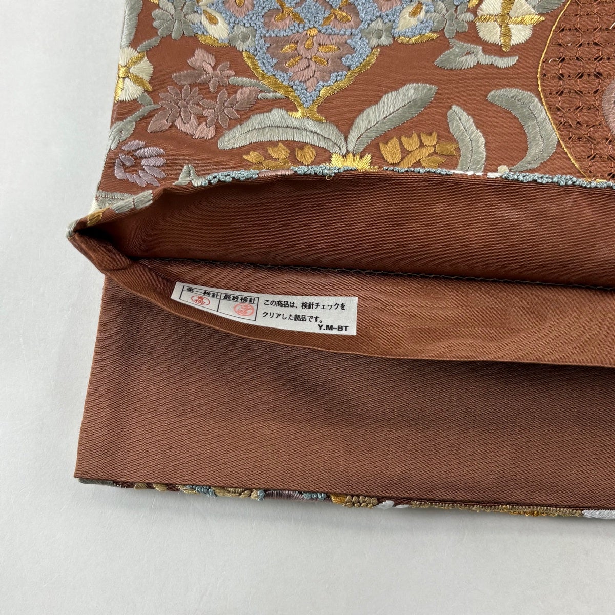 【美品】 袋帯 逸品 華文 花唐草 刺繍 金糸 茶色 六通 正絹