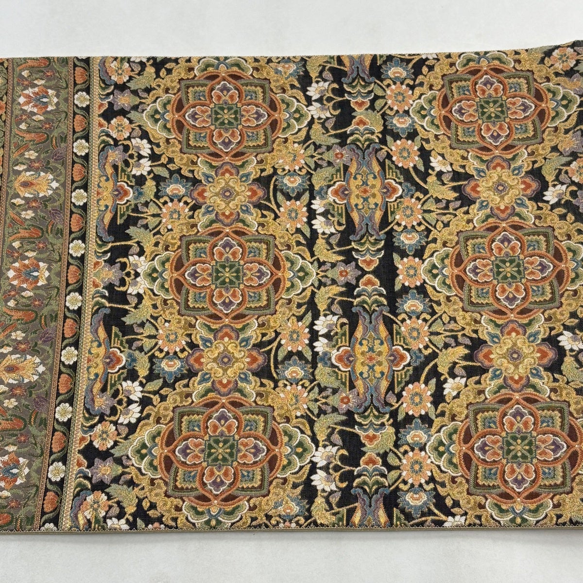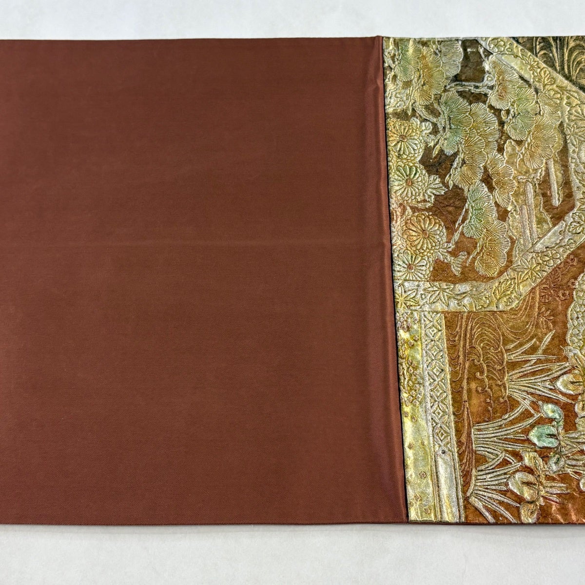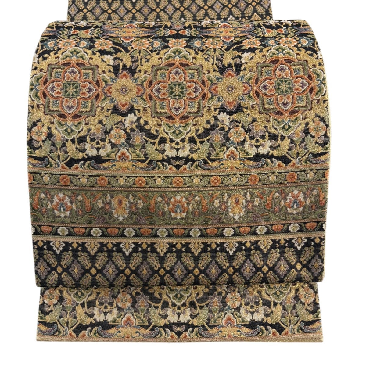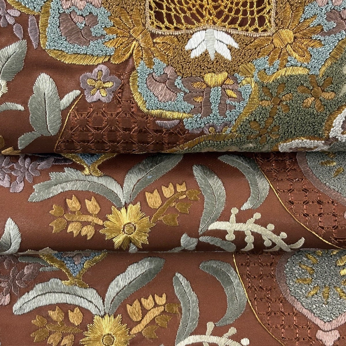 【美品】 袋帯 逸品 華文 花唐草 刺繍 金糸 茶色 六通 正絹