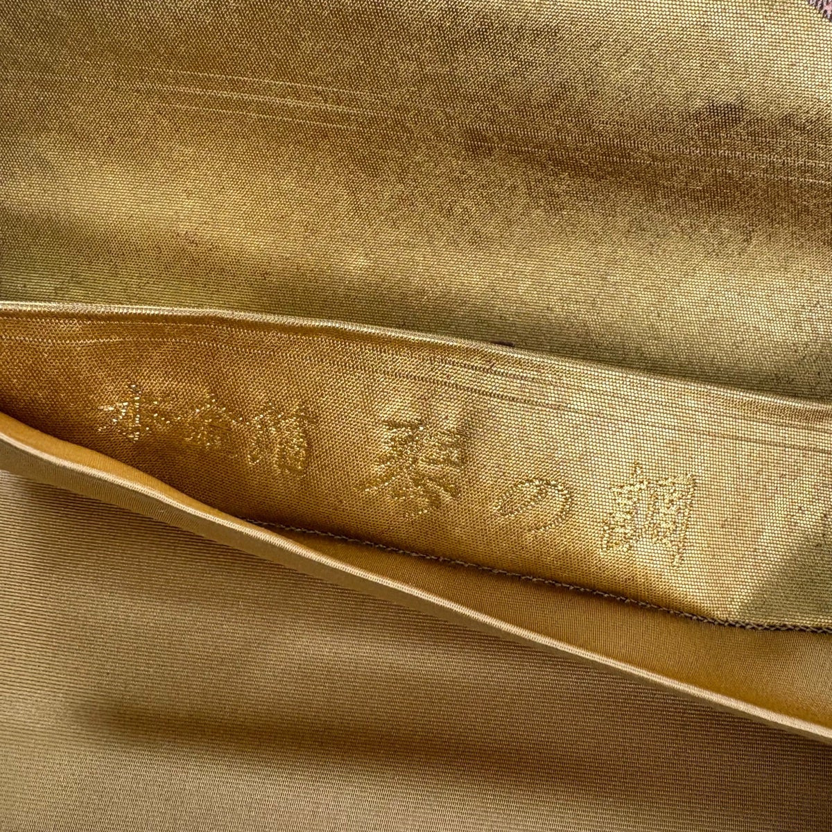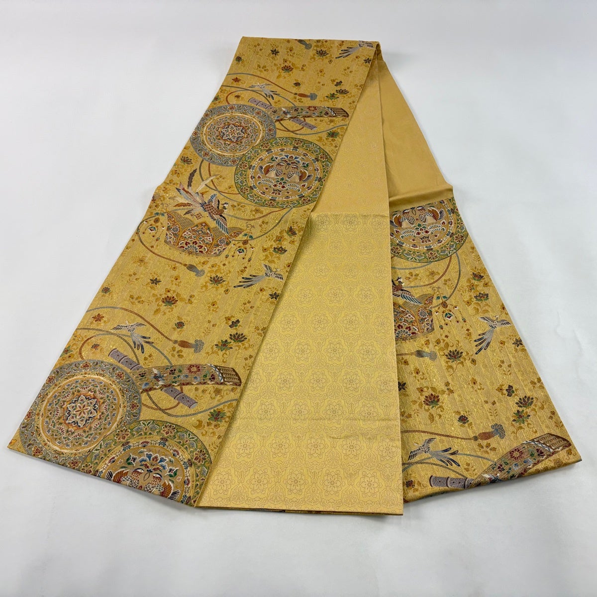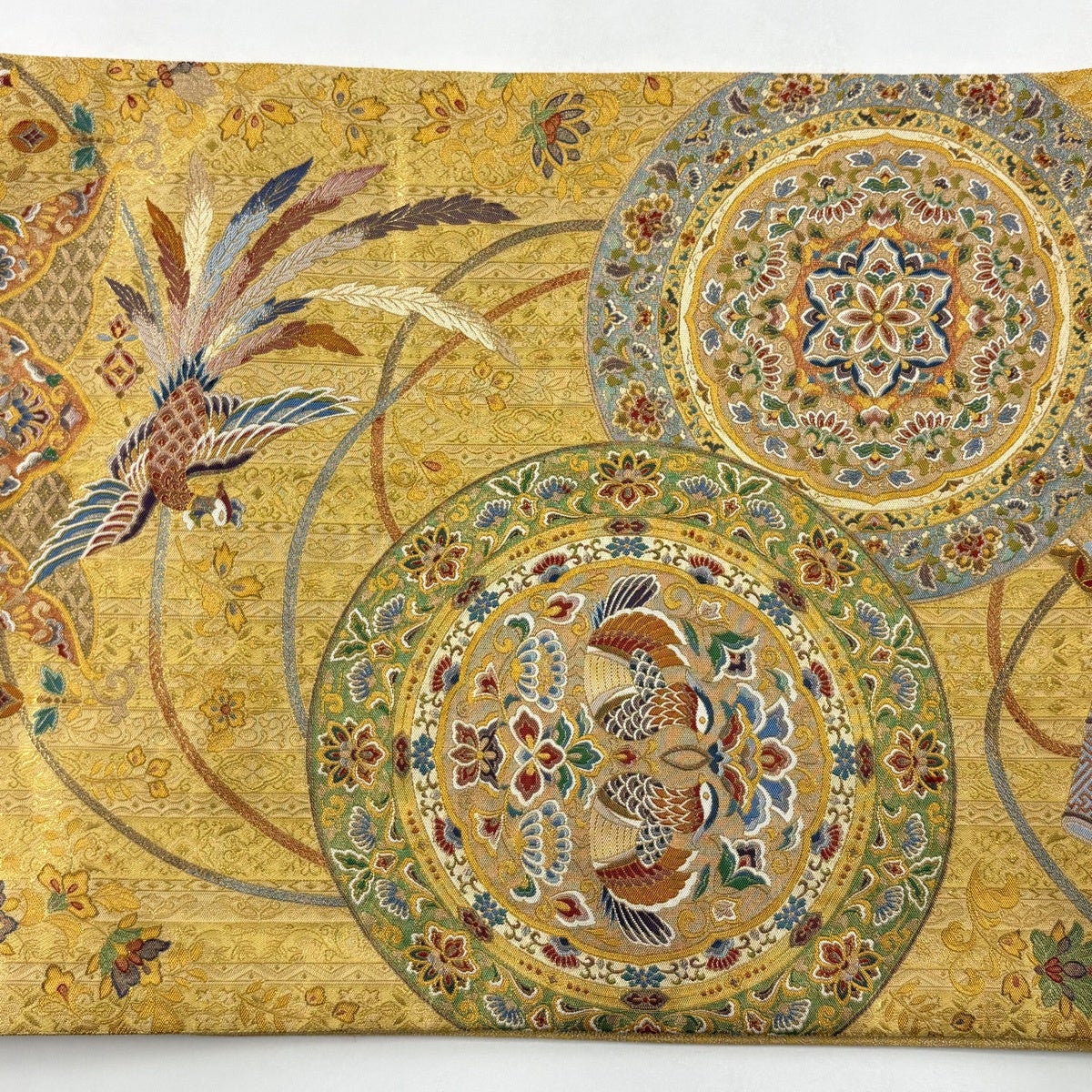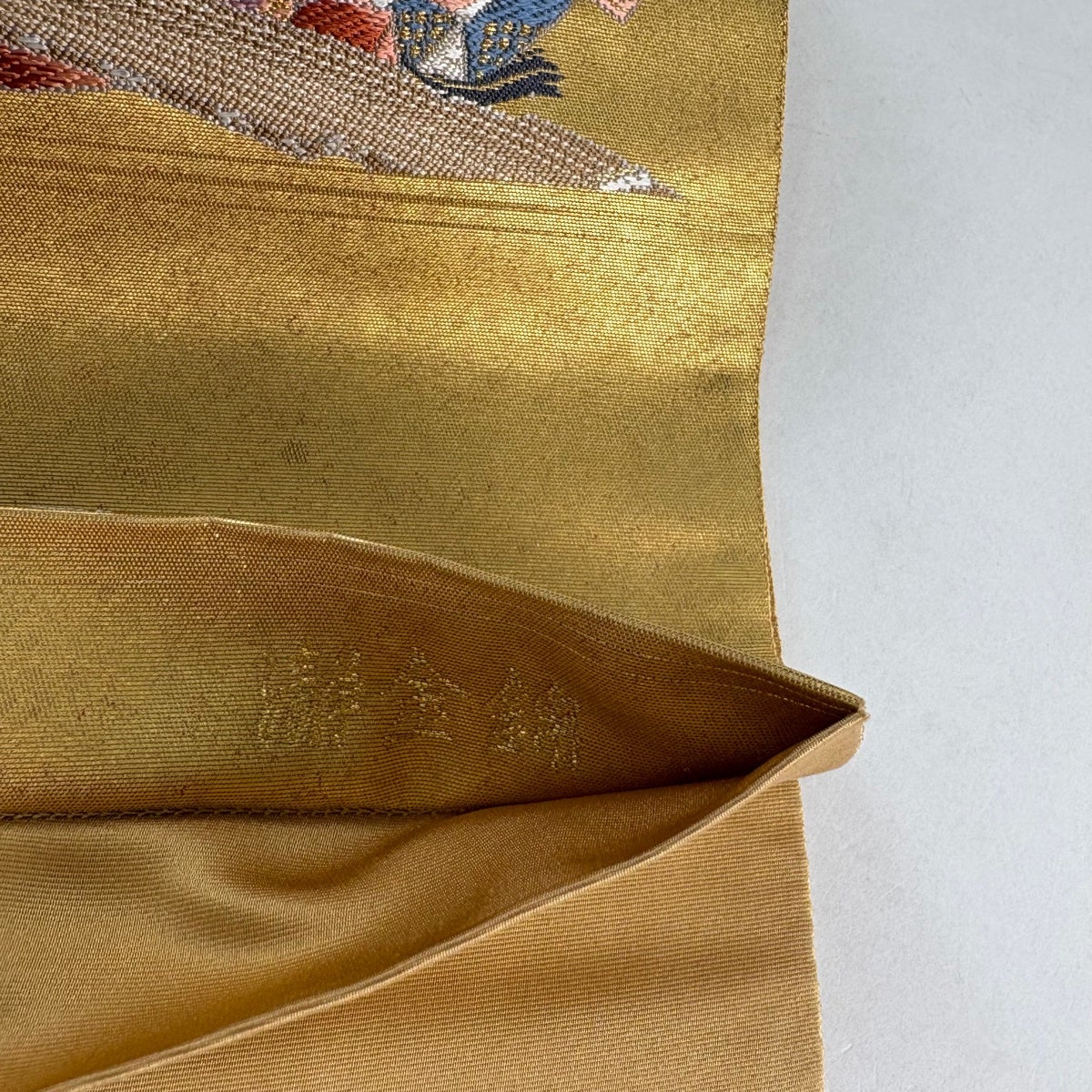 【美品】 袋帯 逸品 落款あり 牛首紬 コプト柄 花鳥 金彩 金色 全通 正絹