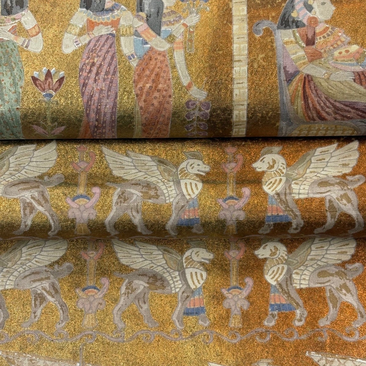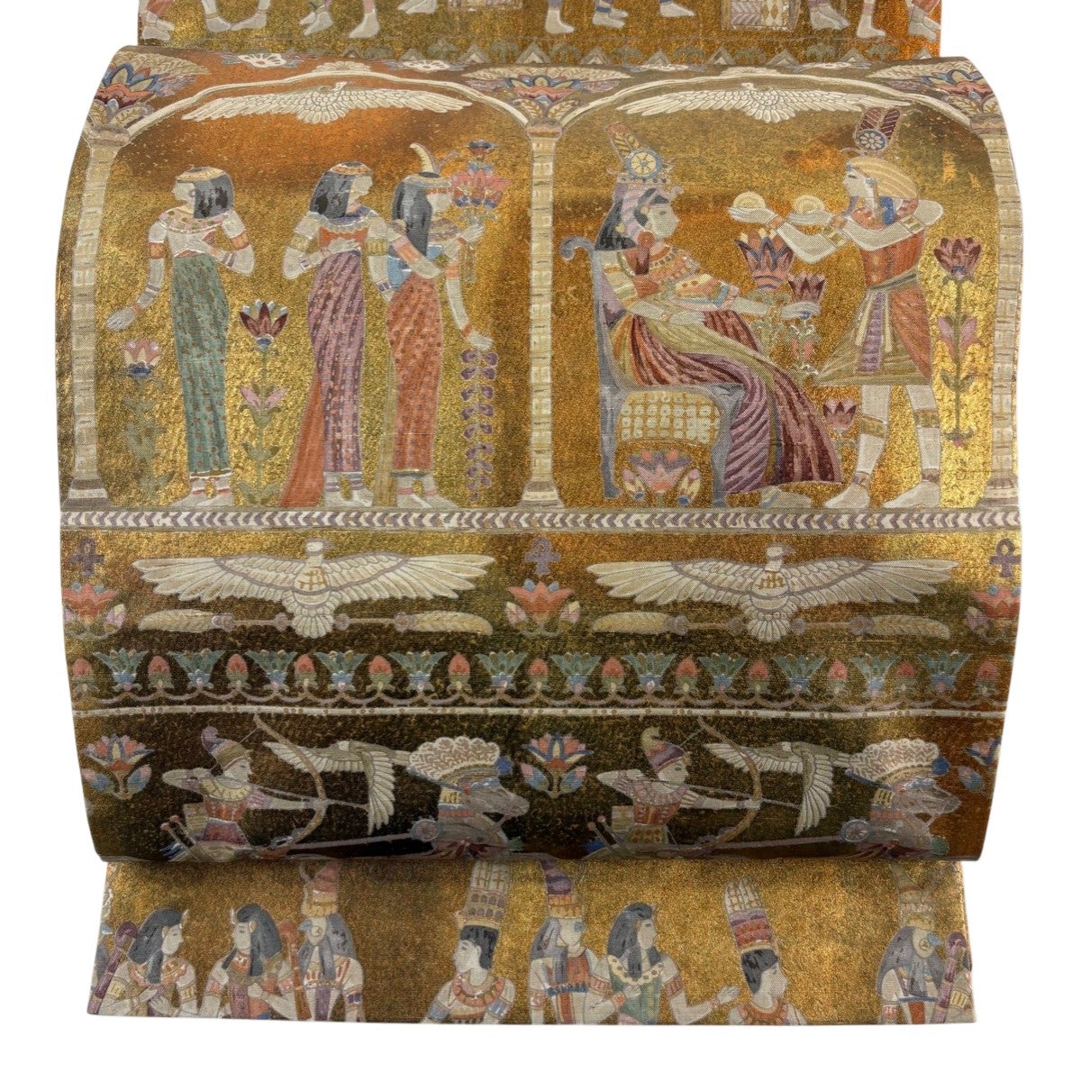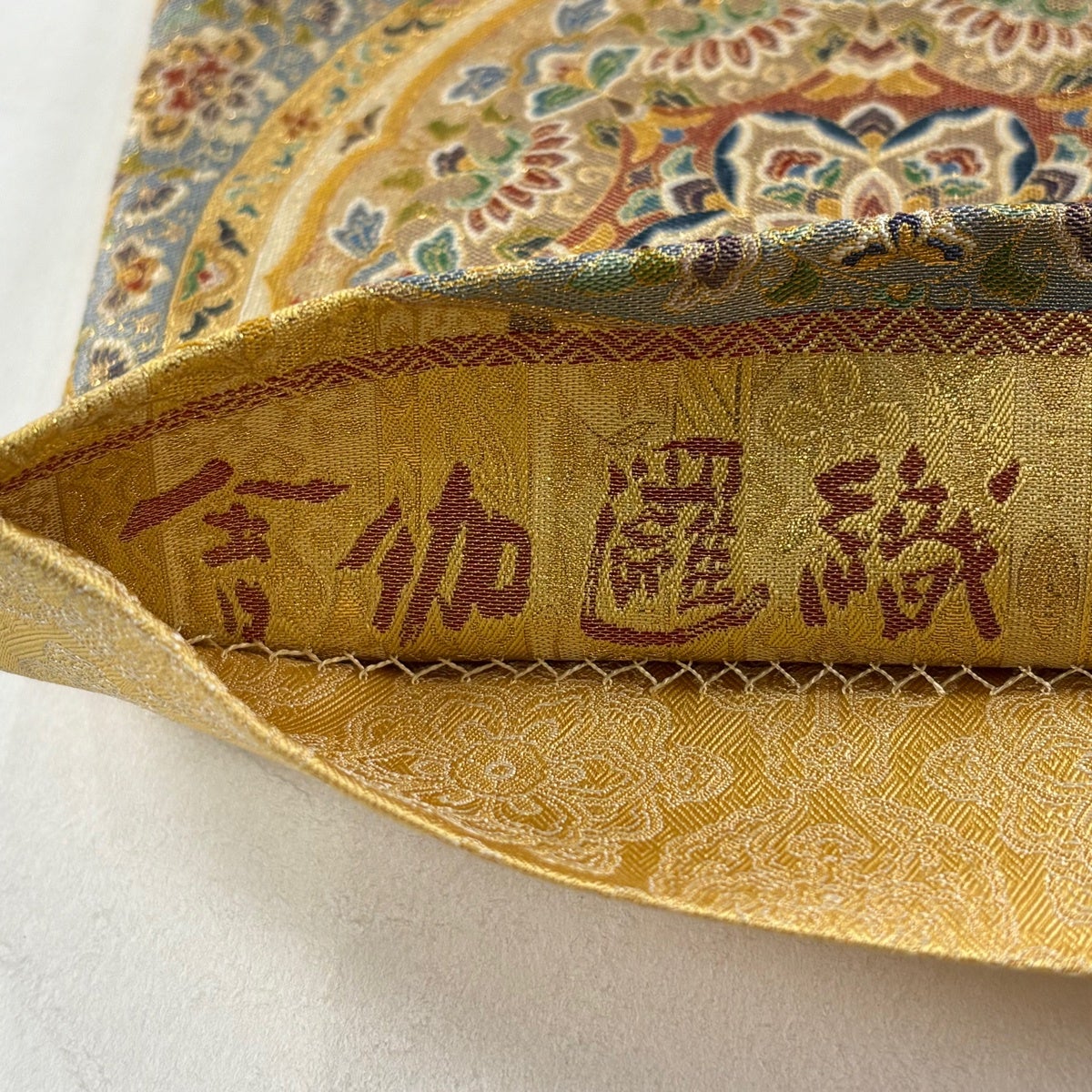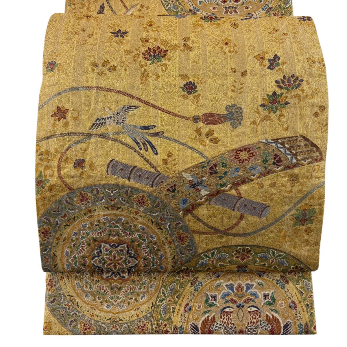 【美品】 袋帯 逸品 落款あり 牛首紬 コプト柄 花鳥 金彩 金色 全通 正絹