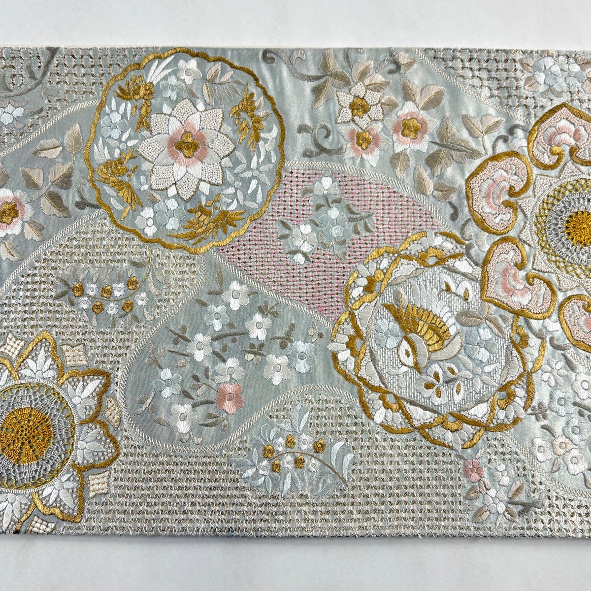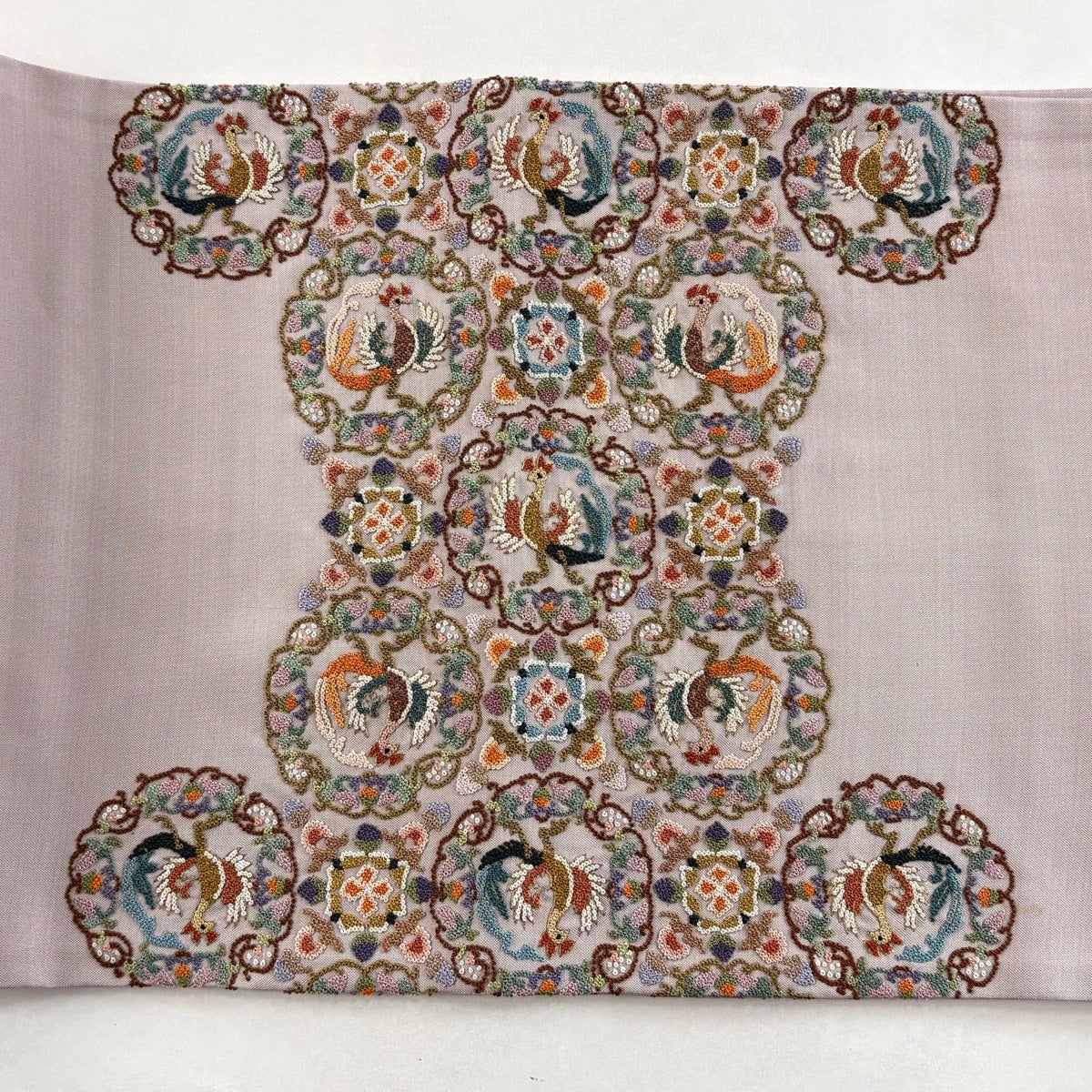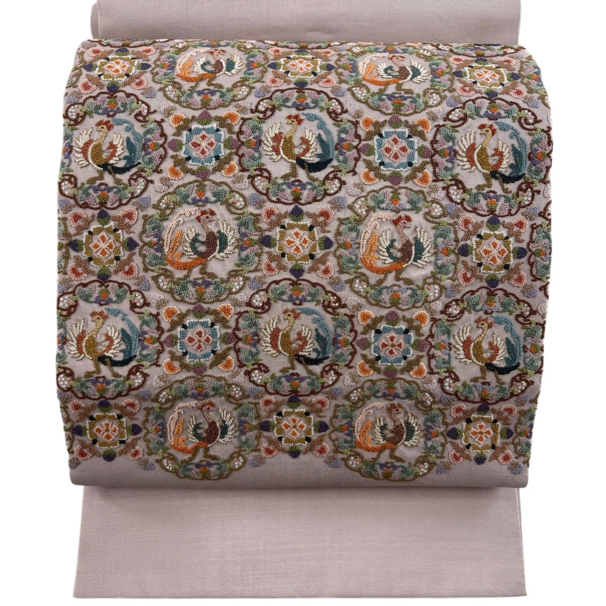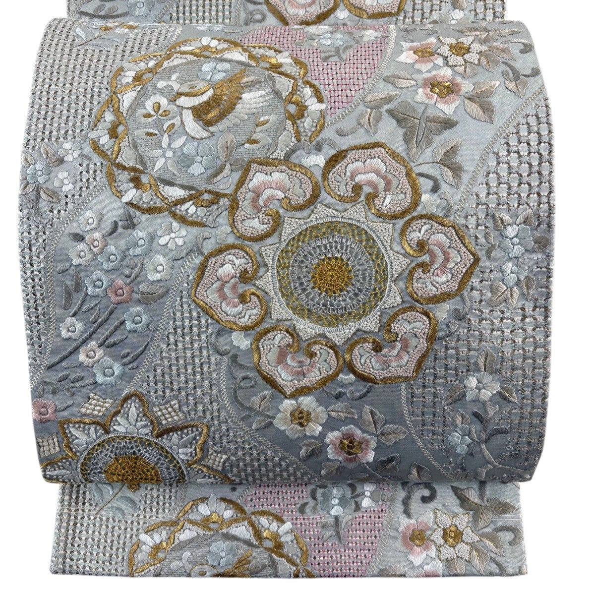 袋帯 逸品 華文 花鳥 刺繍 箔 銀色 六通 正絹