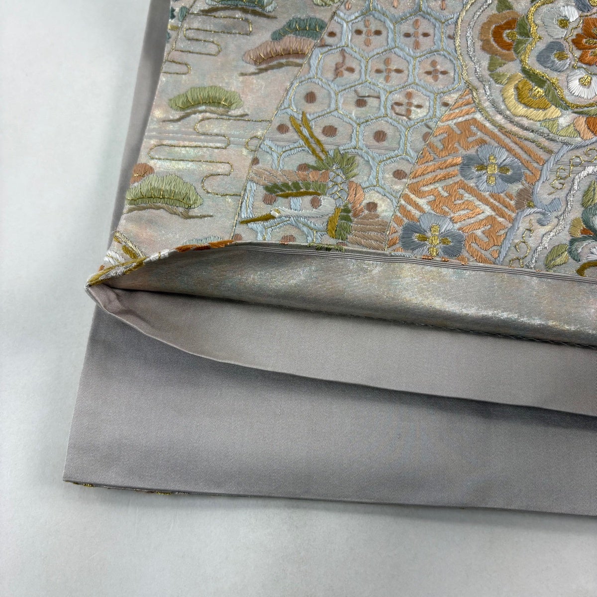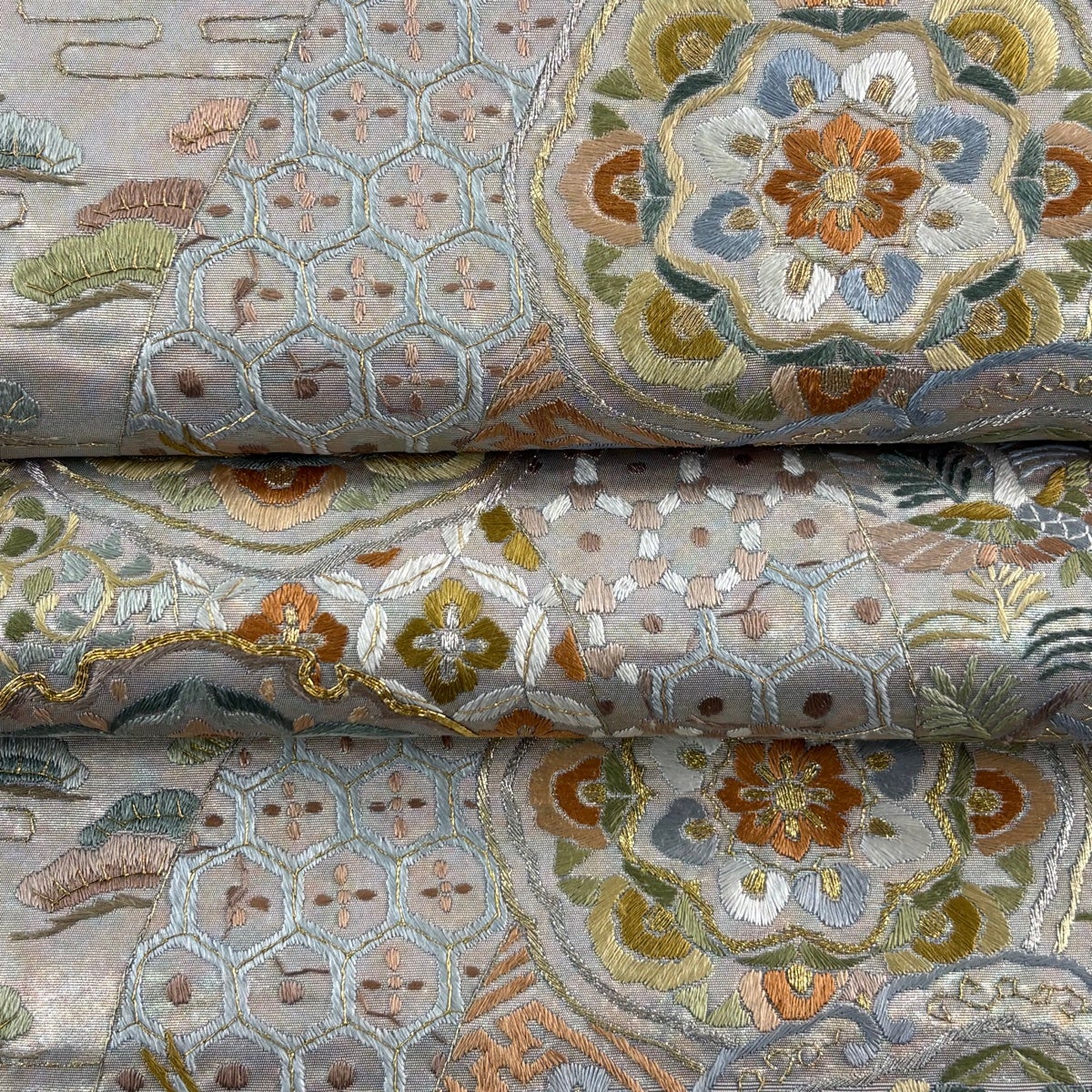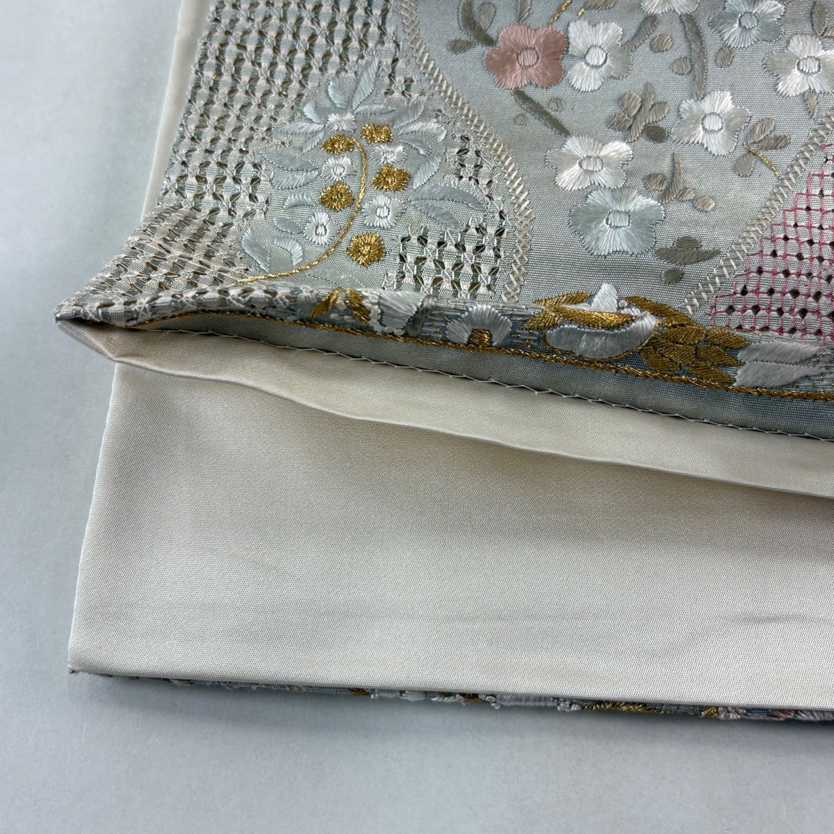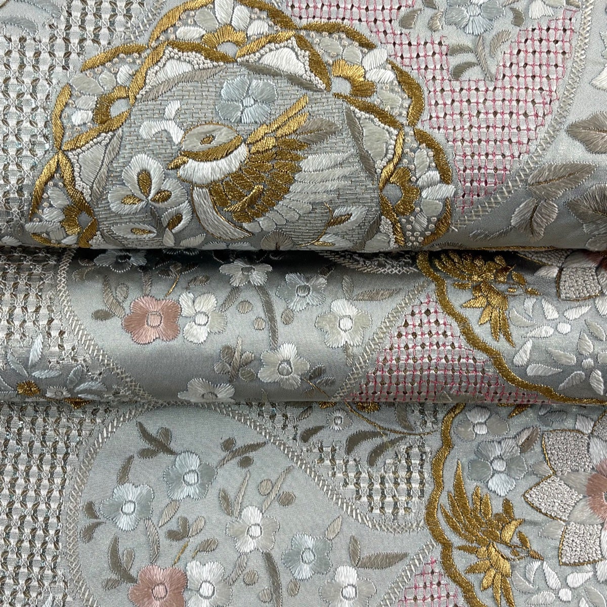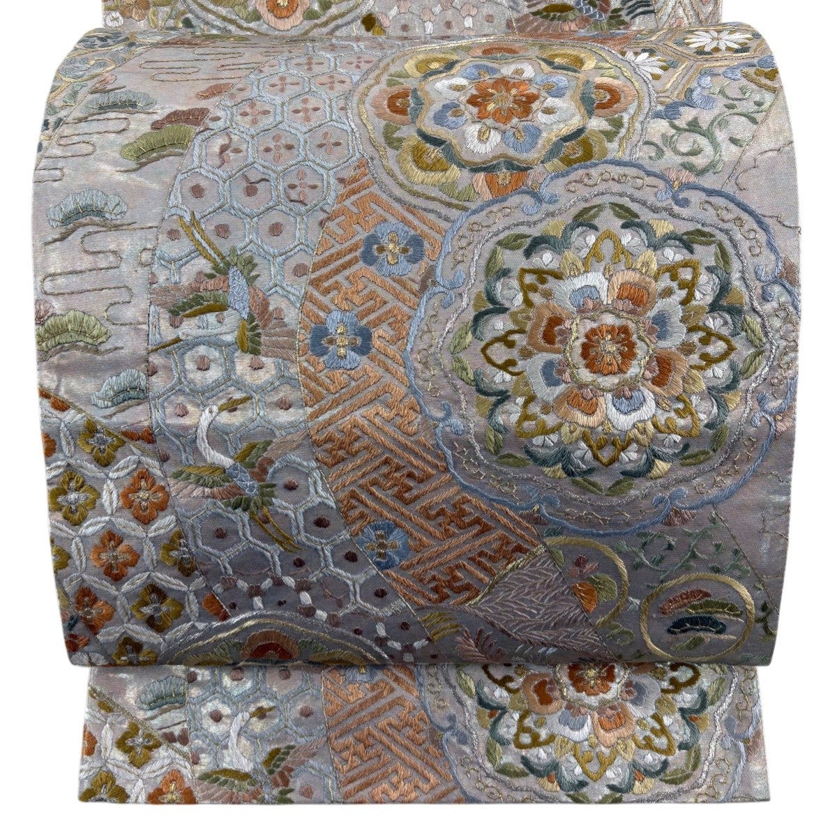 袋帯 逸品 華文 花鳥 刺繍 箔 銀色 六通 正絹