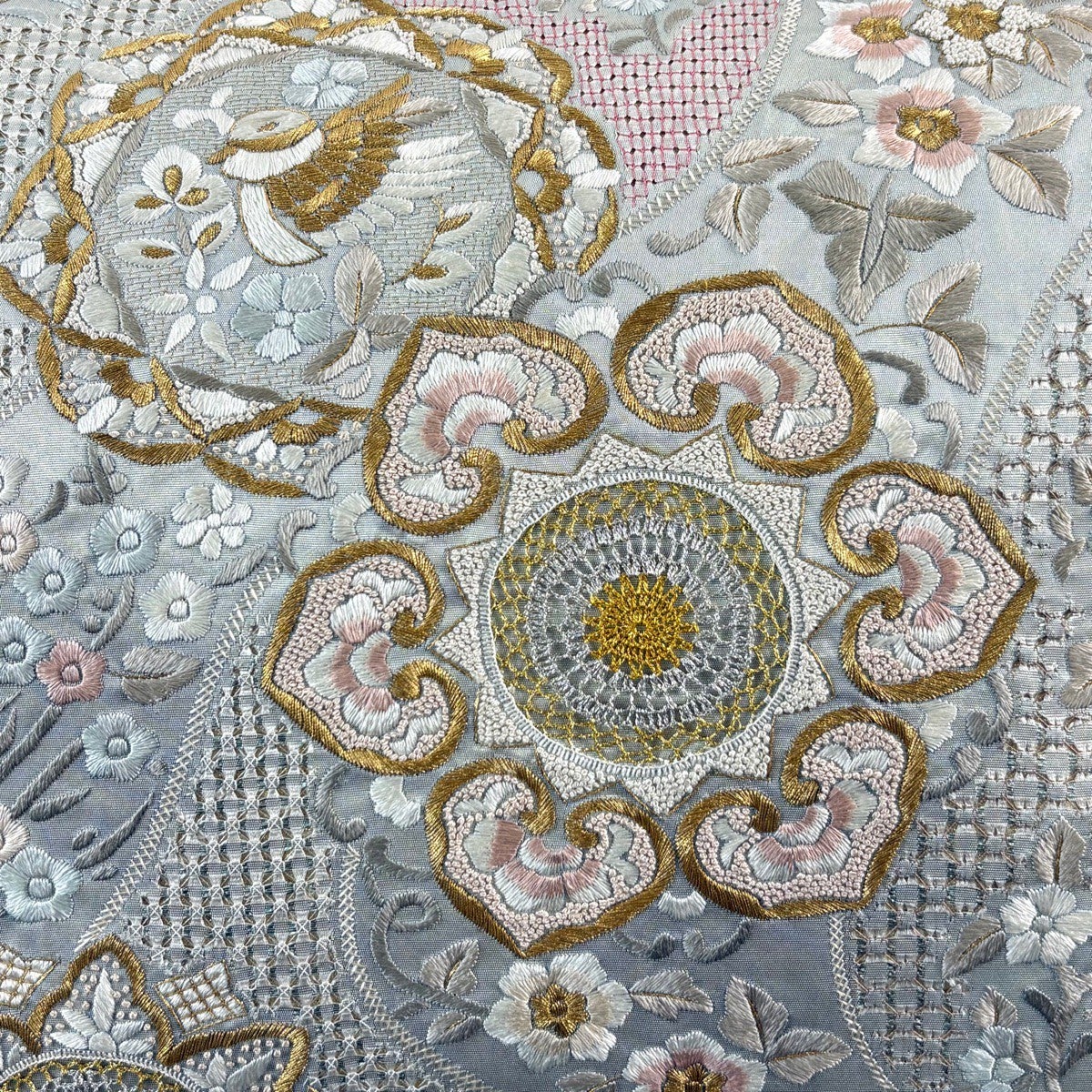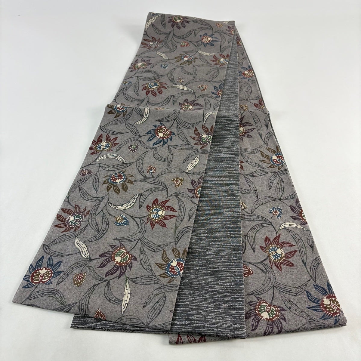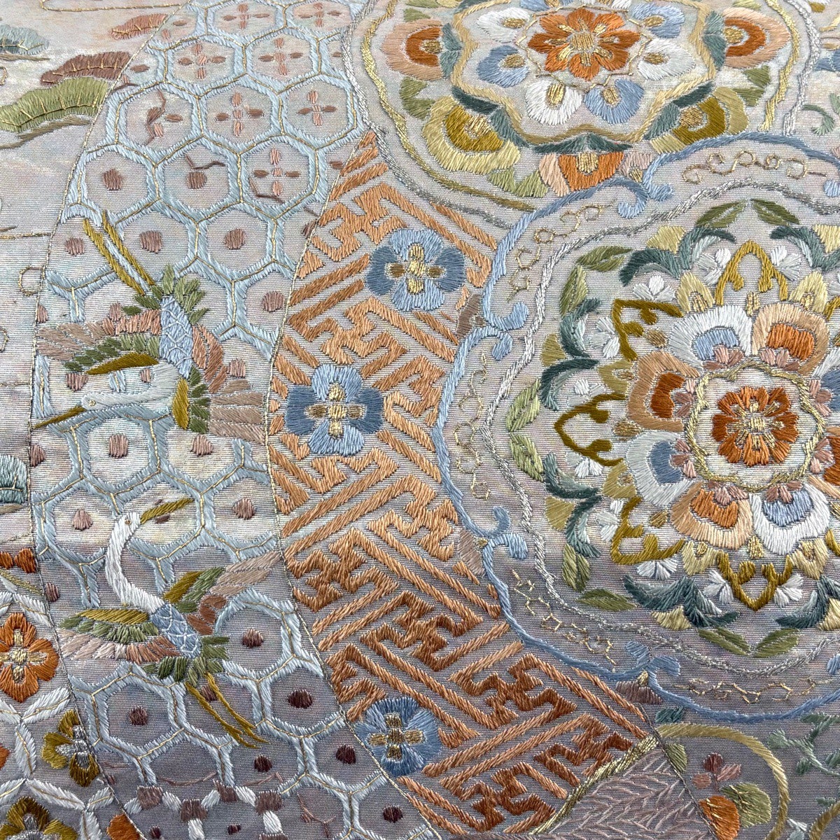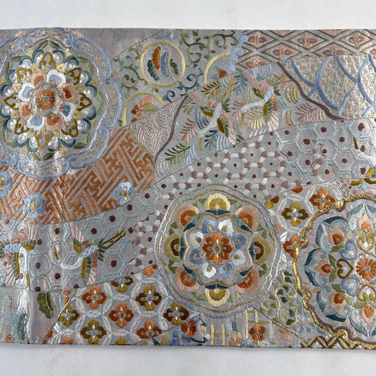 袋帯 逸品 華文 花鳥 刺繍 箔 銀色 六通 正絹