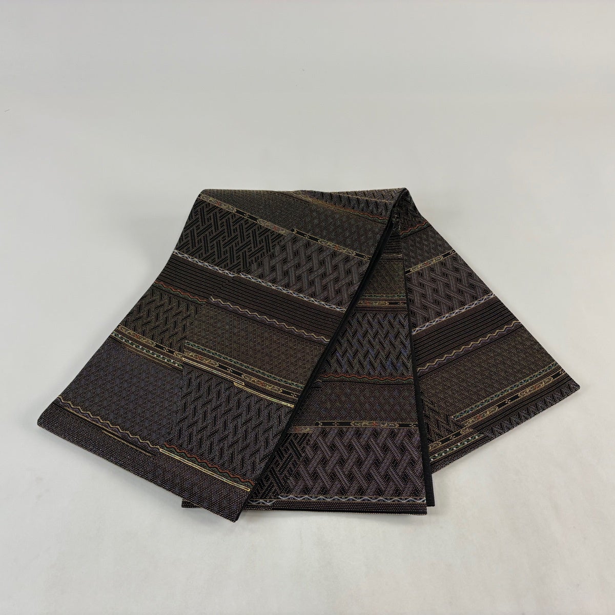 名古屋帯 名品 紬地 段縞 薄茶色 正絹