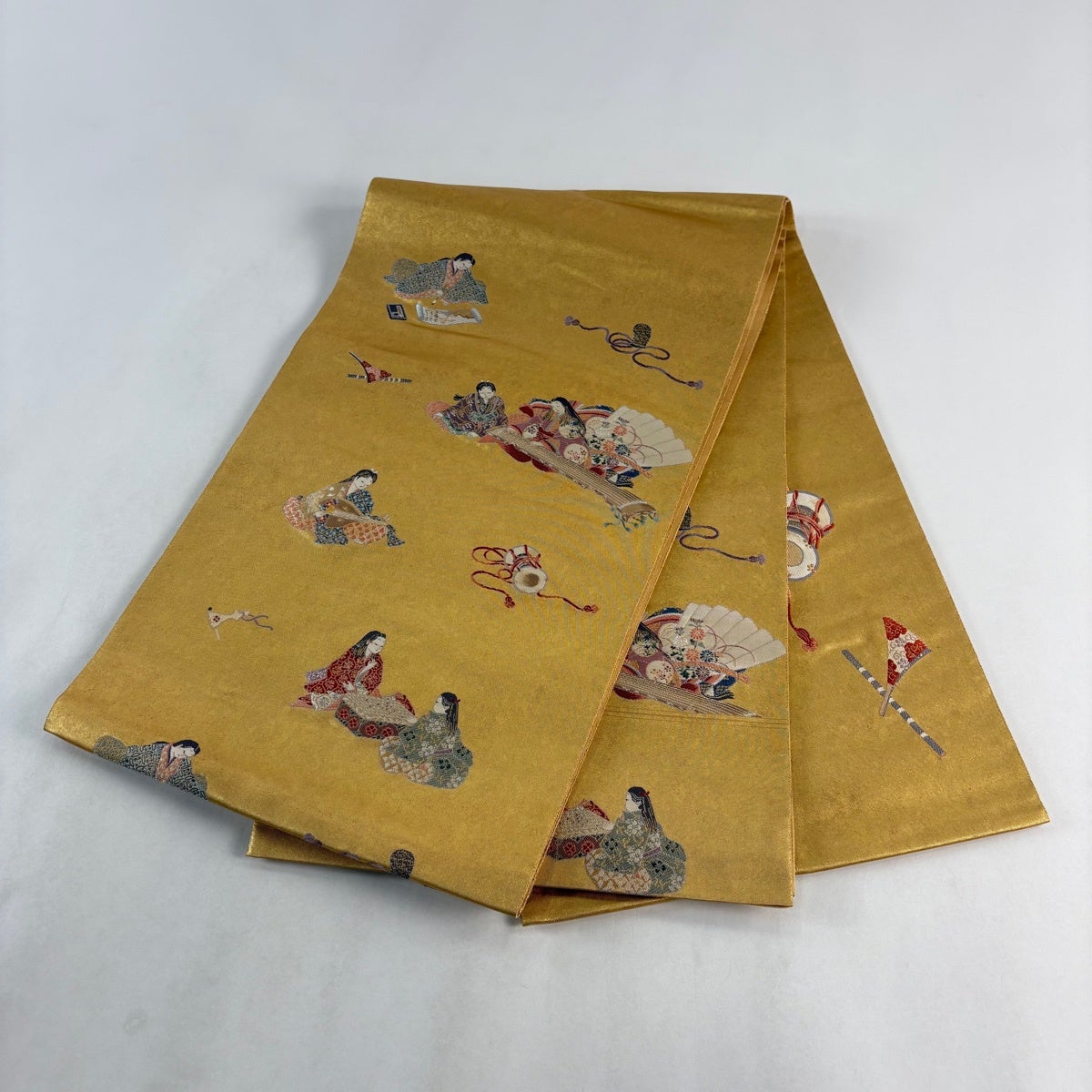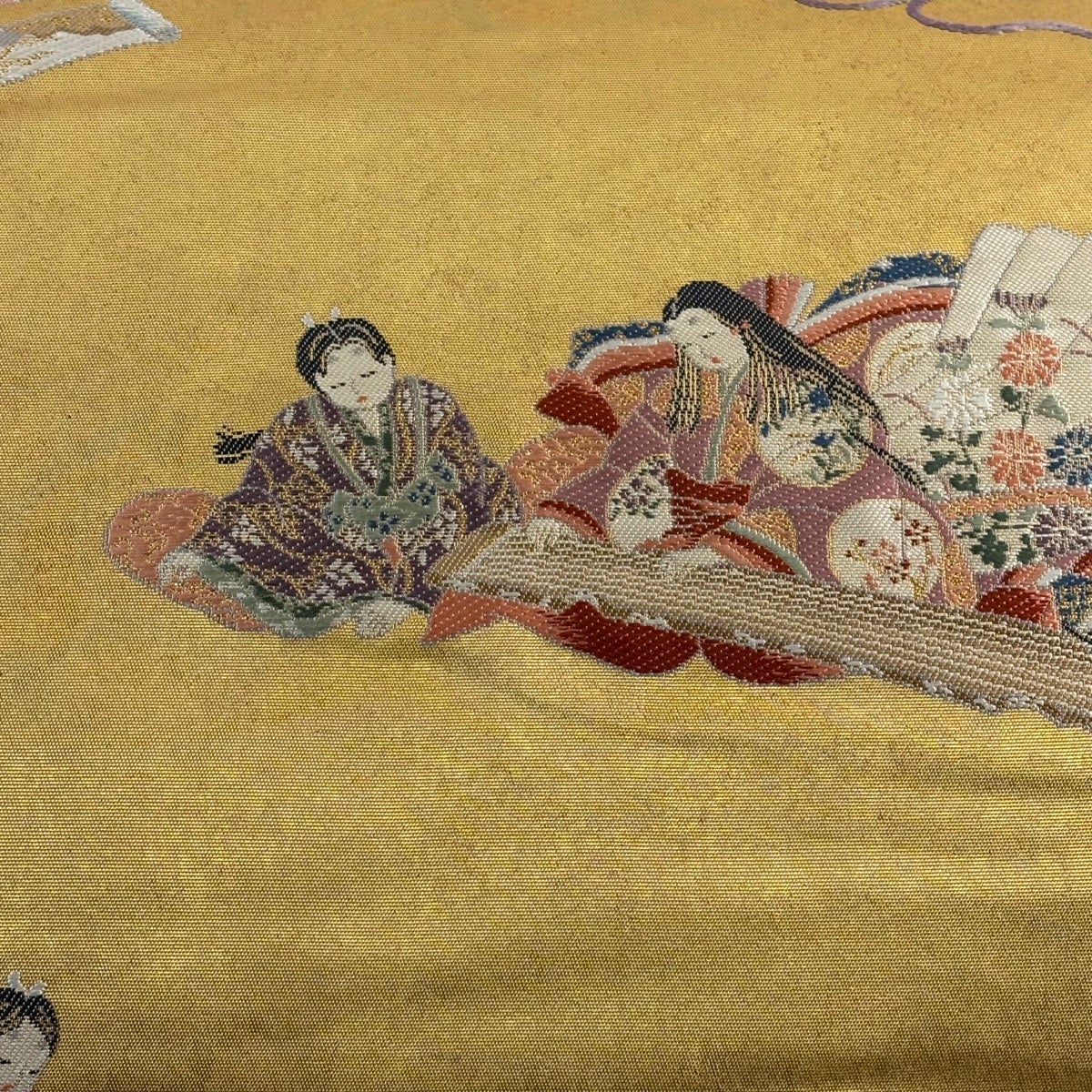 【美品】 袋帯 逸品 白綾苑大庭 落款あり 花唐草 金糸 黄土色 六通 正絹