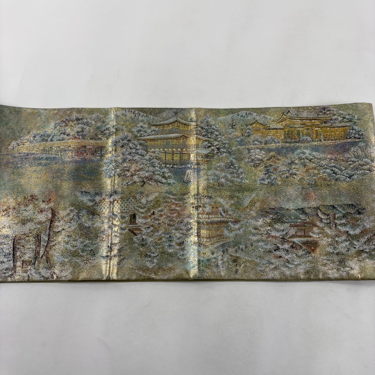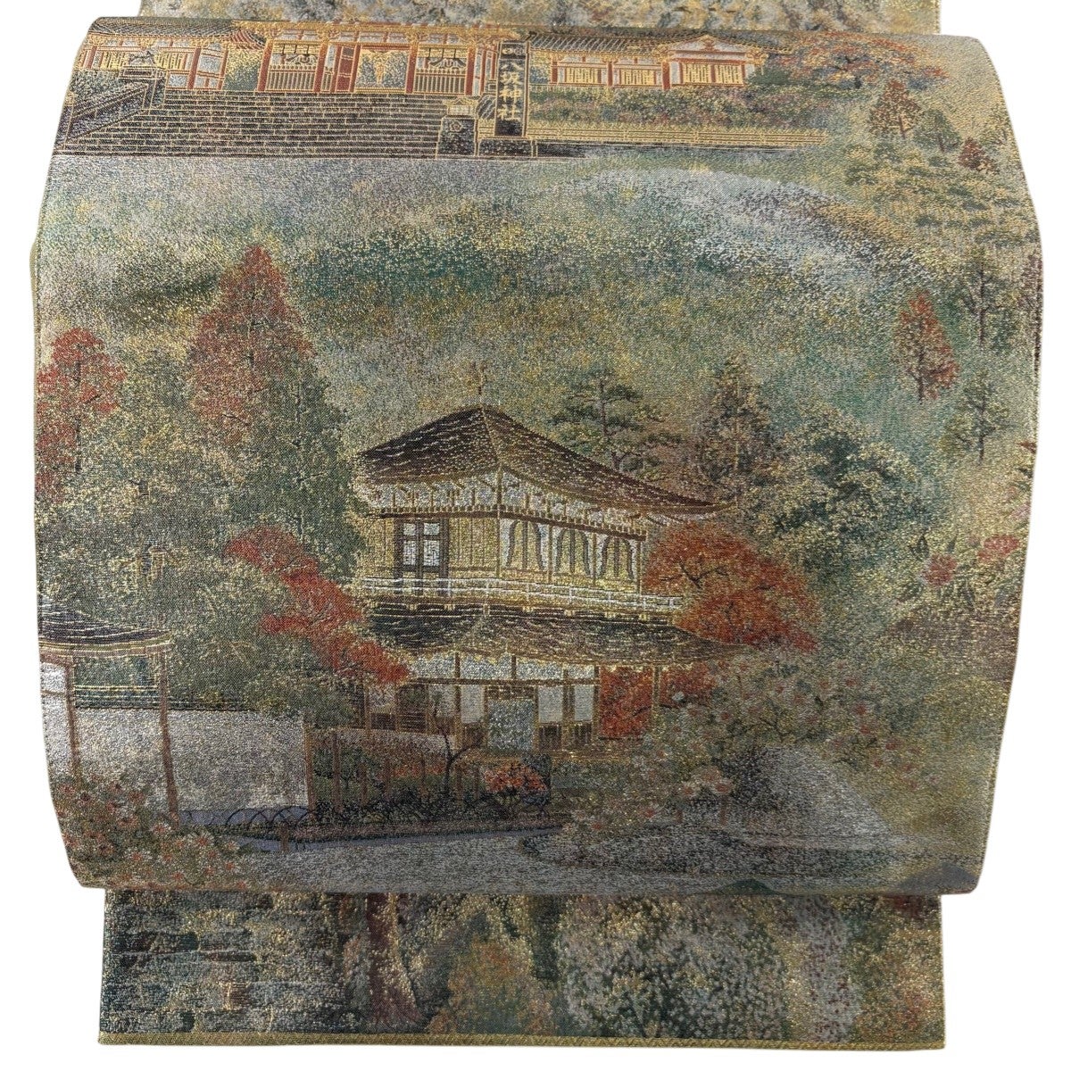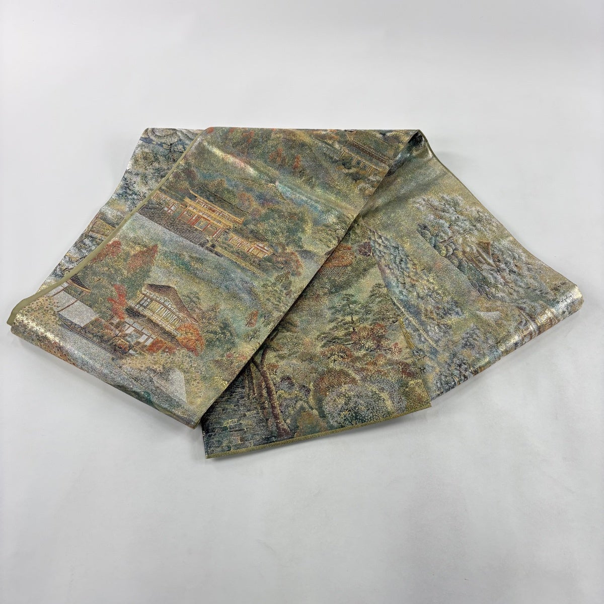 【美品】 袋帯 秀品 京の四季 建物 樹木 箔 灰緑 お太鼓柄 正絹