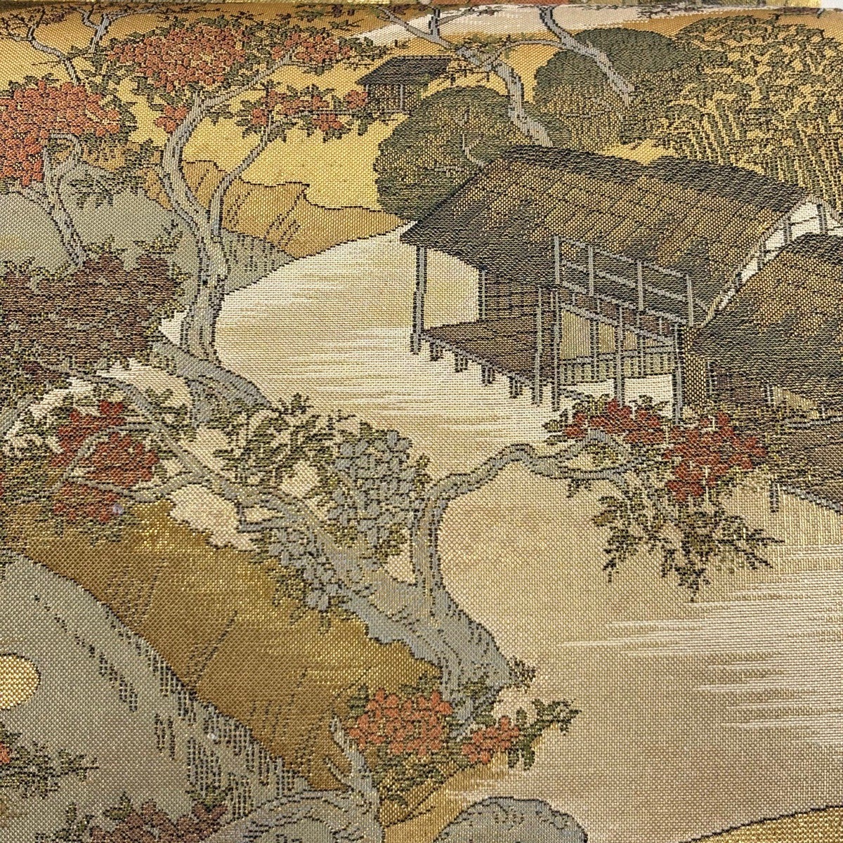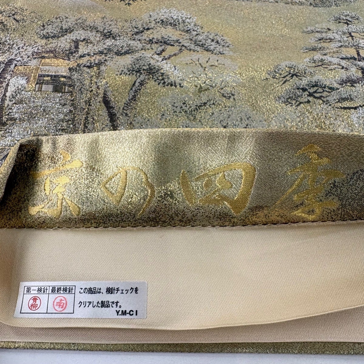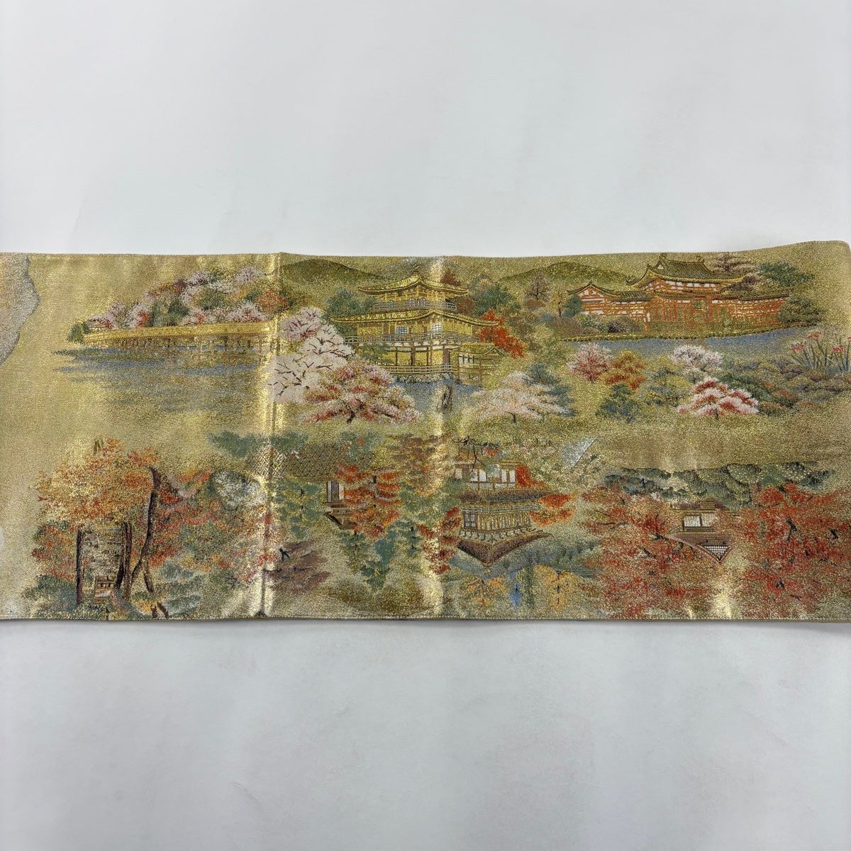 【美品】 袋帯 秀品 京の四季 建物 樹木 箔 金色 お太鼓柄 正絹