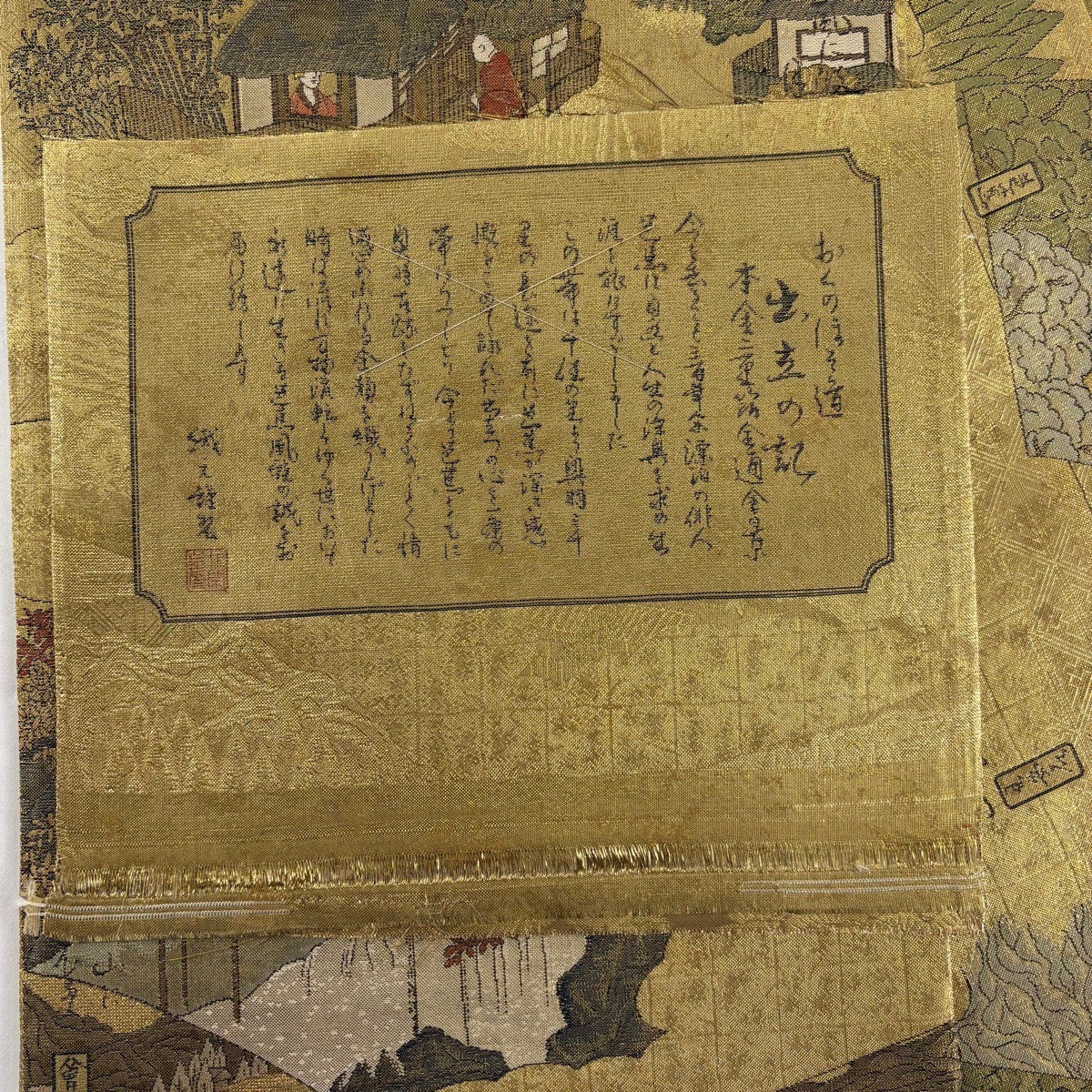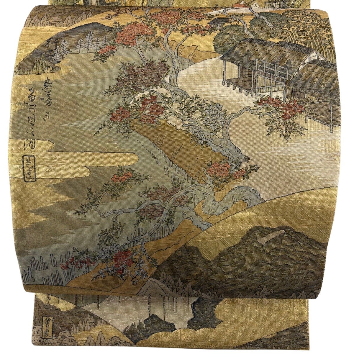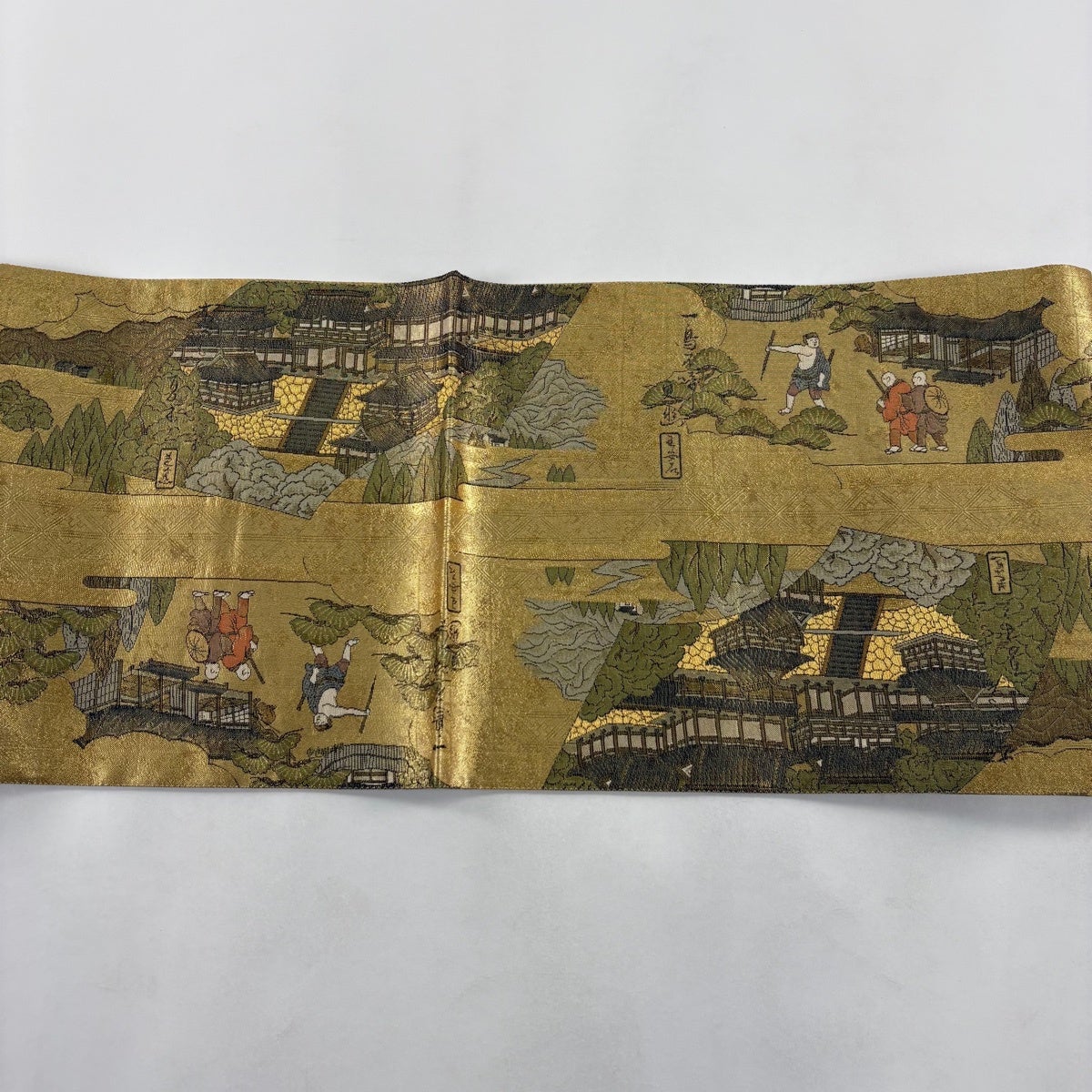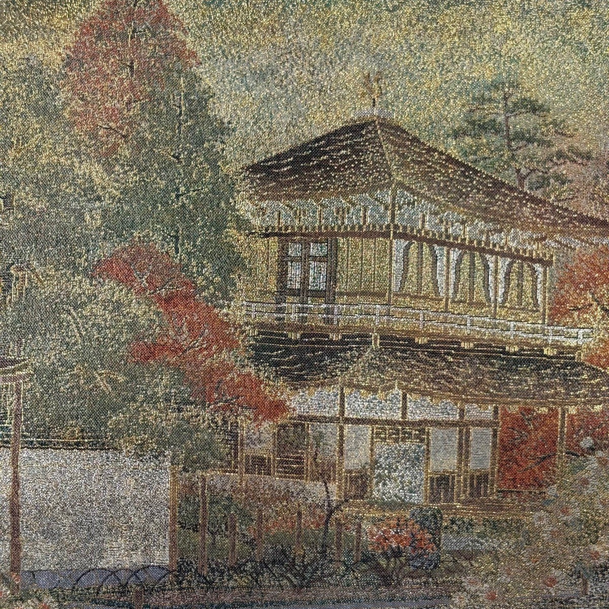 【美品】 袋帯 秀品 京の四季 建物 樹木 箔 金色 お太鼓柄 正絹