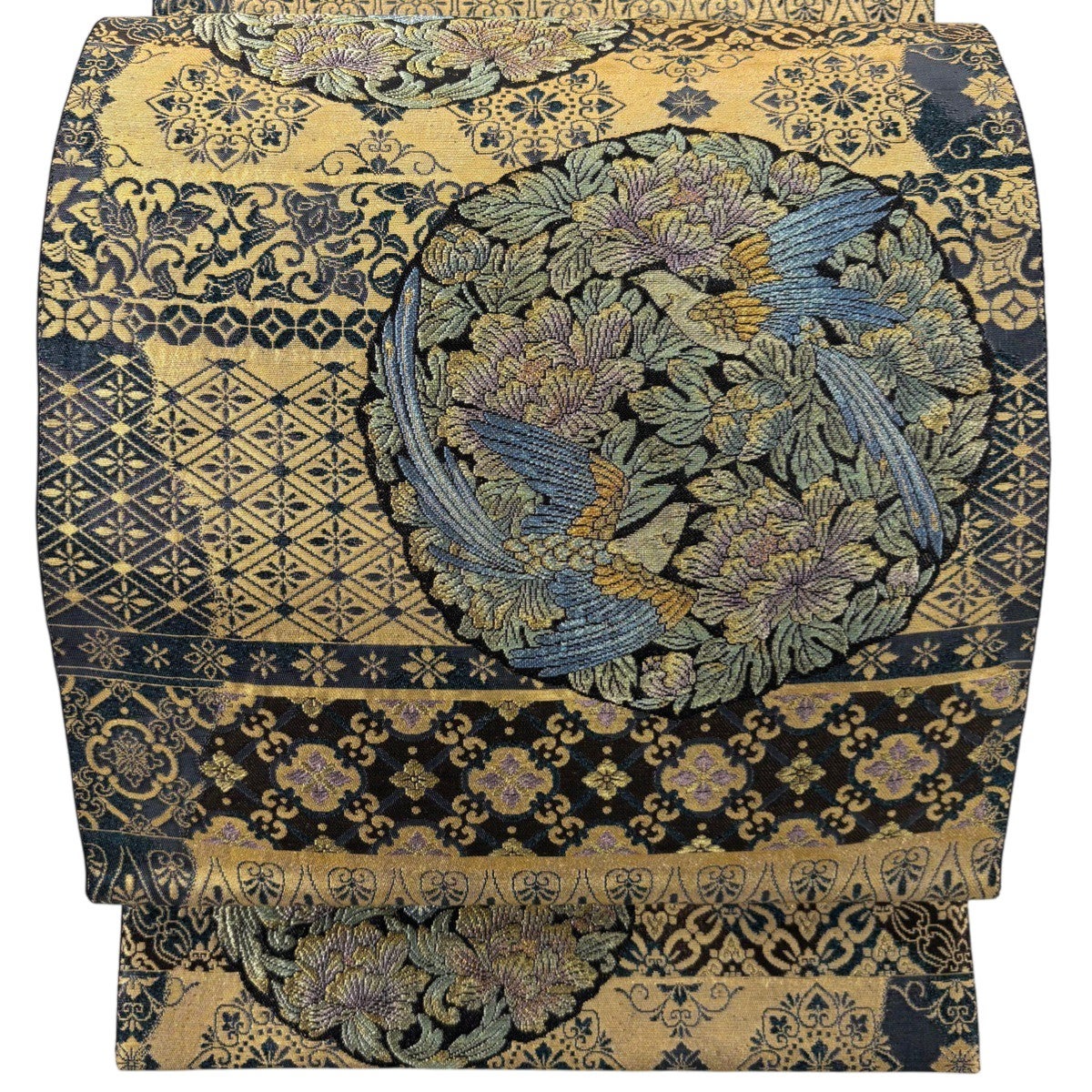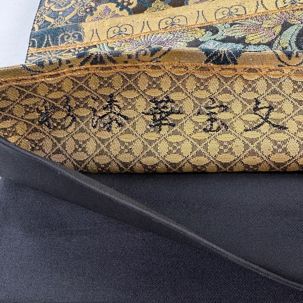 【美品】 袋帯 秀品 鈴乃屋 幾何学模様 箔 金銀糸 墨色 六通 正絹