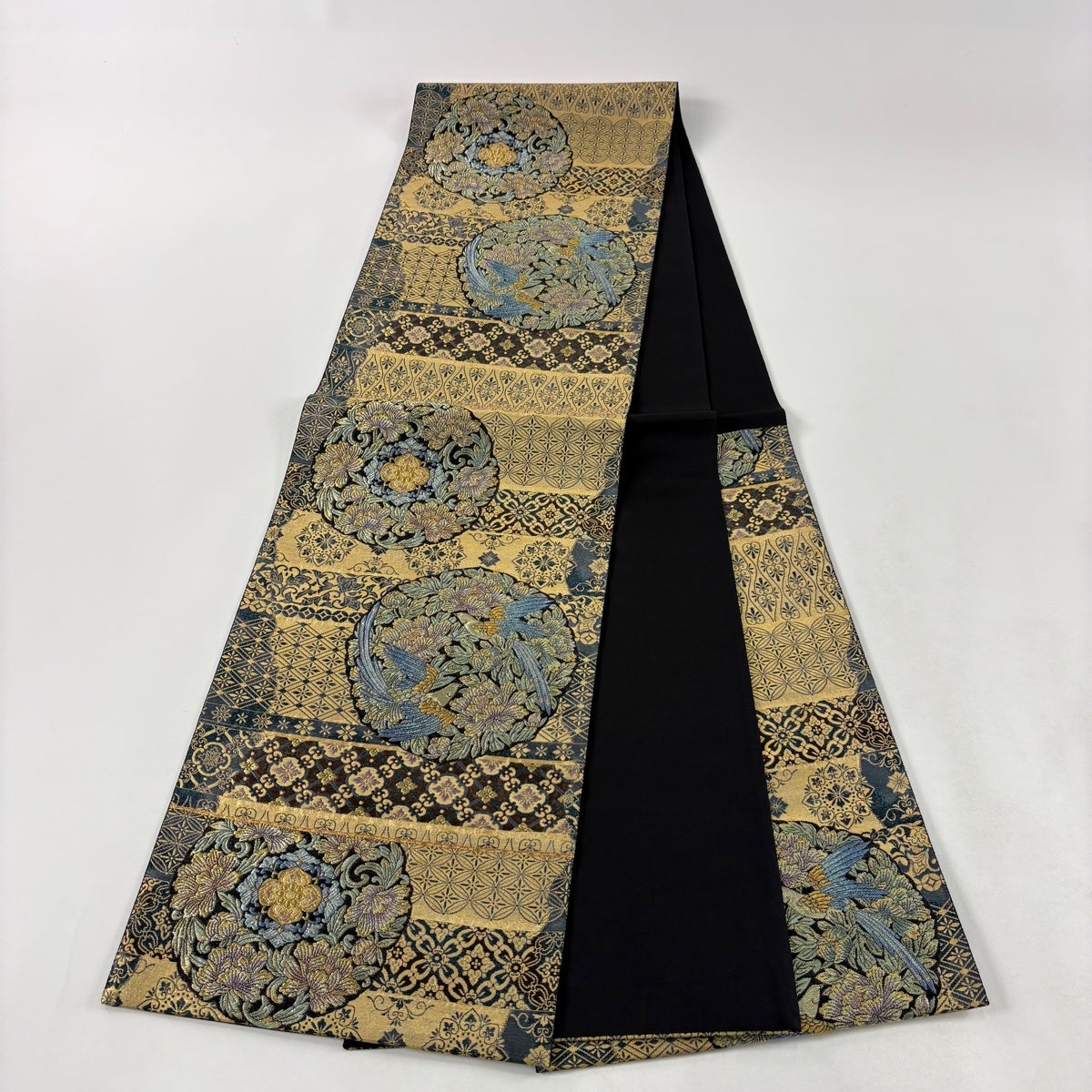 袋帯 名品 落款あり 能州紬 ますいわ屋 リバーシブル 段縞 箔 黒 お太鼓柄 正絹