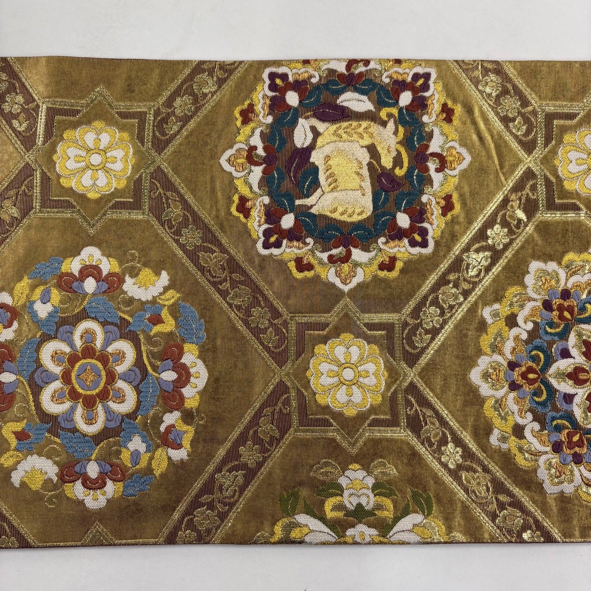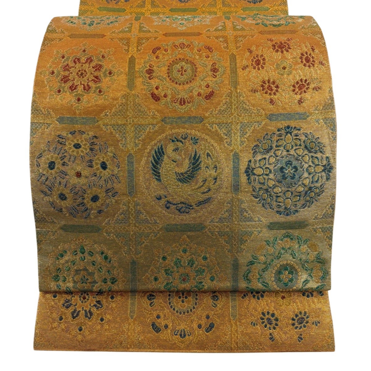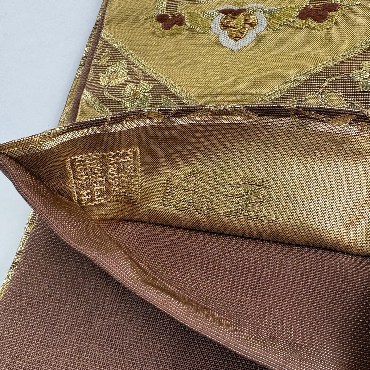 袋帯 秀品 落款あり 風薫 本金青銅箔 華文 動物 唐織 箔 金色 六通 正絹