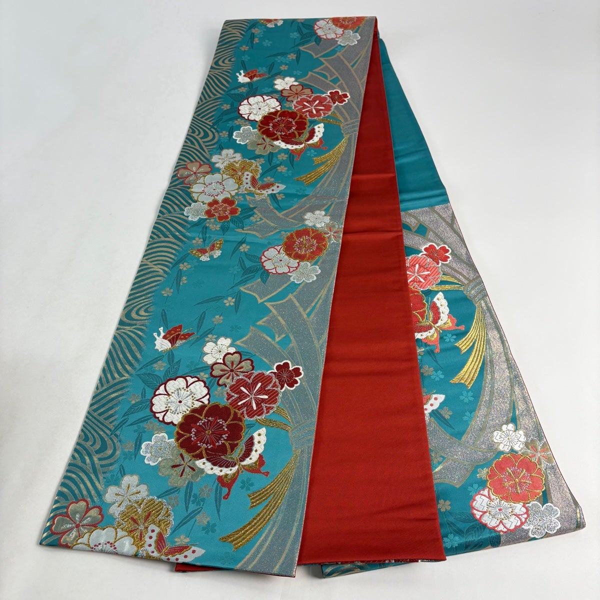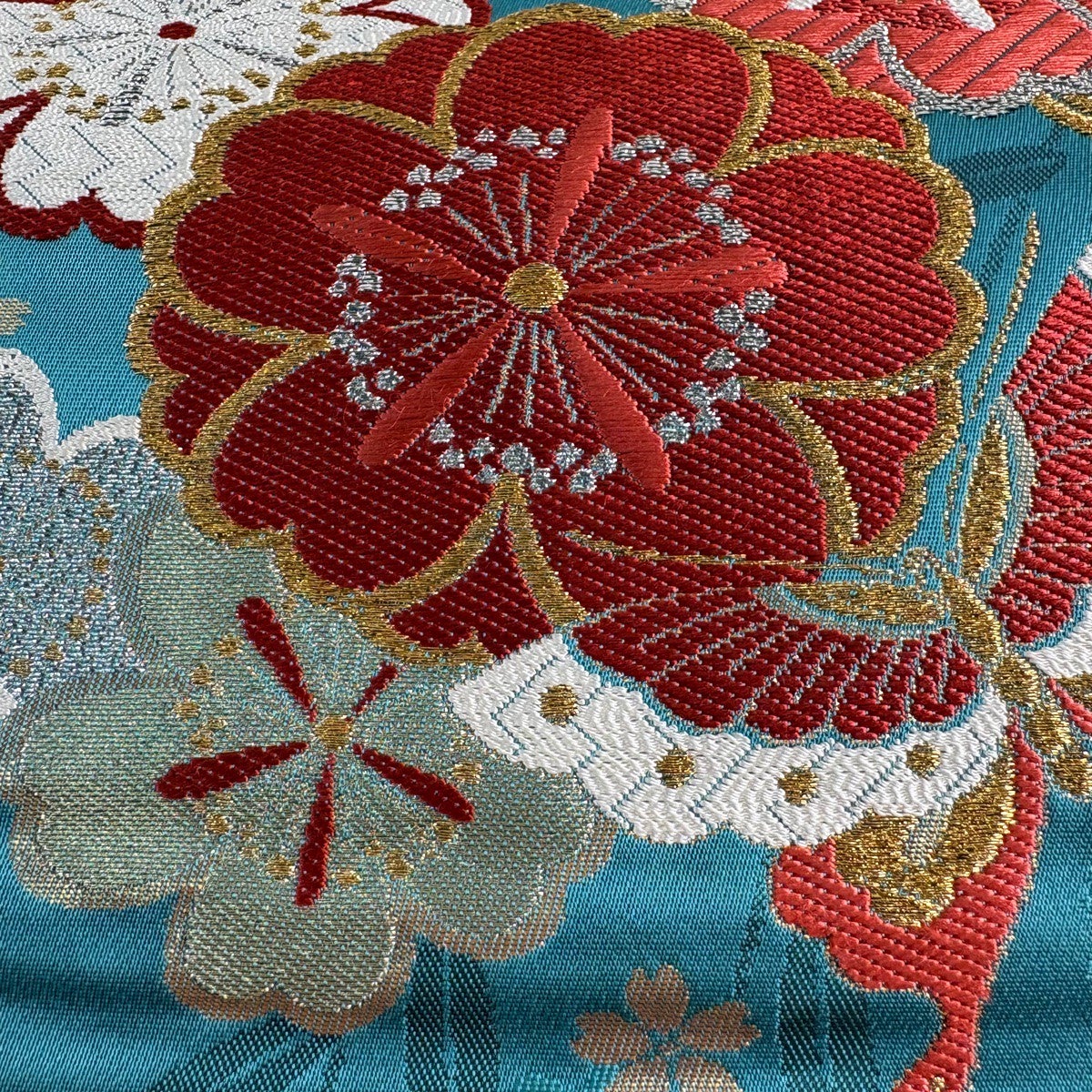 袋帯 秀品 蝶 桜 金糸 箔 青緑 六通 正絹