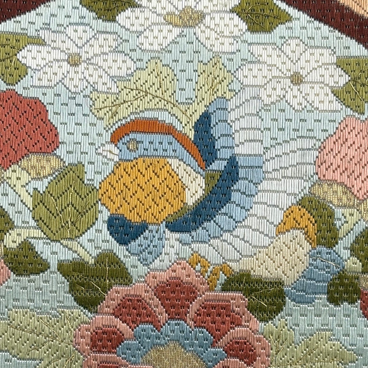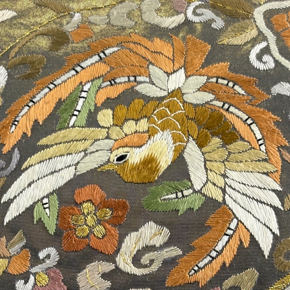 袋帯 秀品 鳥 葉 金銀彩 刺繍 ベージュ お太鼓柄 正絹