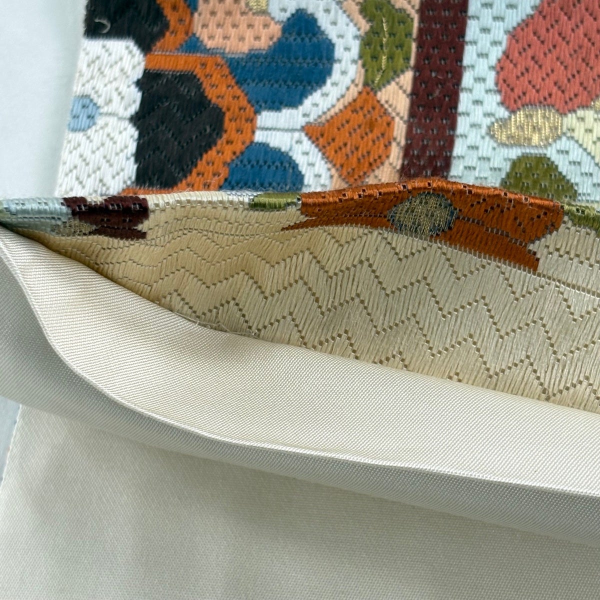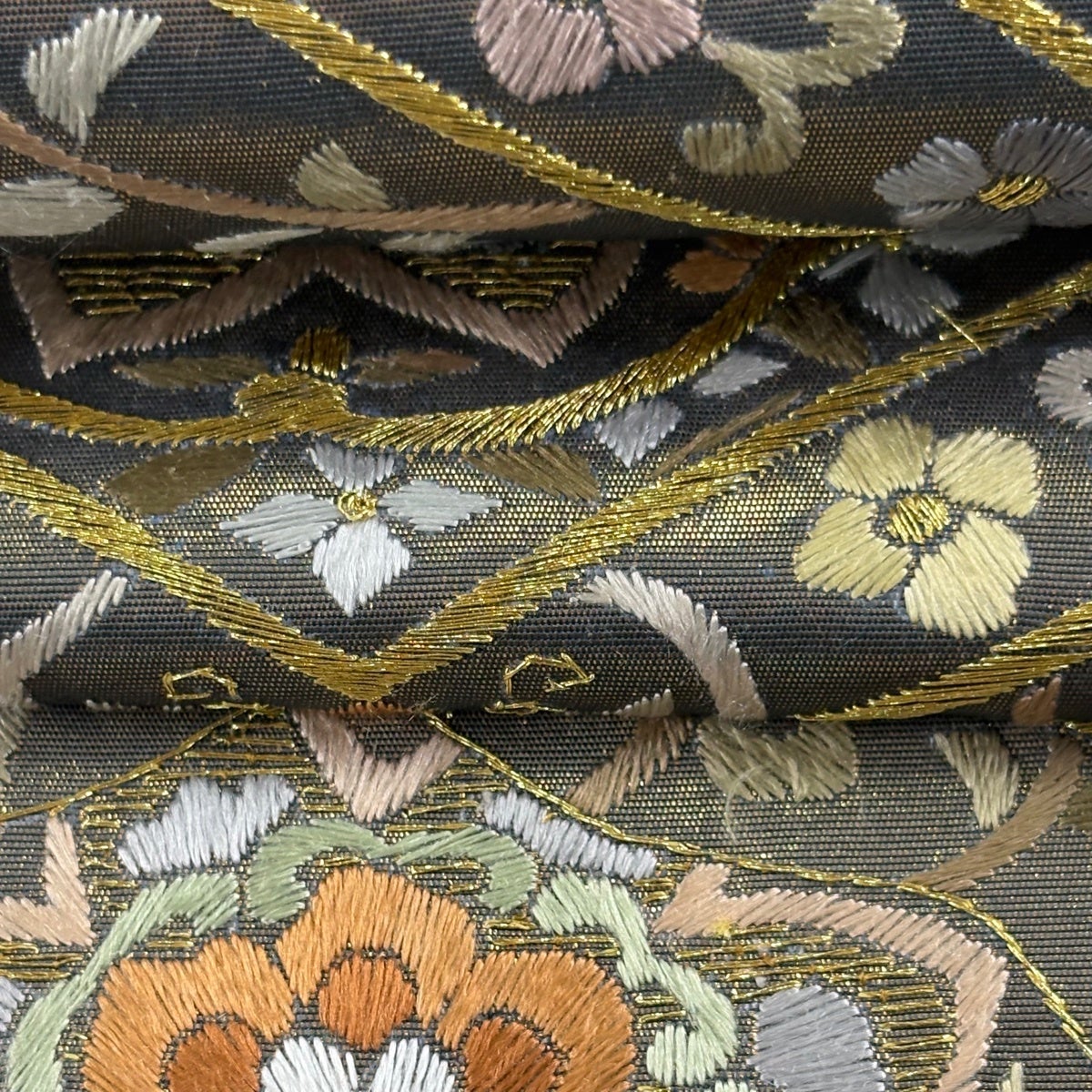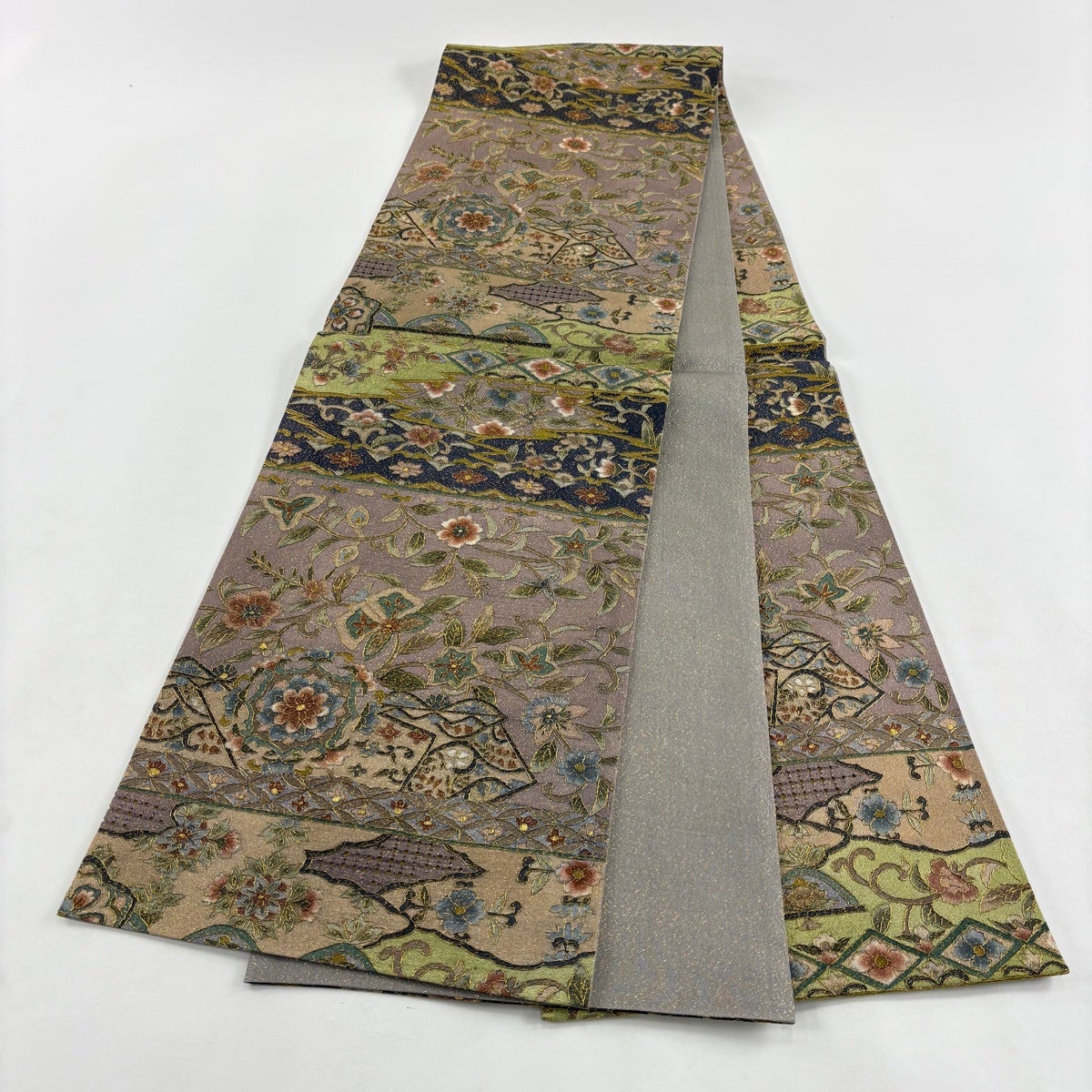 袋帯 秀品 短冊 草花 金銀糸 刺繍 茶色 お太鼓柄 正絹