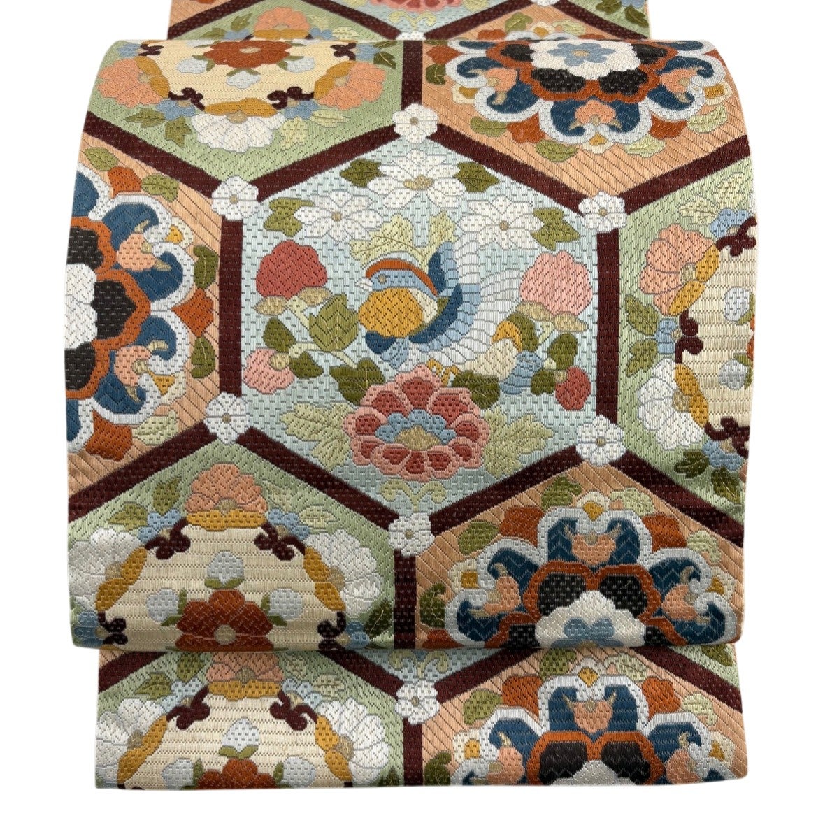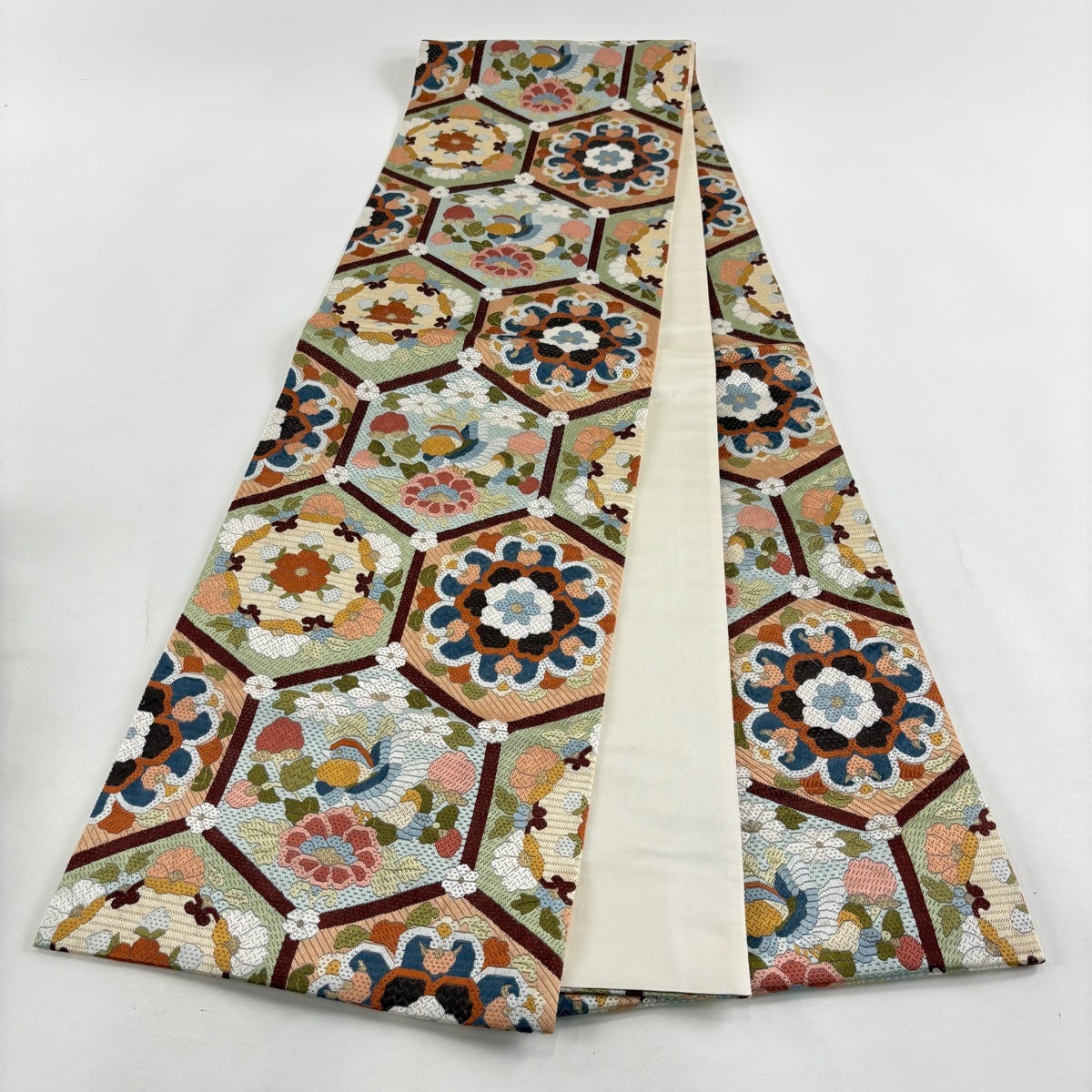 袋帯 秀品 桜 網目文 金彩 灰緑 六通 正絹