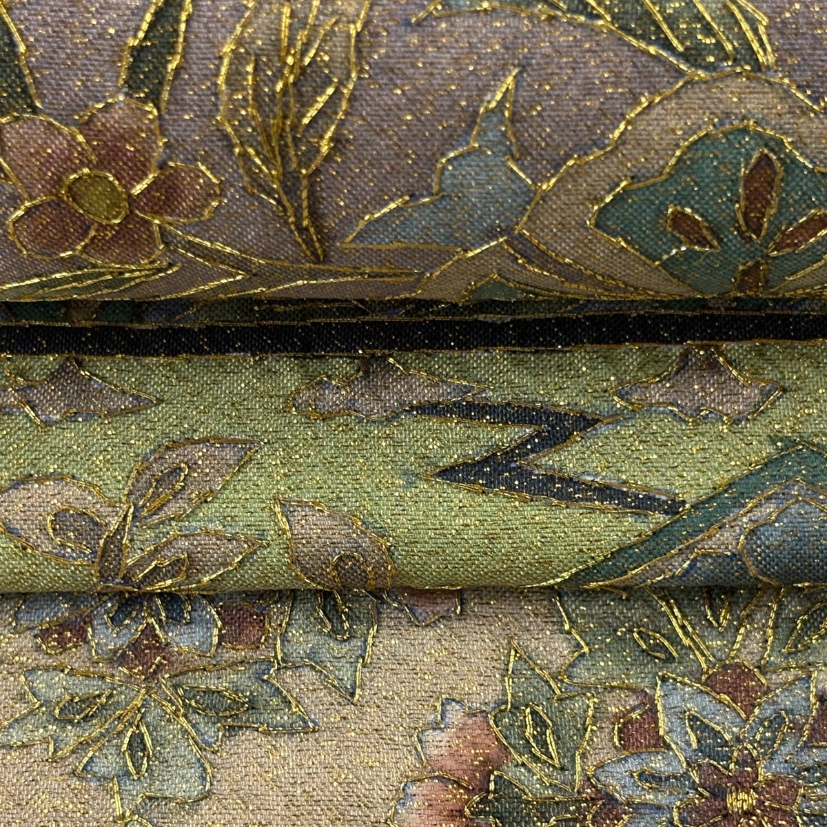 袋帯 秀品 菊 葡萄 金糸 箔 抹茶色 六通 正絹