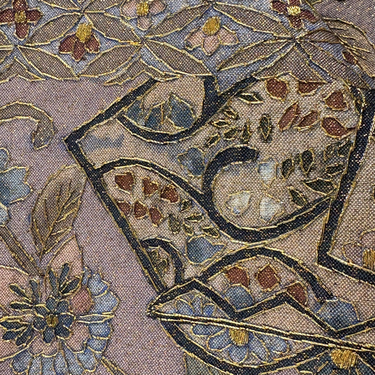 名古屋帯 秀品 椿 貝合わせ 金彩 相良刺繍 灰紫 正絹
