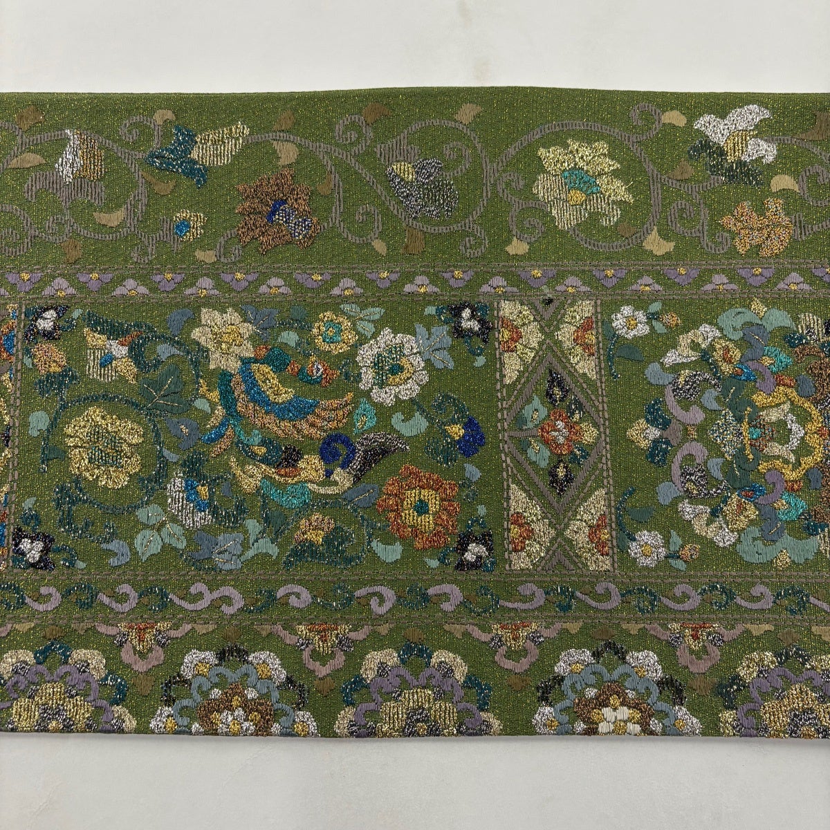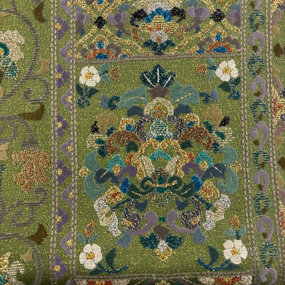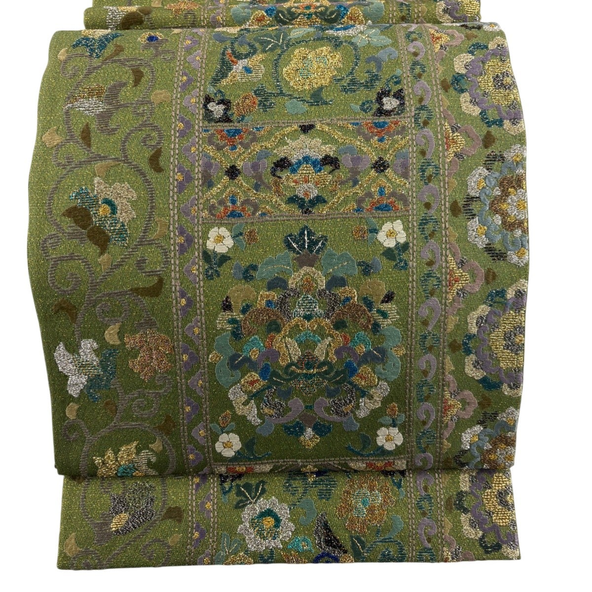 袋帯 秀品 鳳凰 華唐草 箔 鶯色 六通 正絹