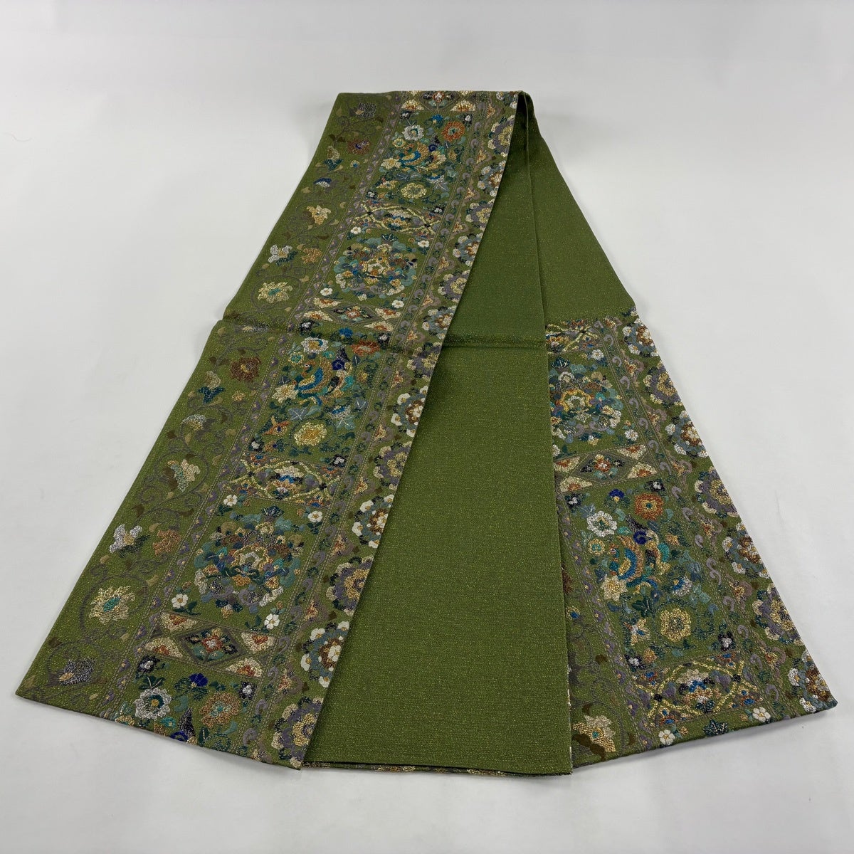 50%OFF 袋帯 秀品 草花 金銀糸 箔 緑 六通 正絹 K50