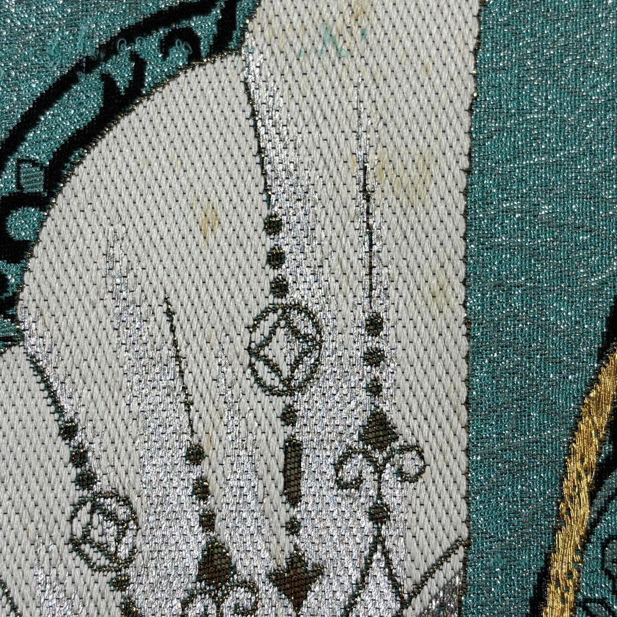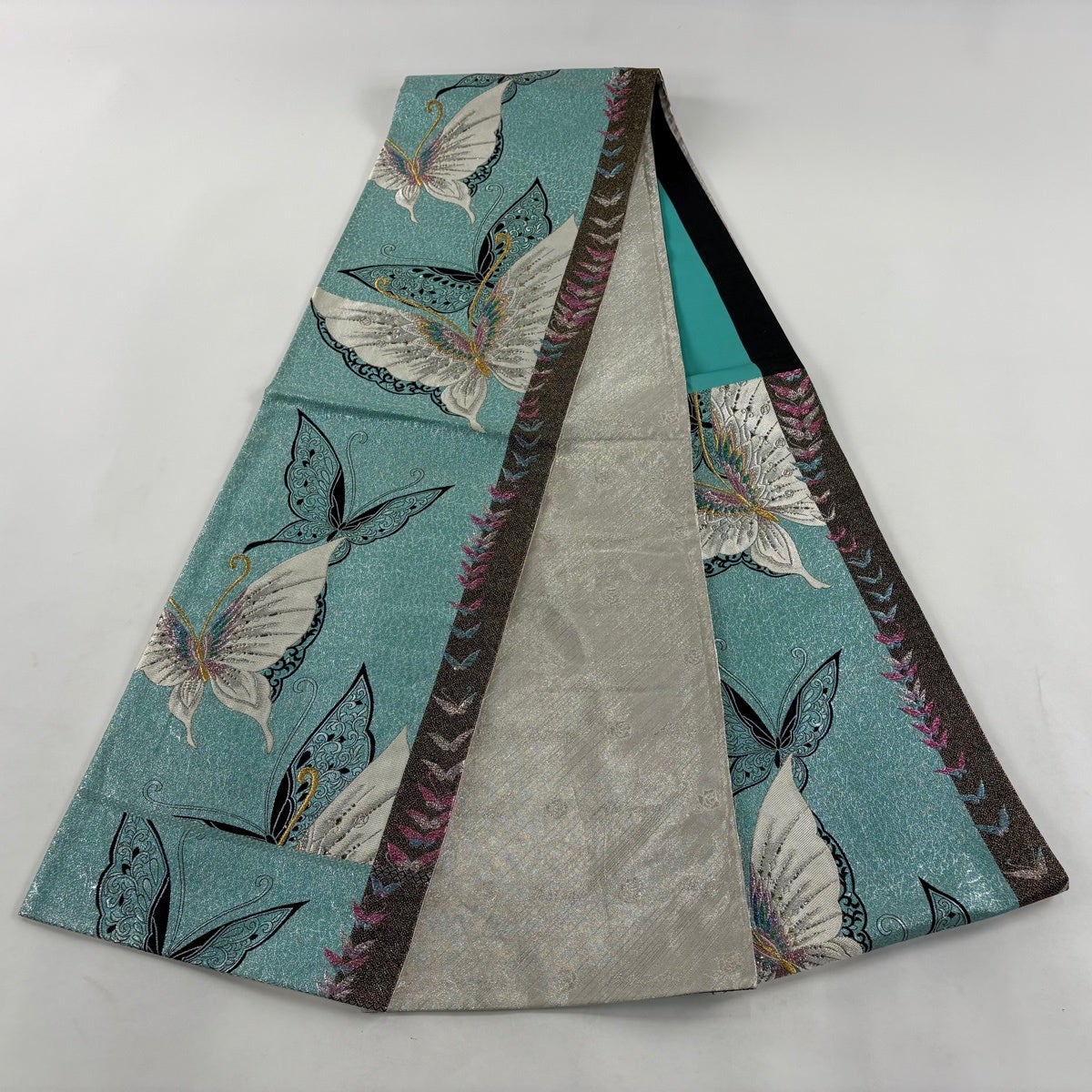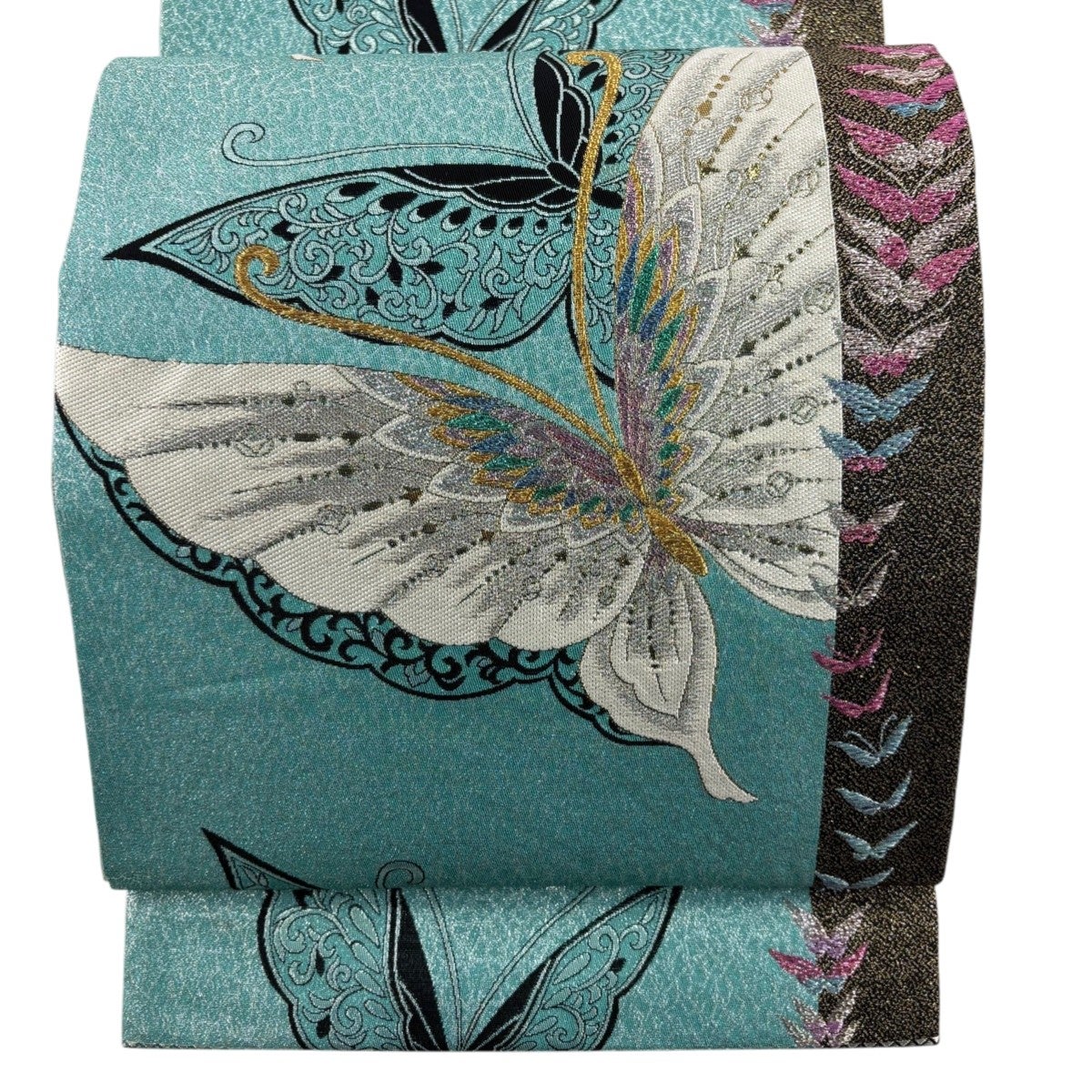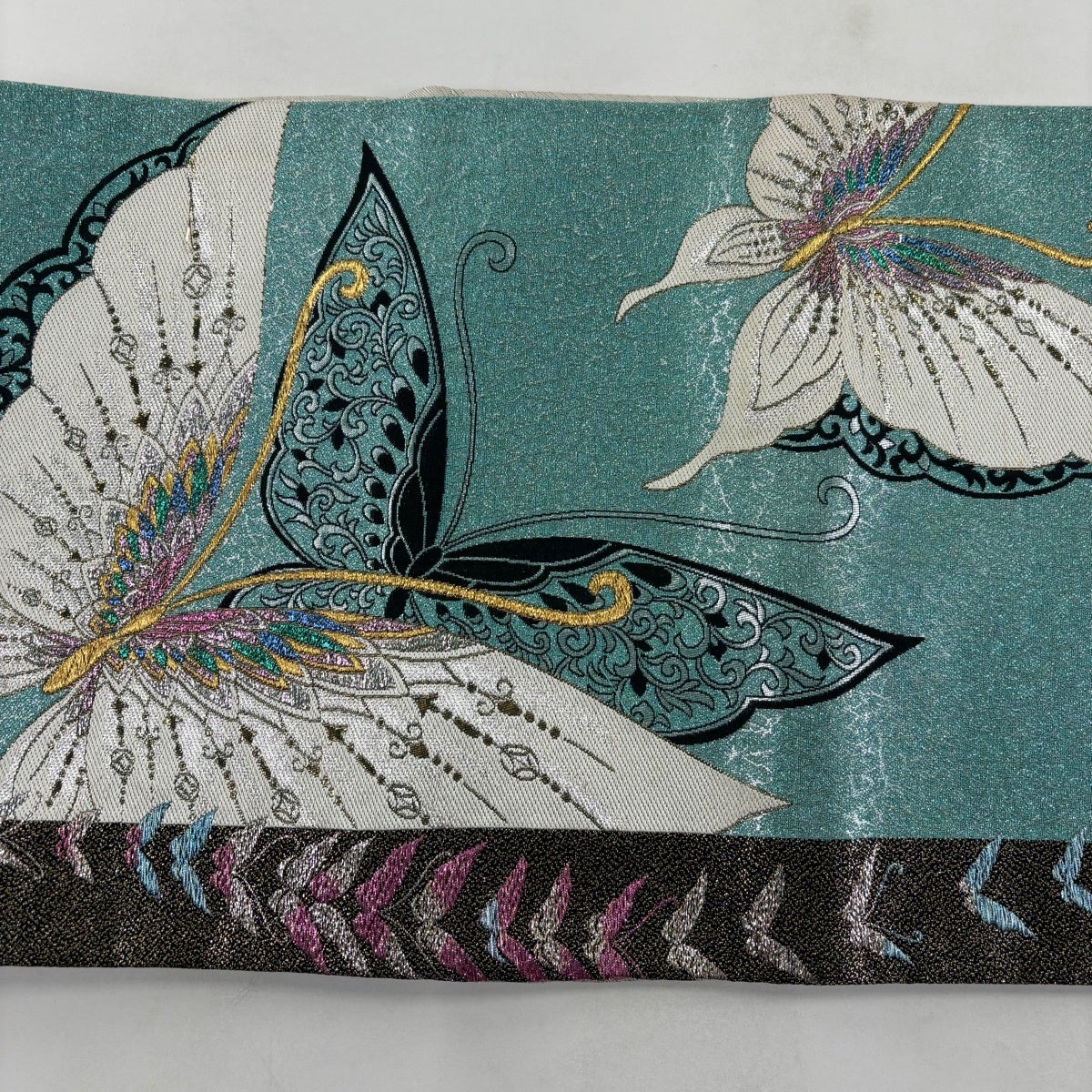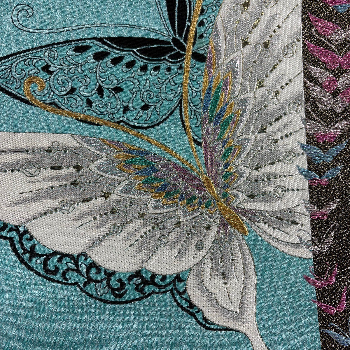 袋帯 秀品 関西仕立て 振袖向き 蝶 唐草 金銀糸 箔 薄青緑 六通 正絹