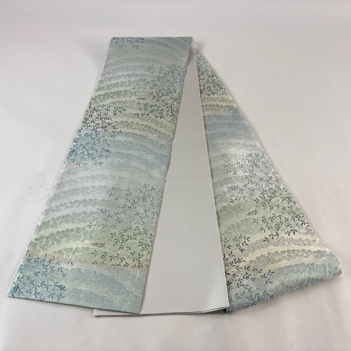 袋帯 秀品 落款あり 枝葉 金彩 銀糸 水色 お太鼓柄 正絹