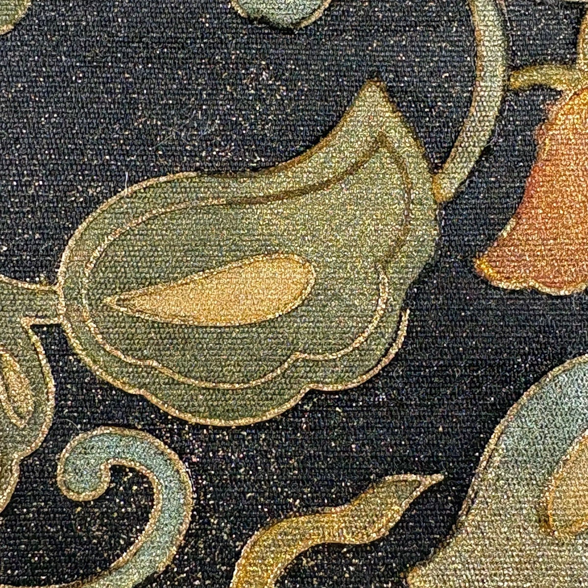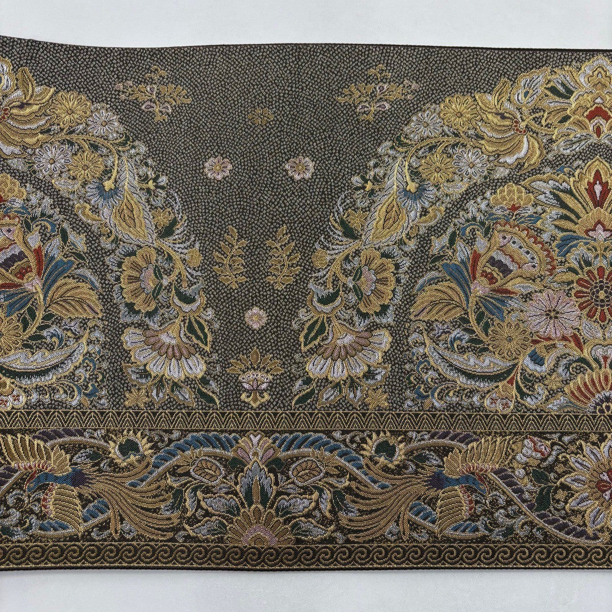 【美品】 袋帯 秀品 華文 花唐草 銀糸 箔 黒灰 六通 正絹