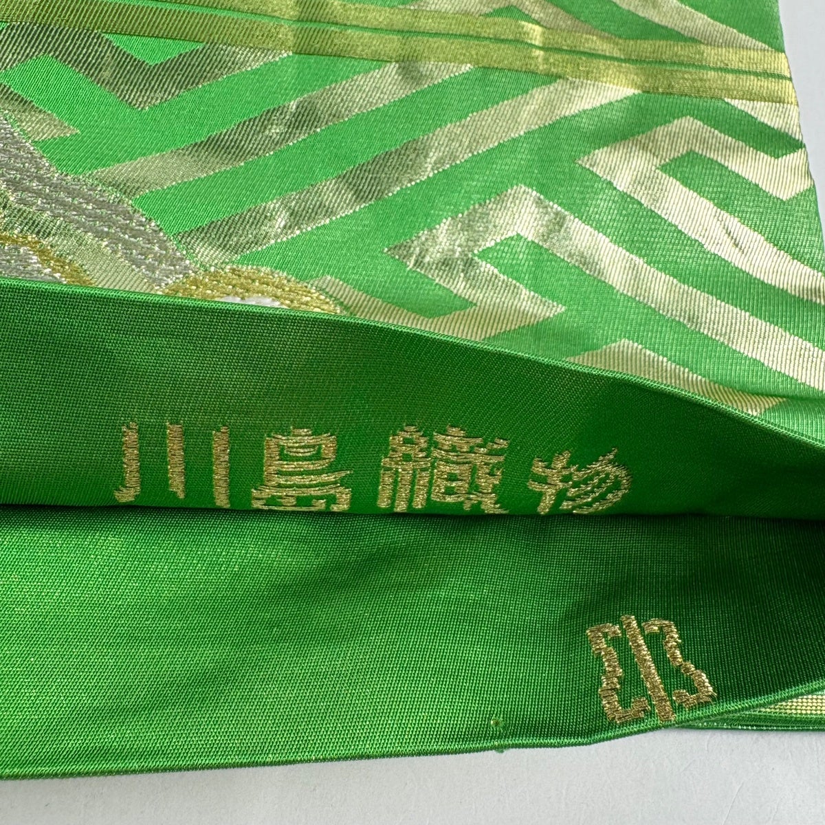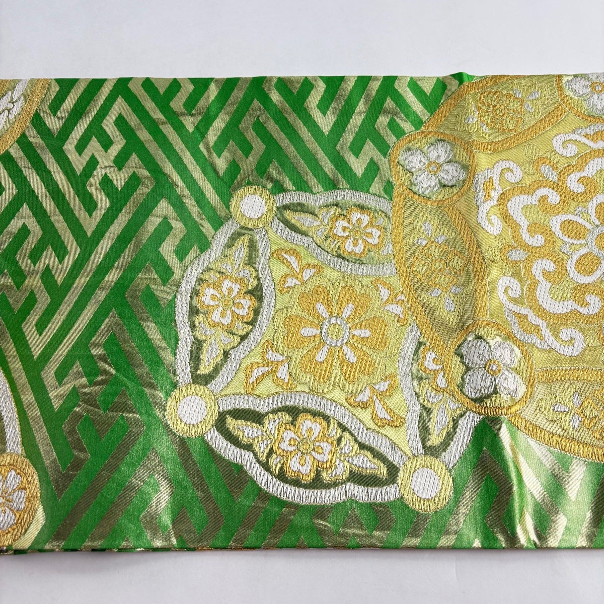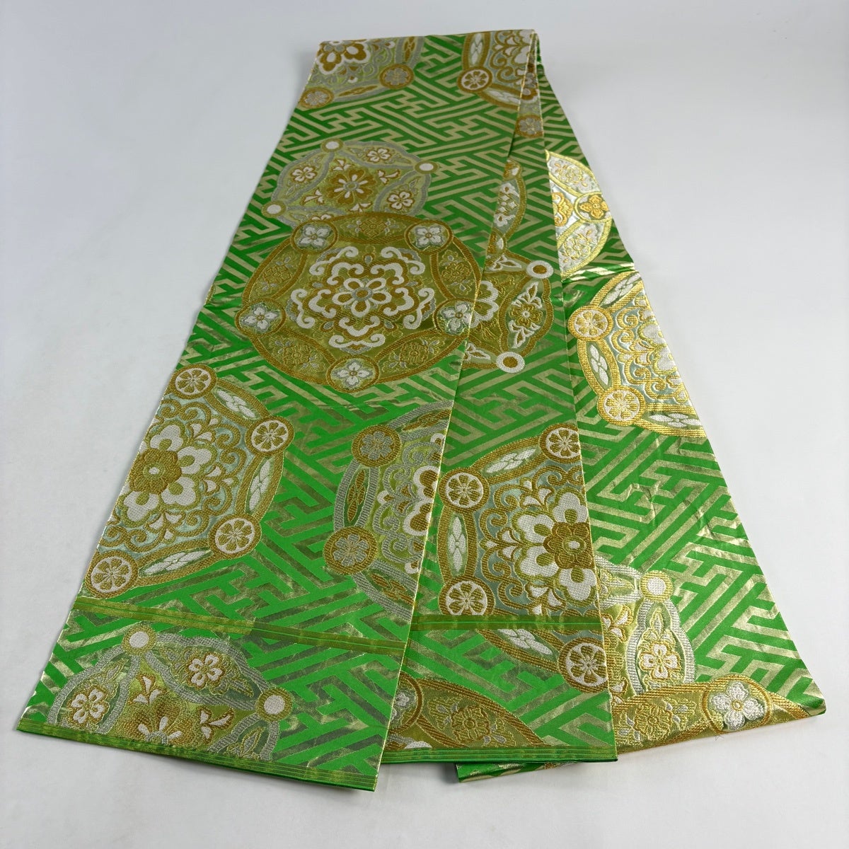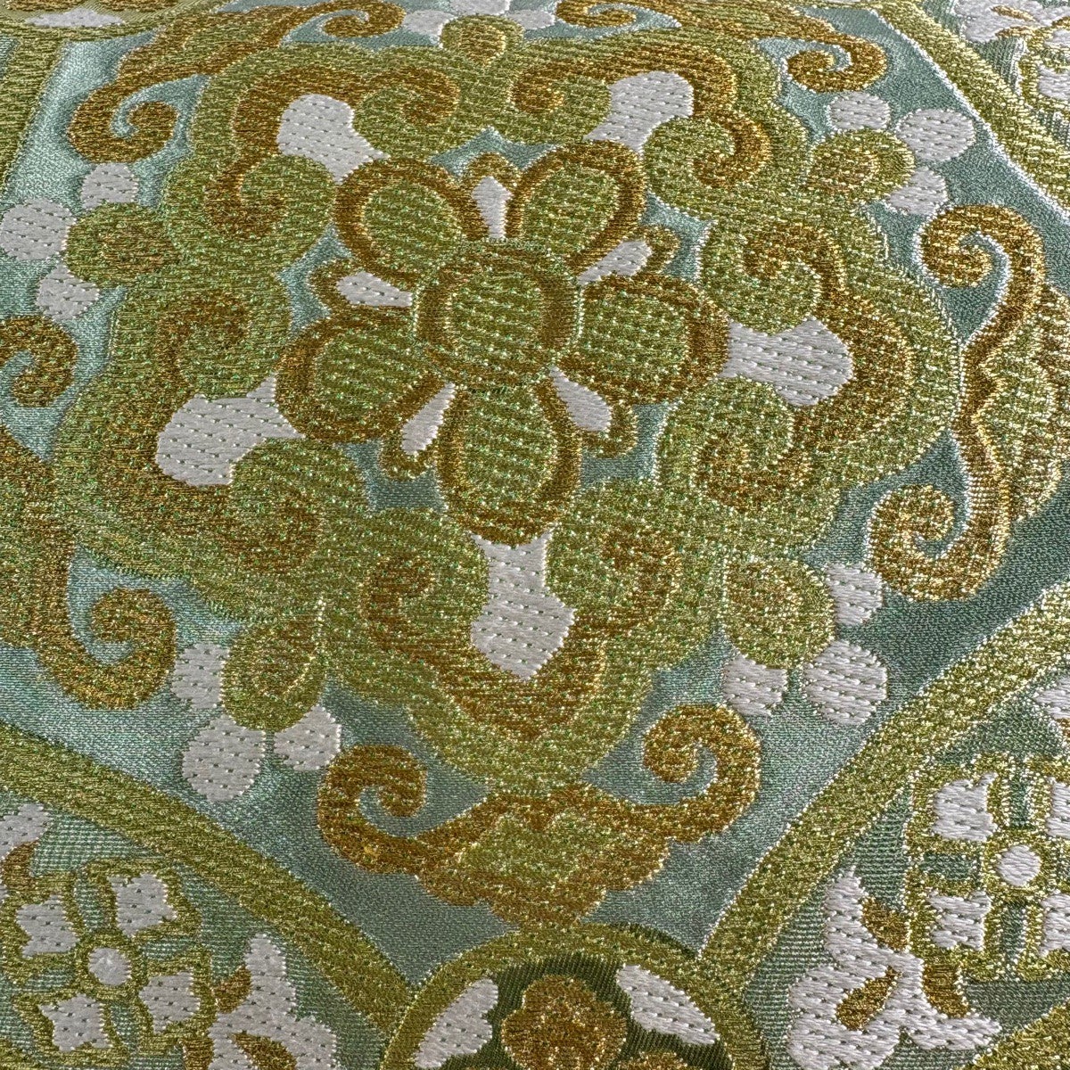 【美品】 袋帯 秀品 関西仕立て 花菱 薄緑 全通 正絹