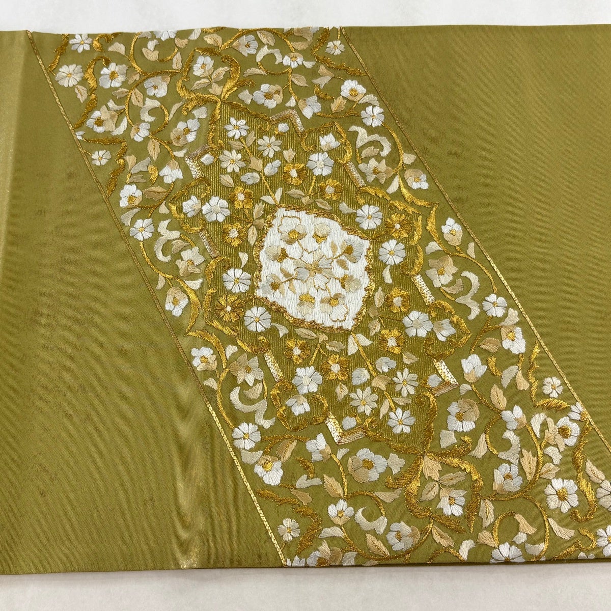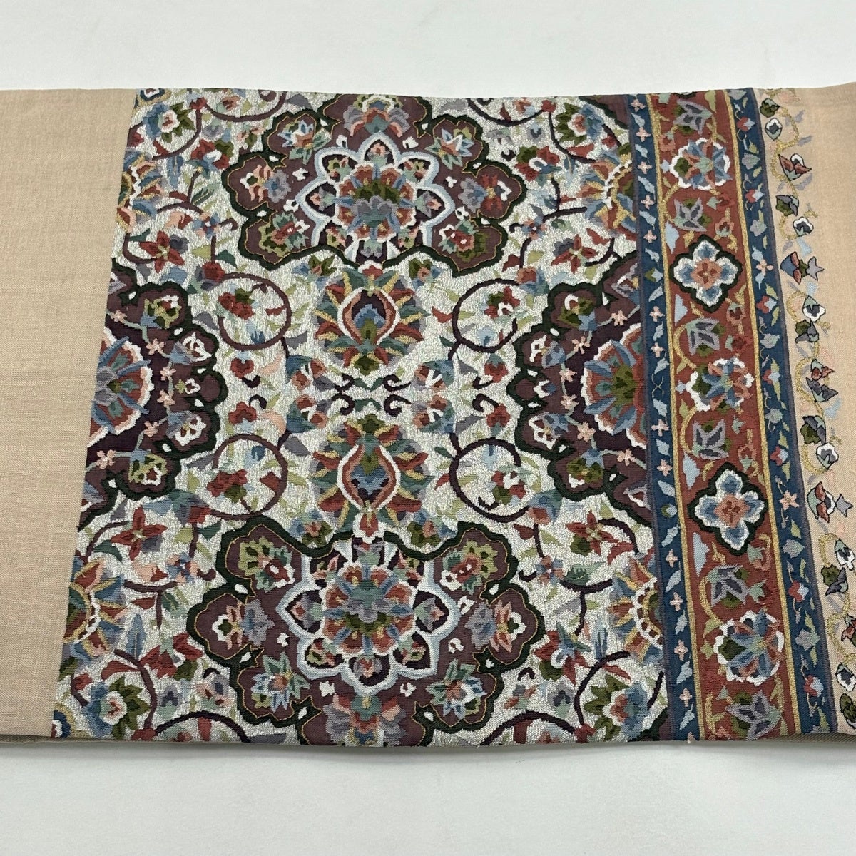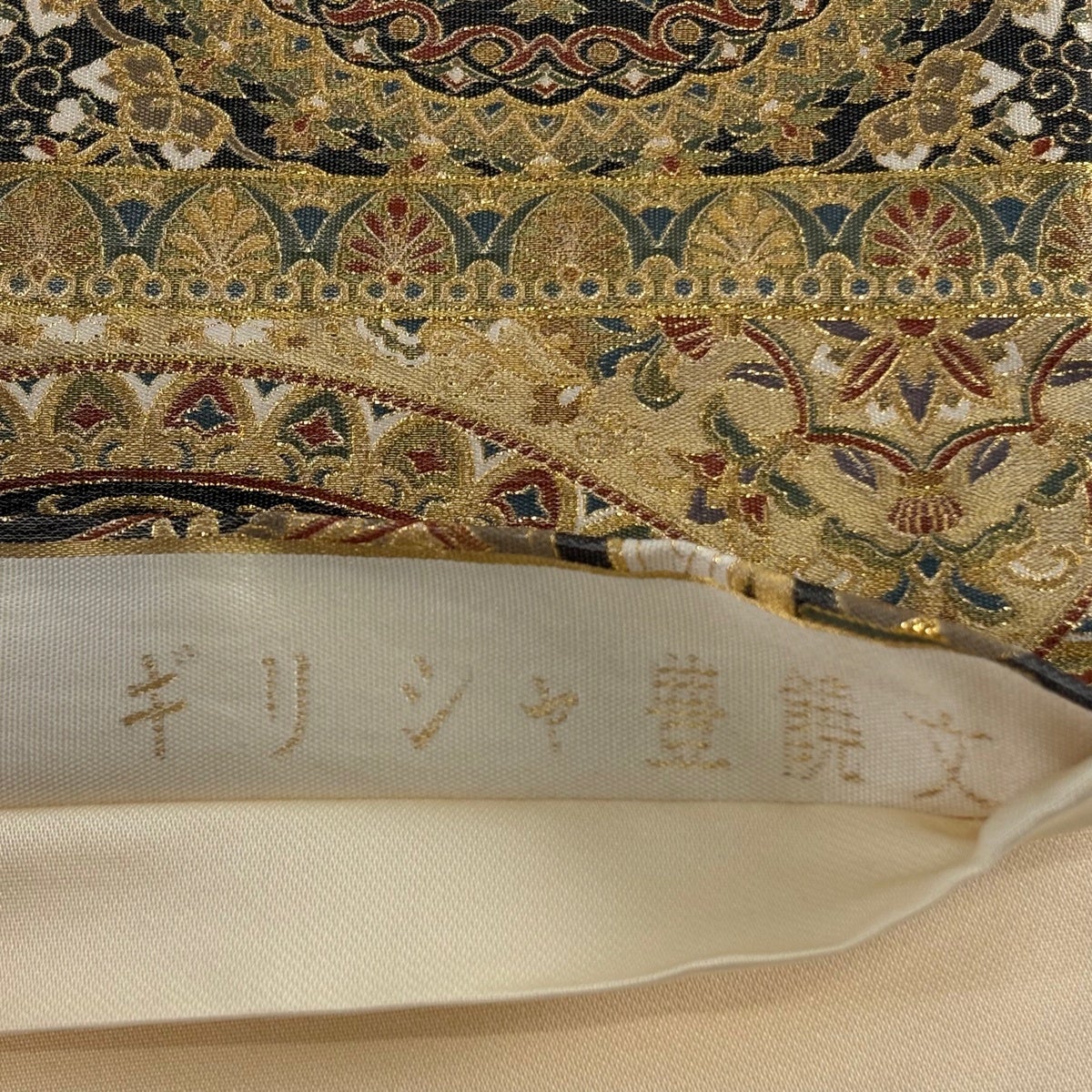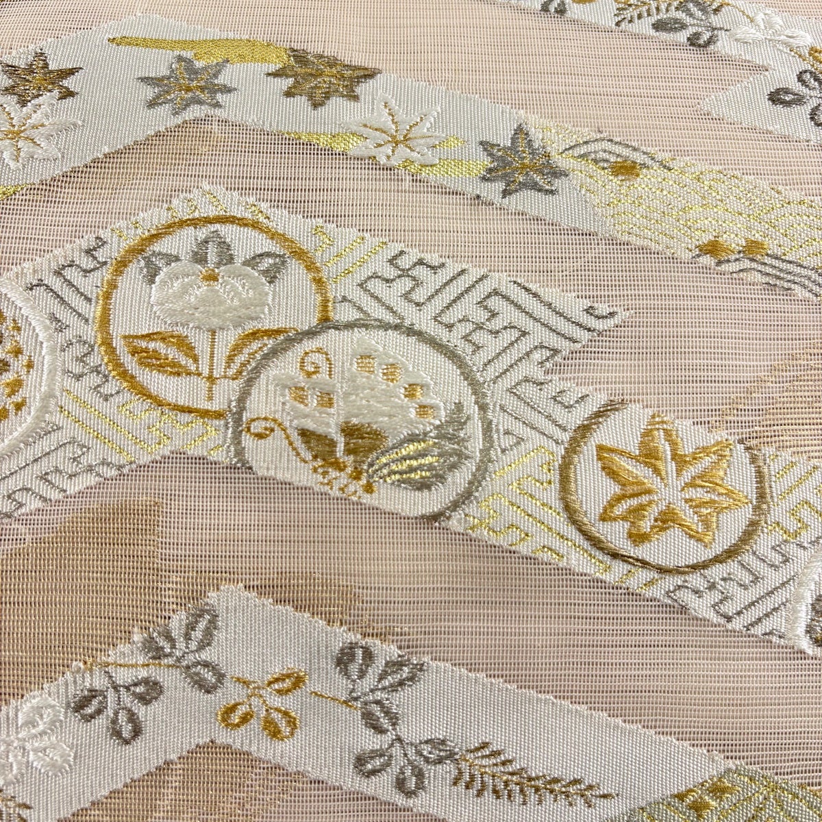 袋帯 逸品 華文 花唐草 刺繍 金糸 ベージュ 全通 正絹