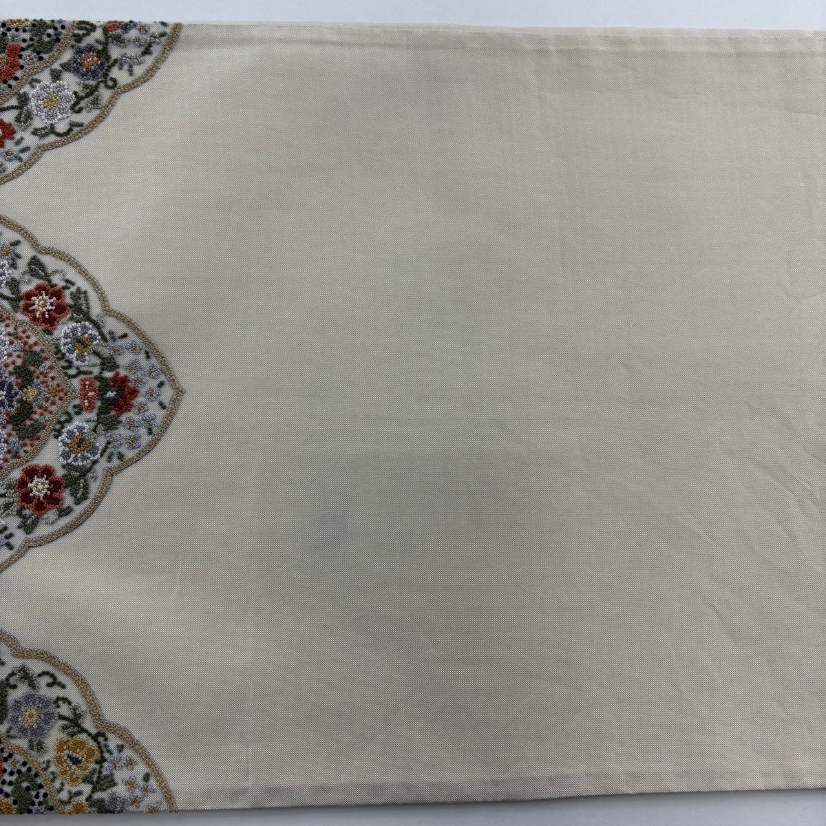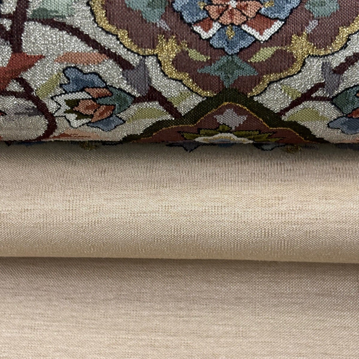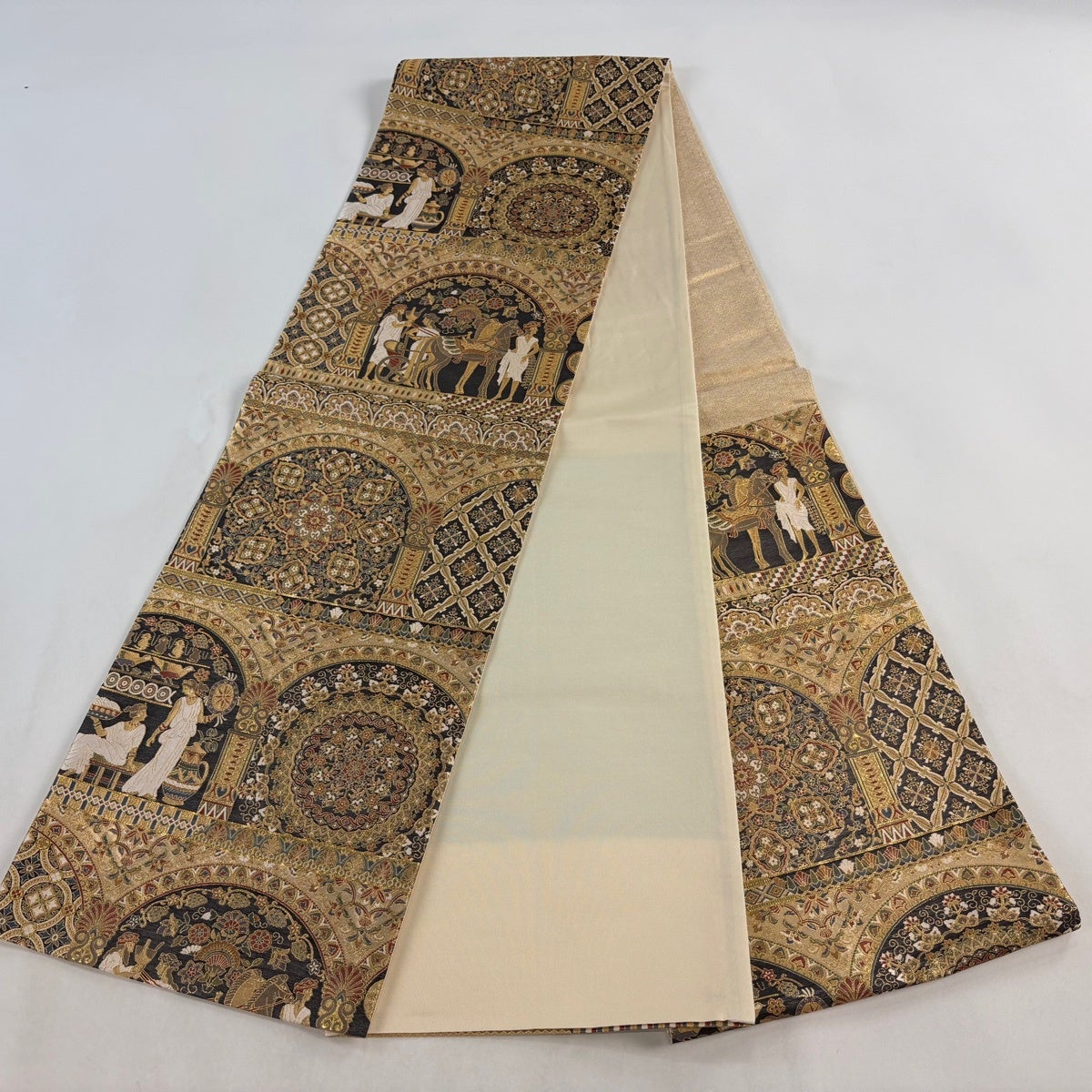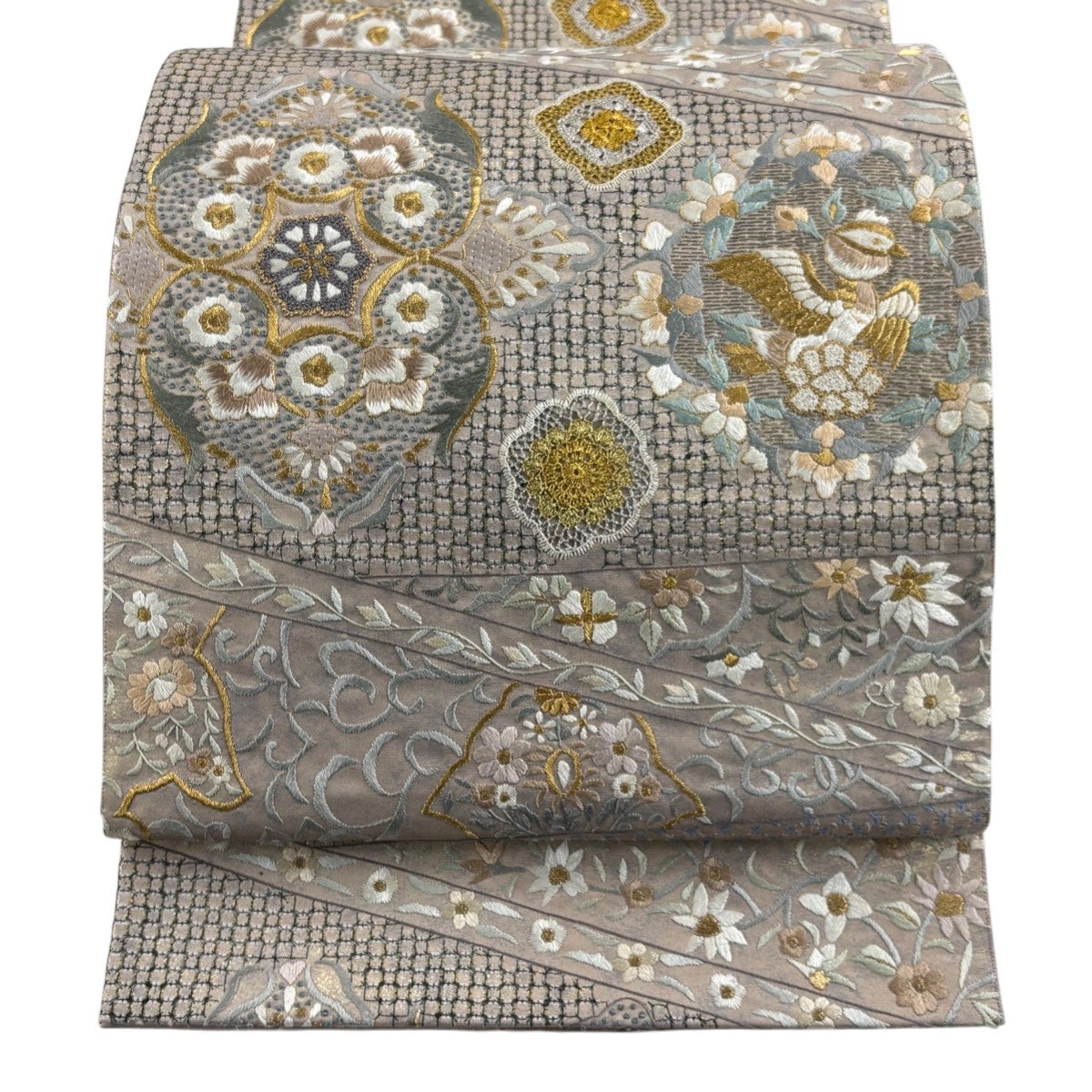 袋帯 逸品 華文 花唐草 刺繍 金糸 ベージュ 全通 正絹