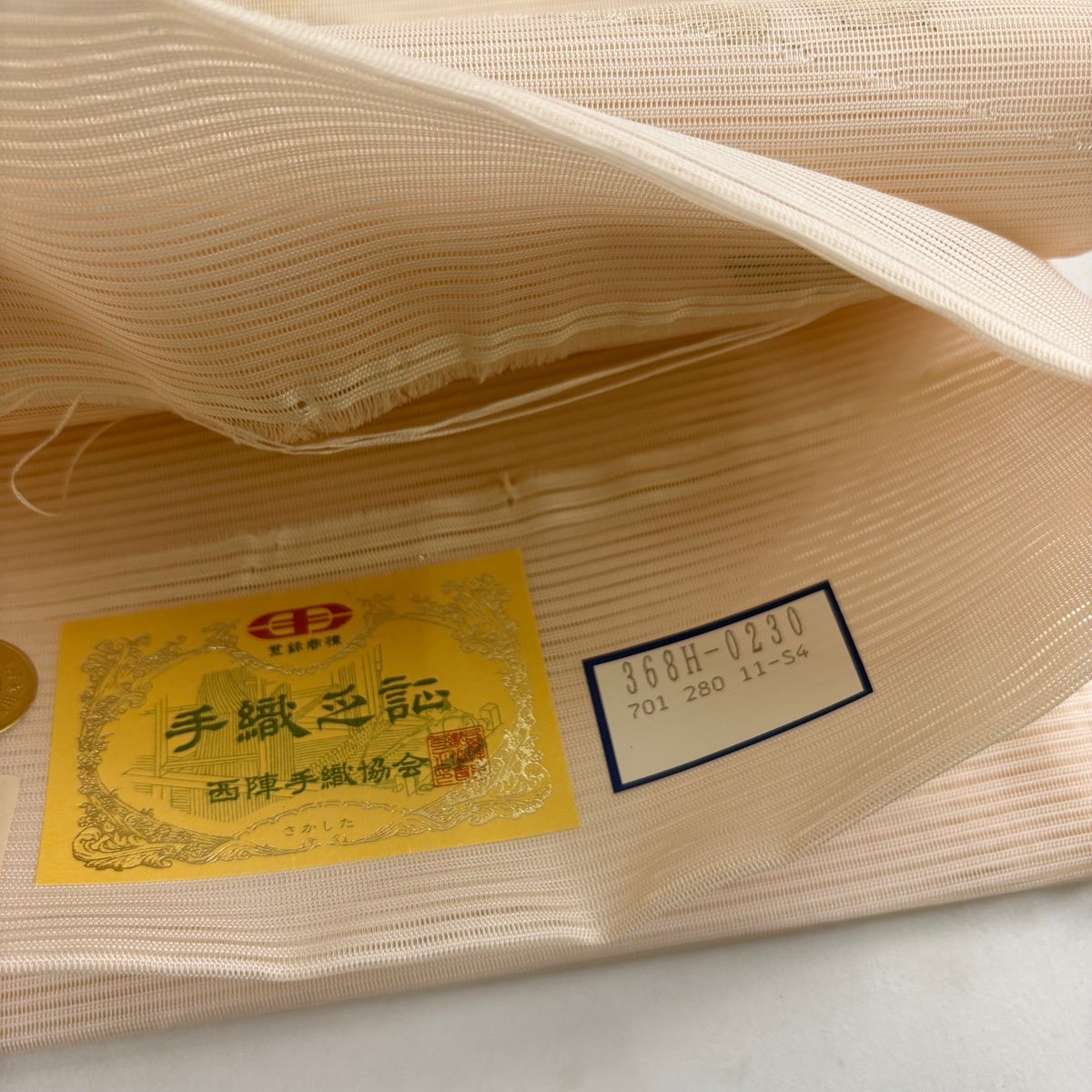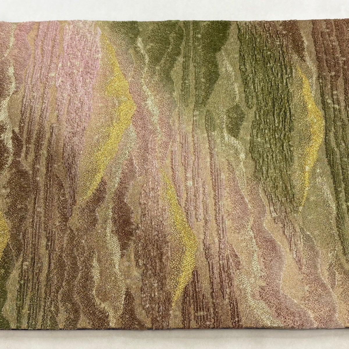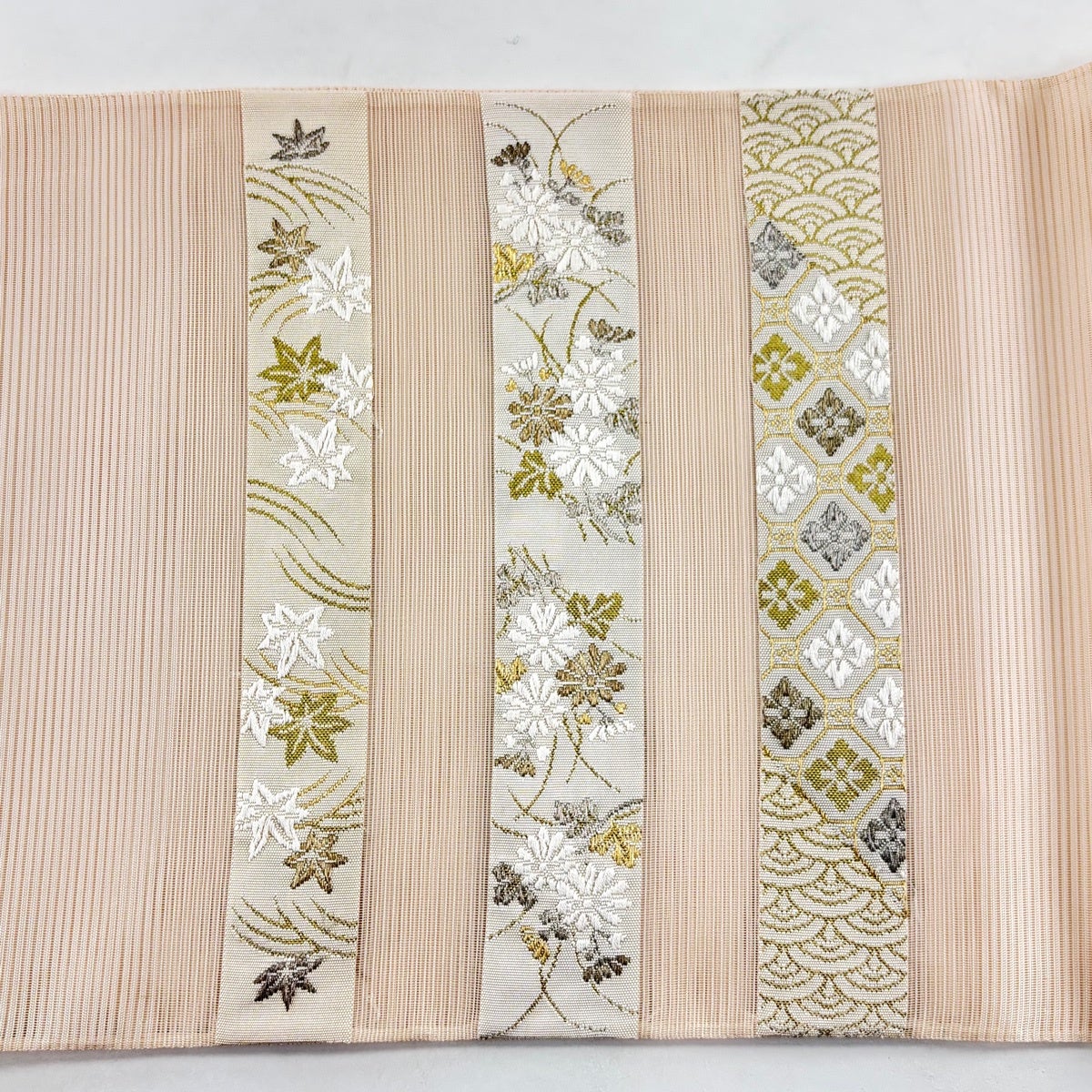 【美品】 袋帯 秀品 織悦 落款あり 夏帯 流水 縞 箔 ベージュ 全通 正絹