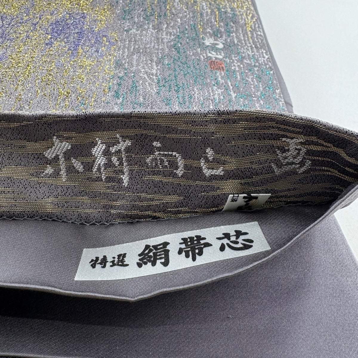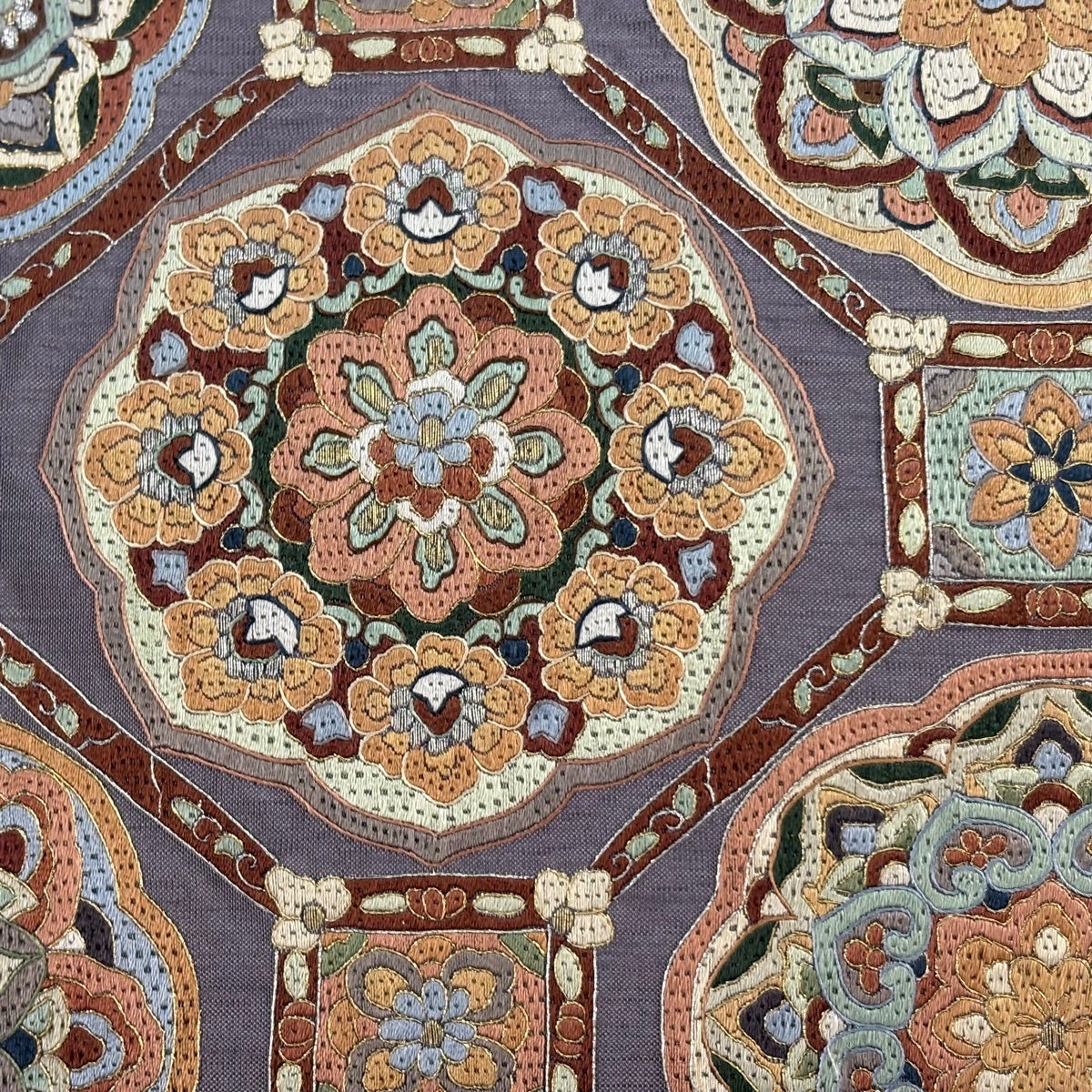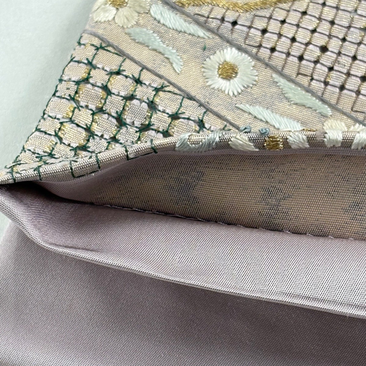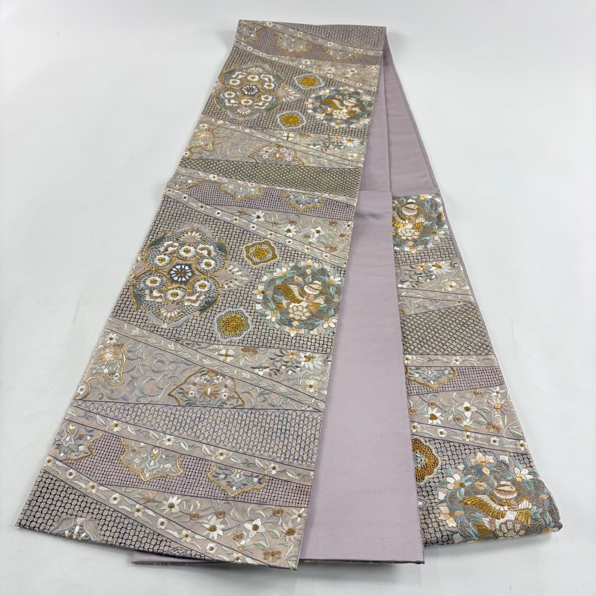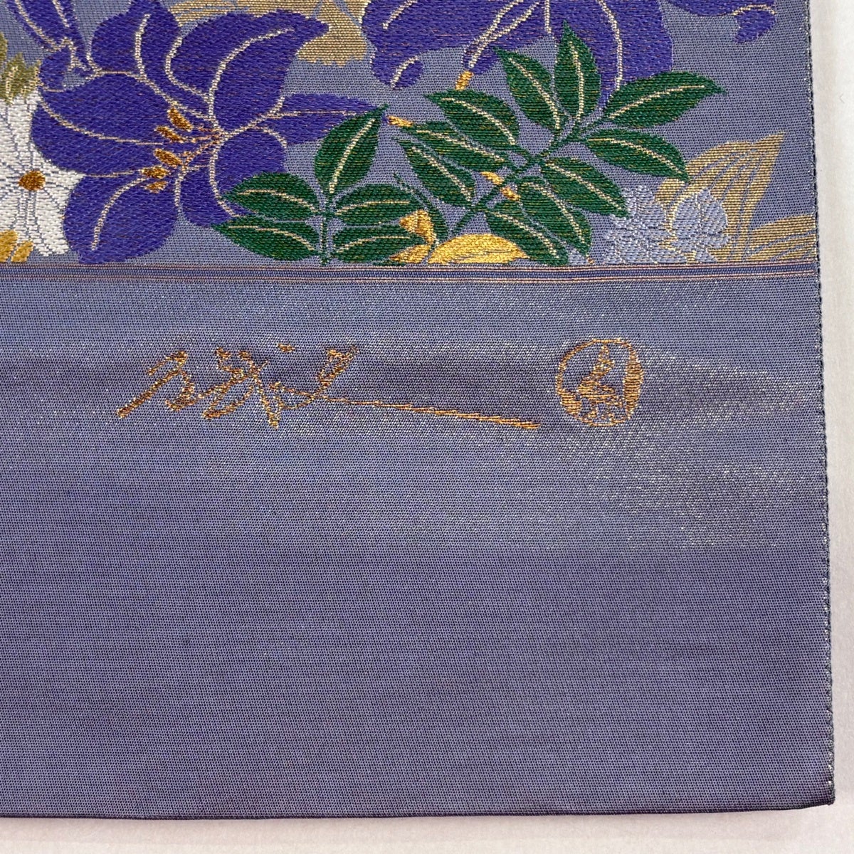 袋帯 秀品 夏帯 草花 金銀糸 刺繍 灰紫 お太鼓柄 正絹