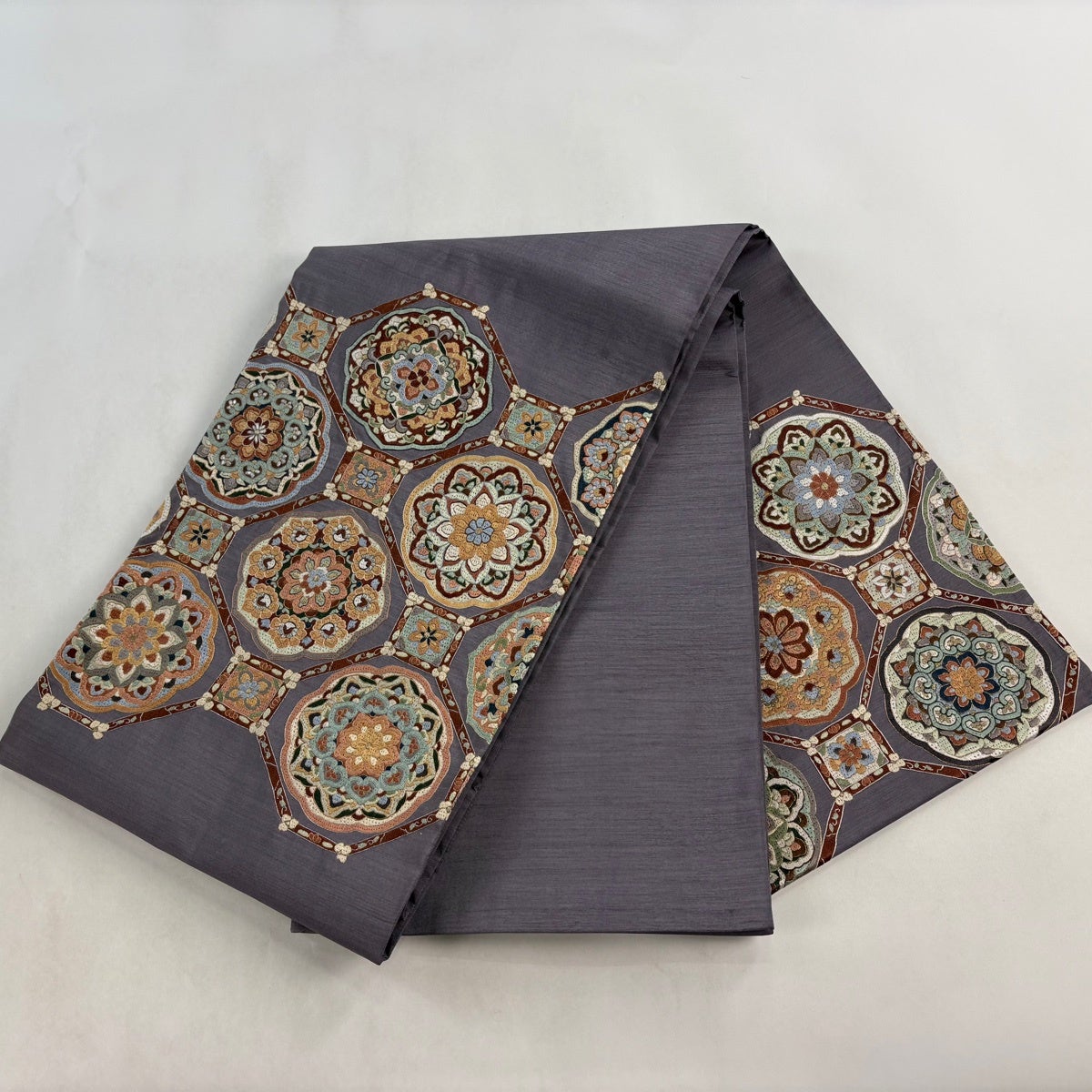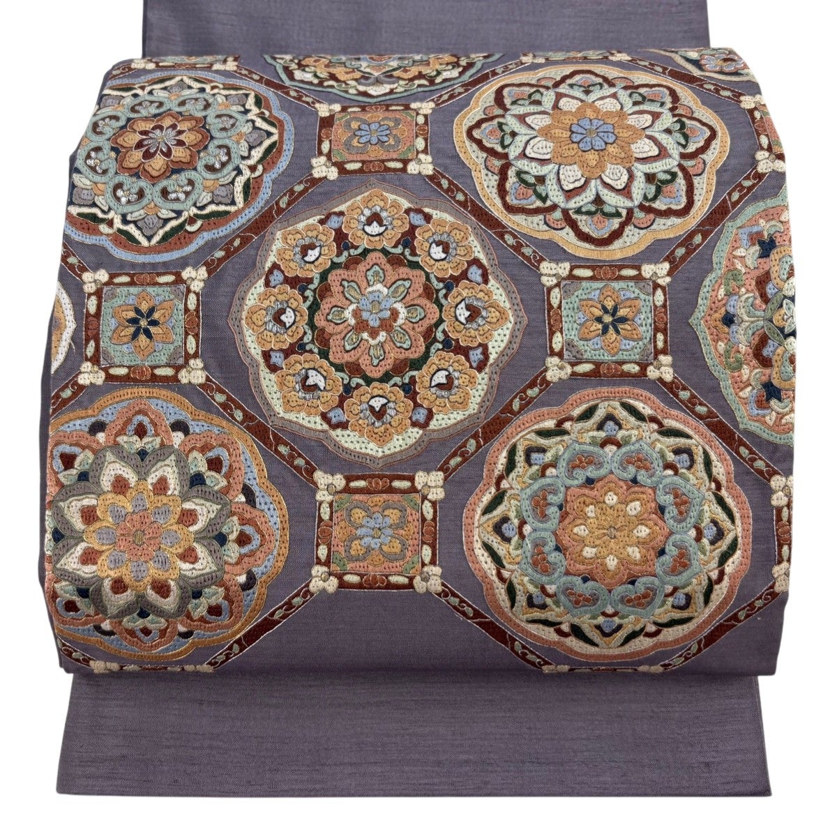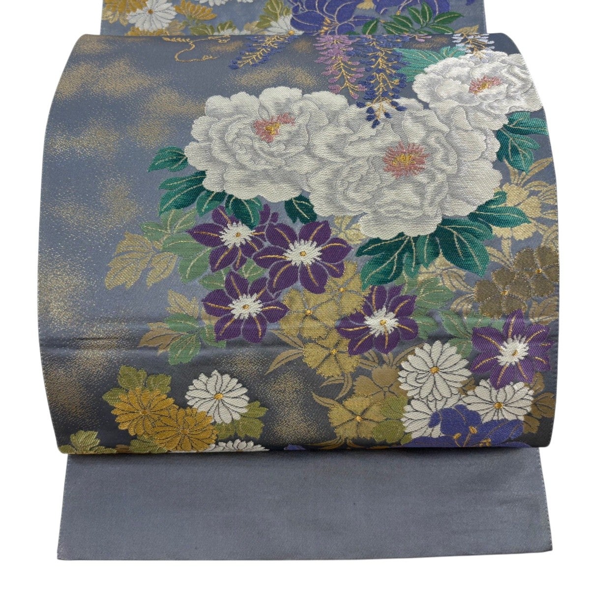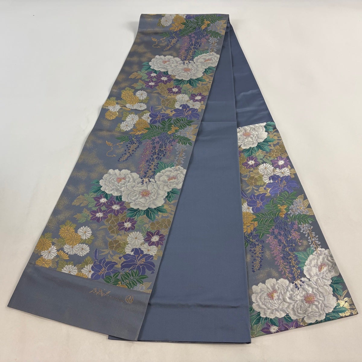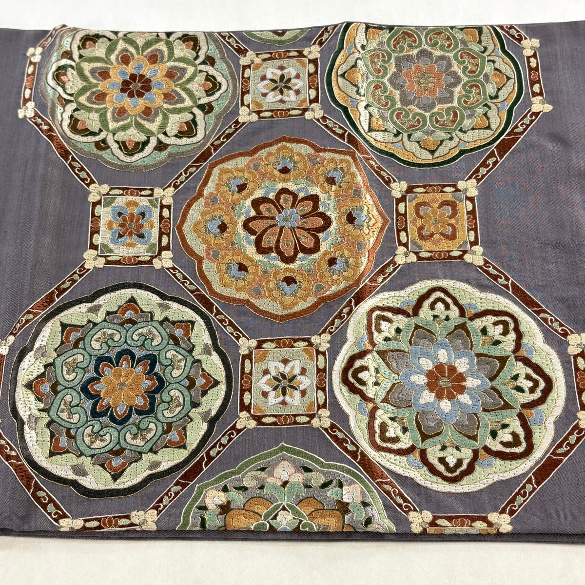 袋帯 秀品 夏帯 草花 金銀糸 刺繍 灰紫 お太鼓柄 正絹
