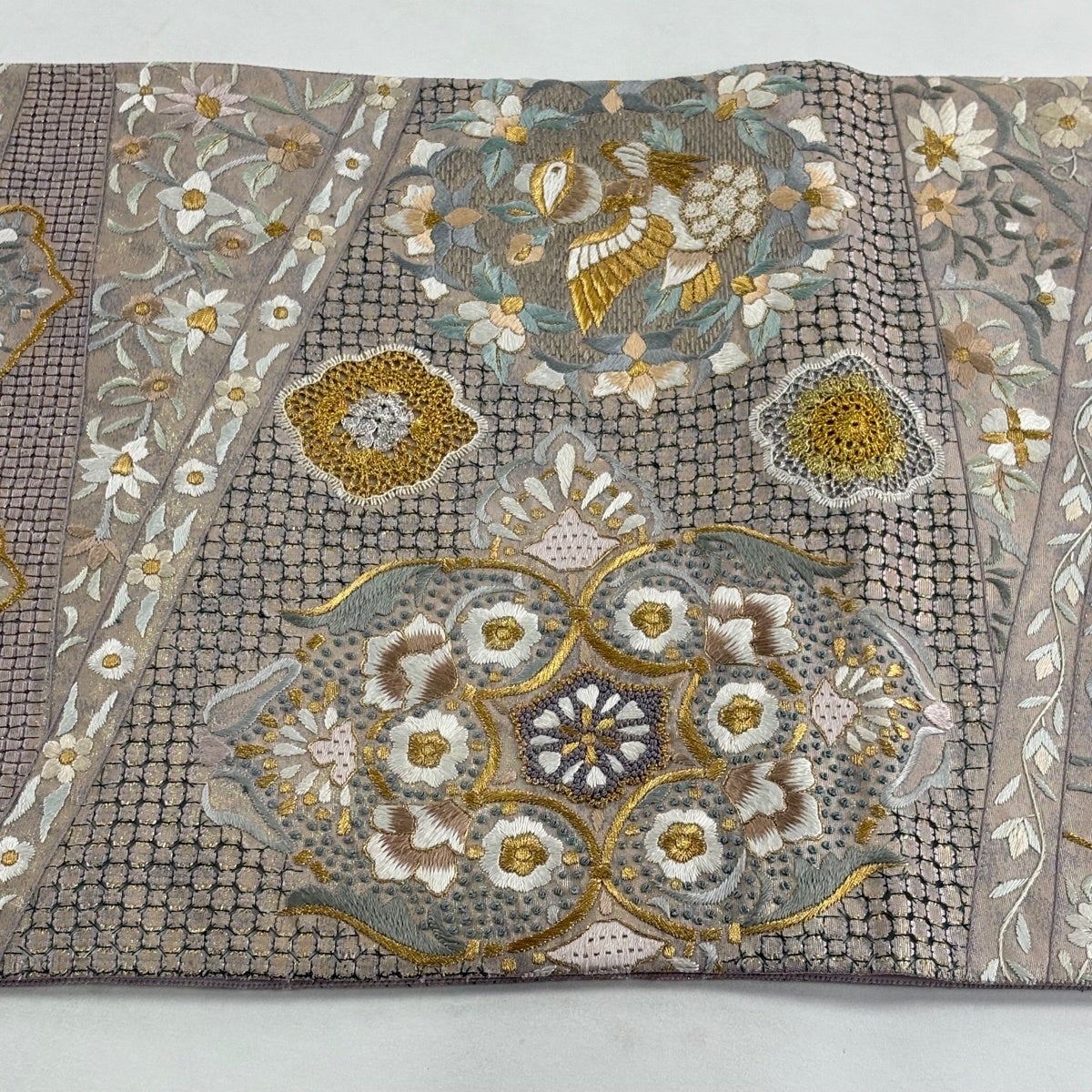 【美品】 袋帯 逸品 華文 鳥 刺繍 金糸 薄紫 六通 正絹