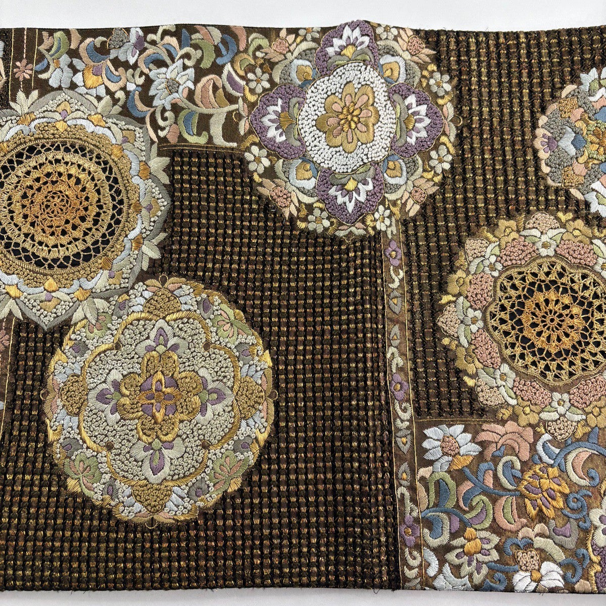 50%OFF 袋帯 逸品 本金箔 草花 相良刺繍 金糸 濃紫 六通 正絹 K50