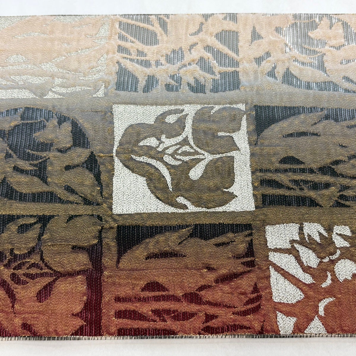 【美品】 袋帯 逸品 曽根武勇 落款あり 草花 幾何学 茶色 お太鼓柄 正絹