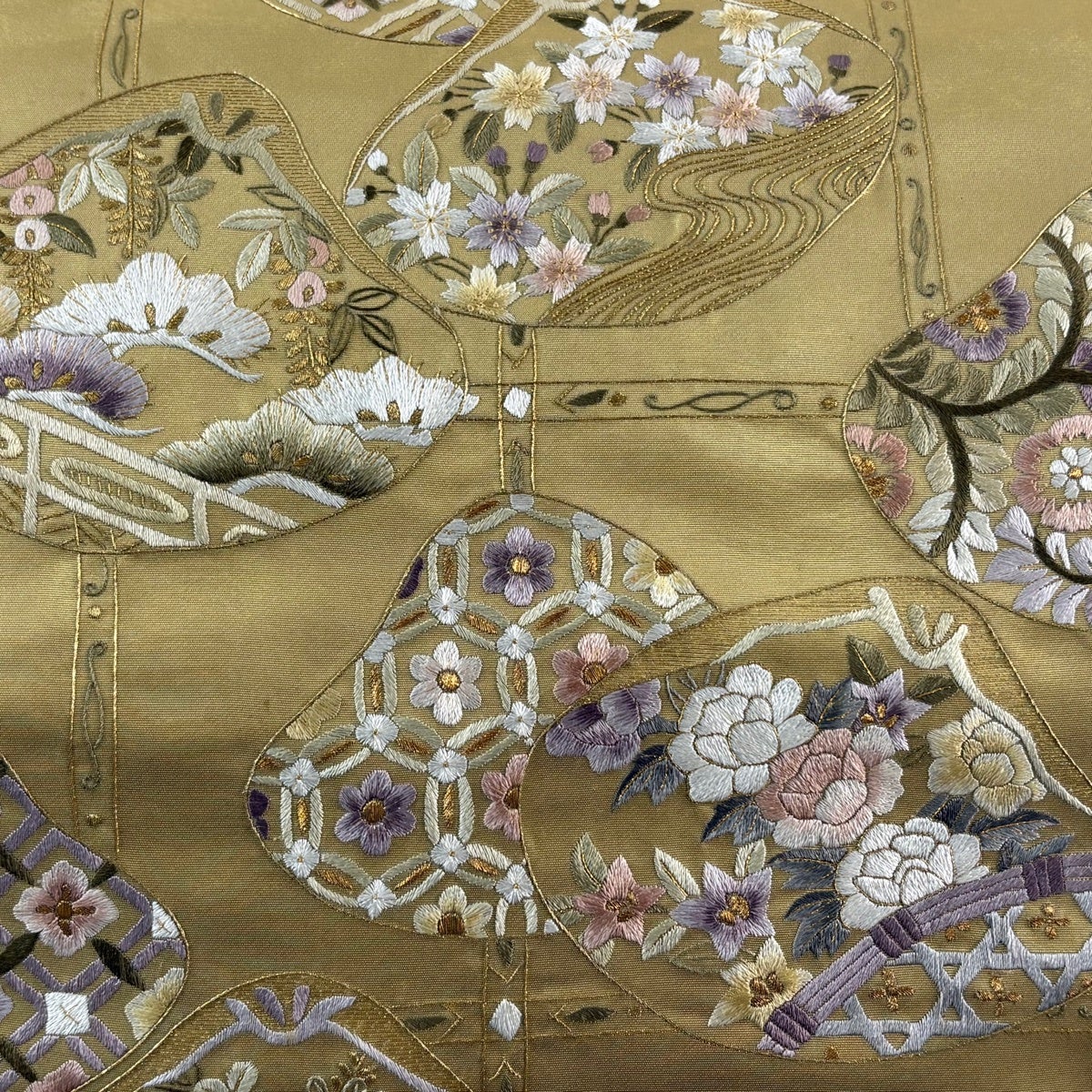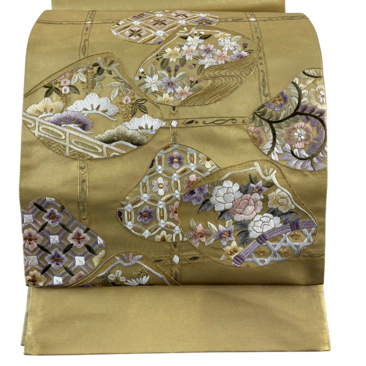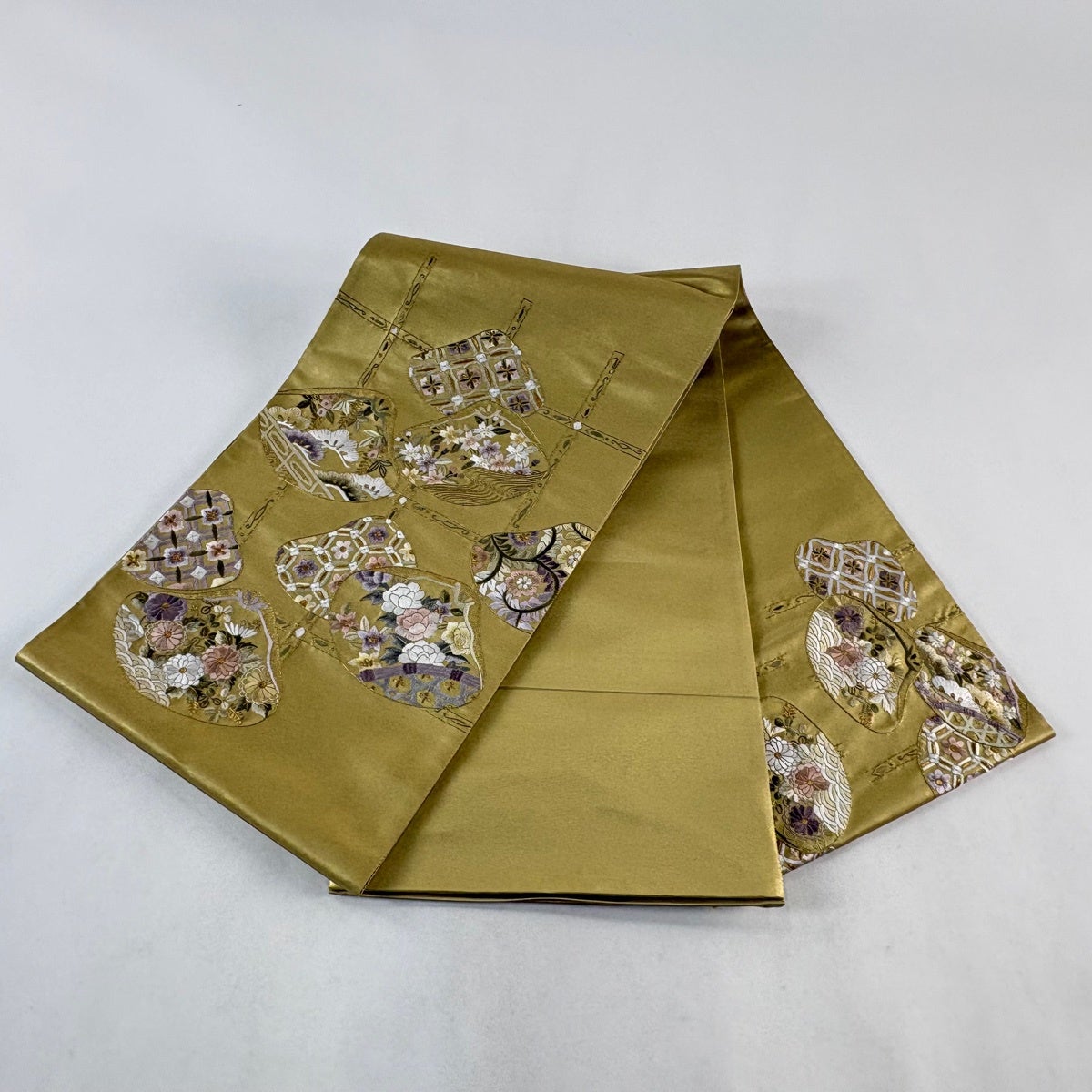 【美品】 袋帯 秀品 貝合わせ 草花 箔 刺繍 からし色 お太鼓柄 正絹