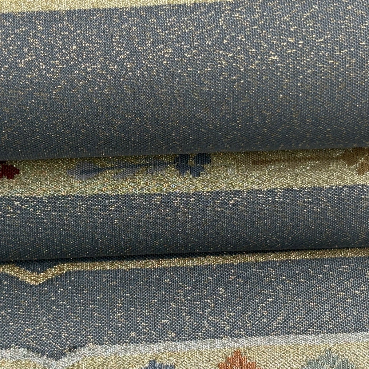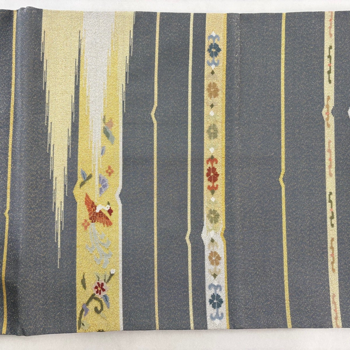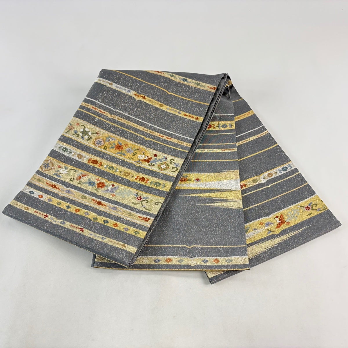【美品】 袋帯 秀品 菊 縞 箔 金糸 灰色 六通 正絹