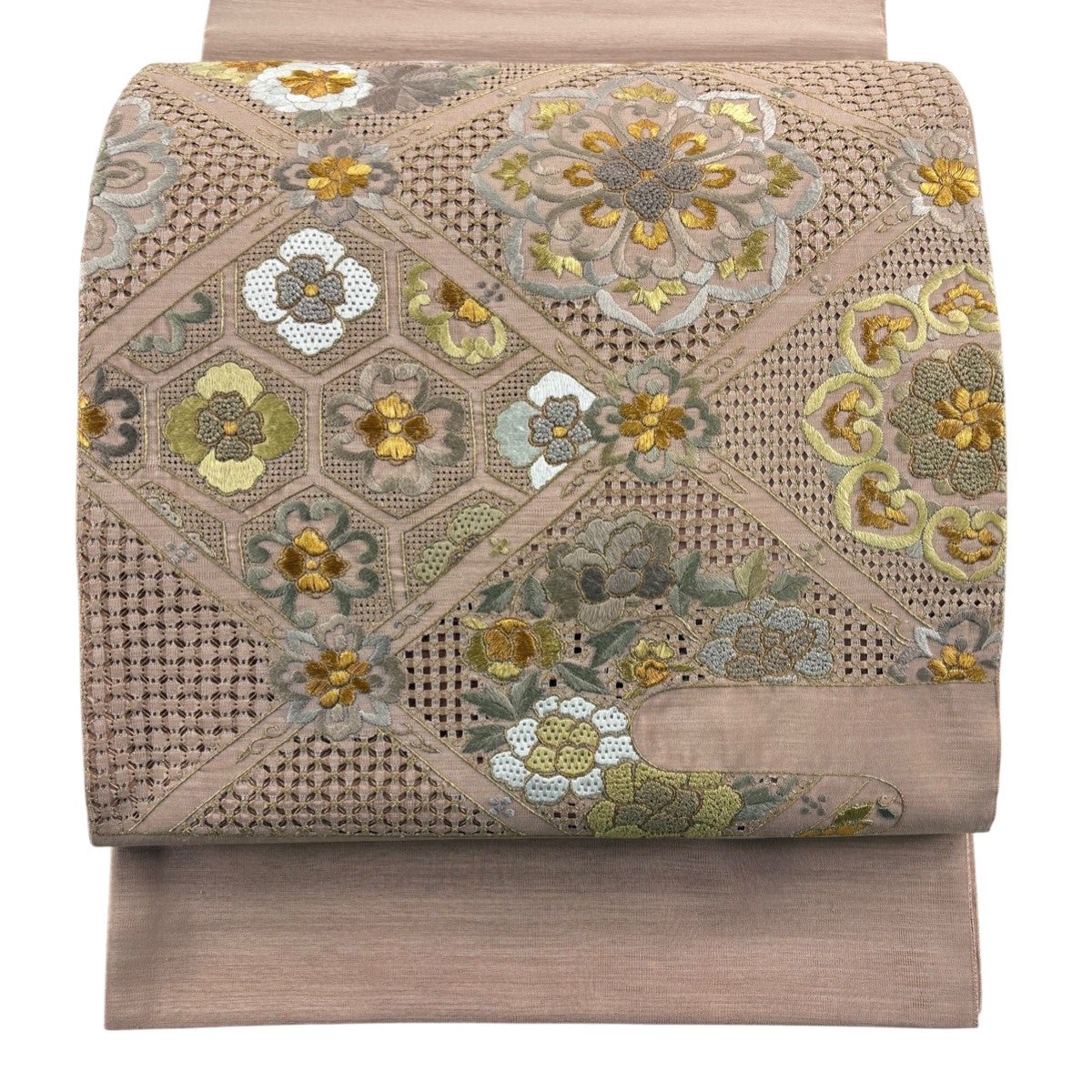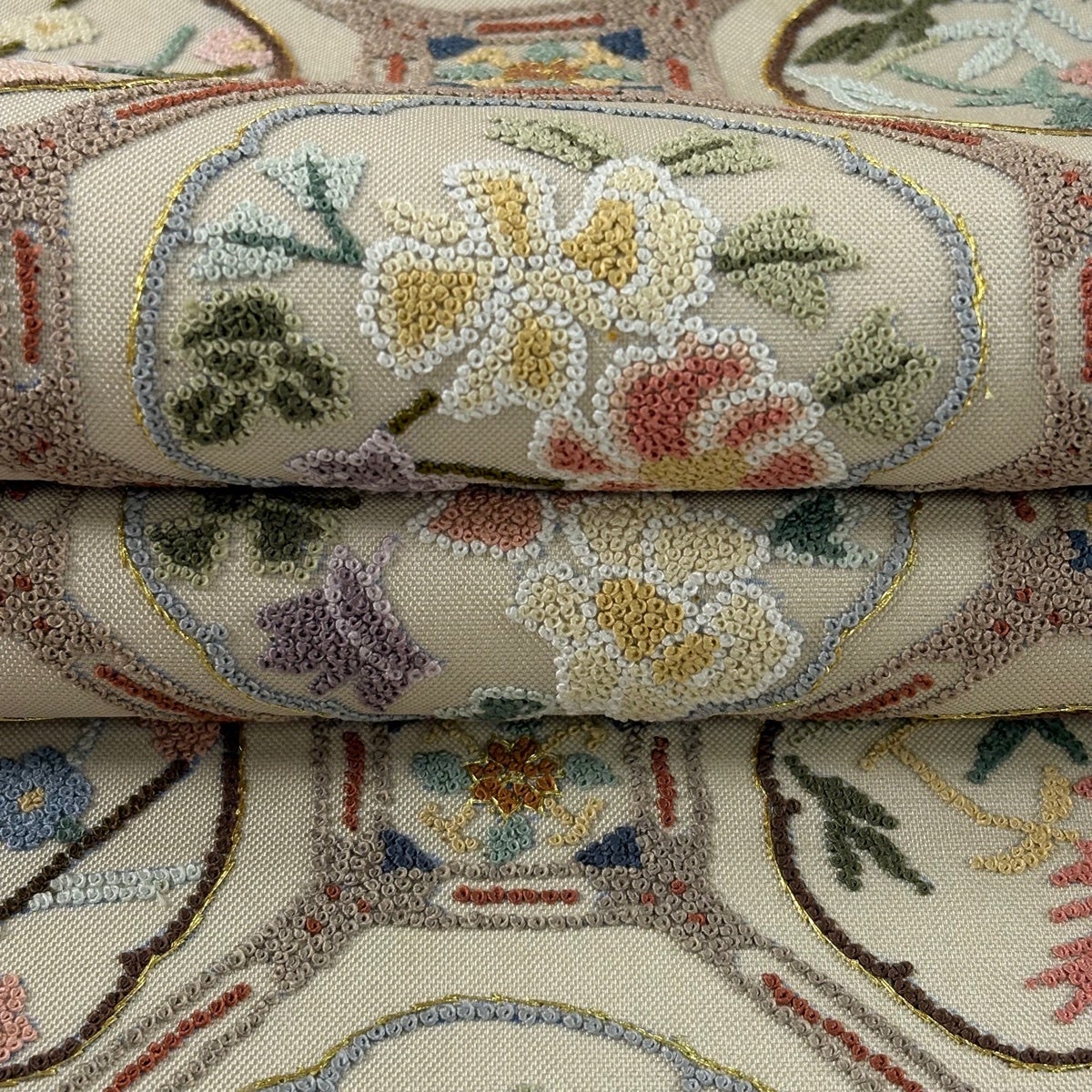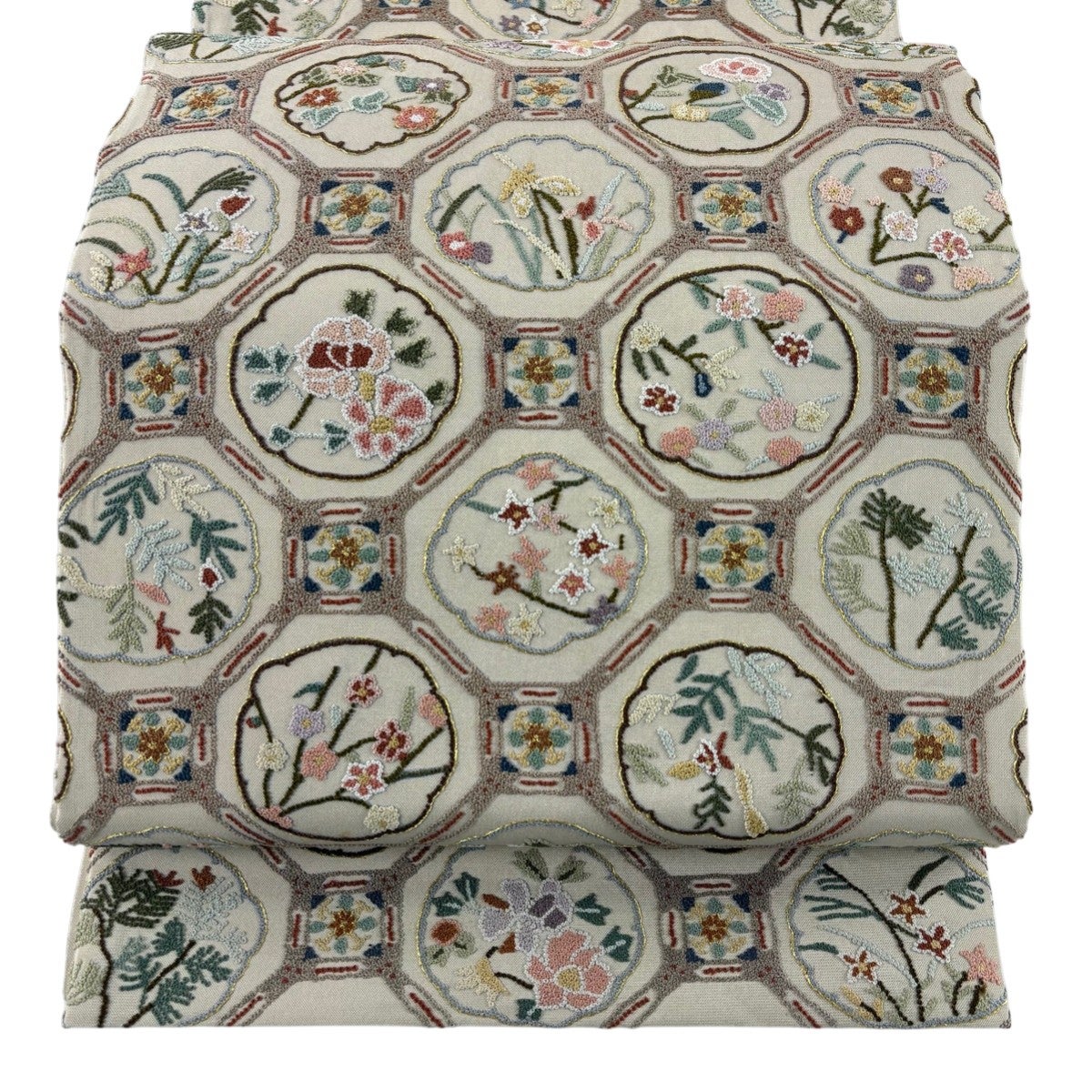 袋帯 秀品 関西仕立て 蜀江華文 七宝 箔 刺繍 ベージュ お太鼓柄 正絹