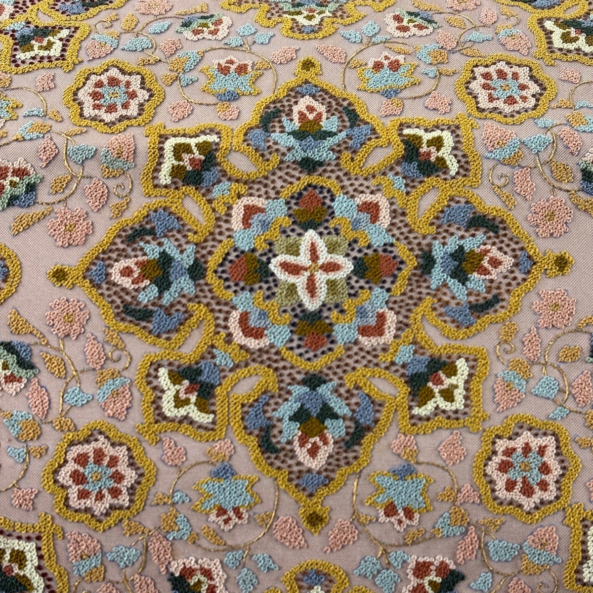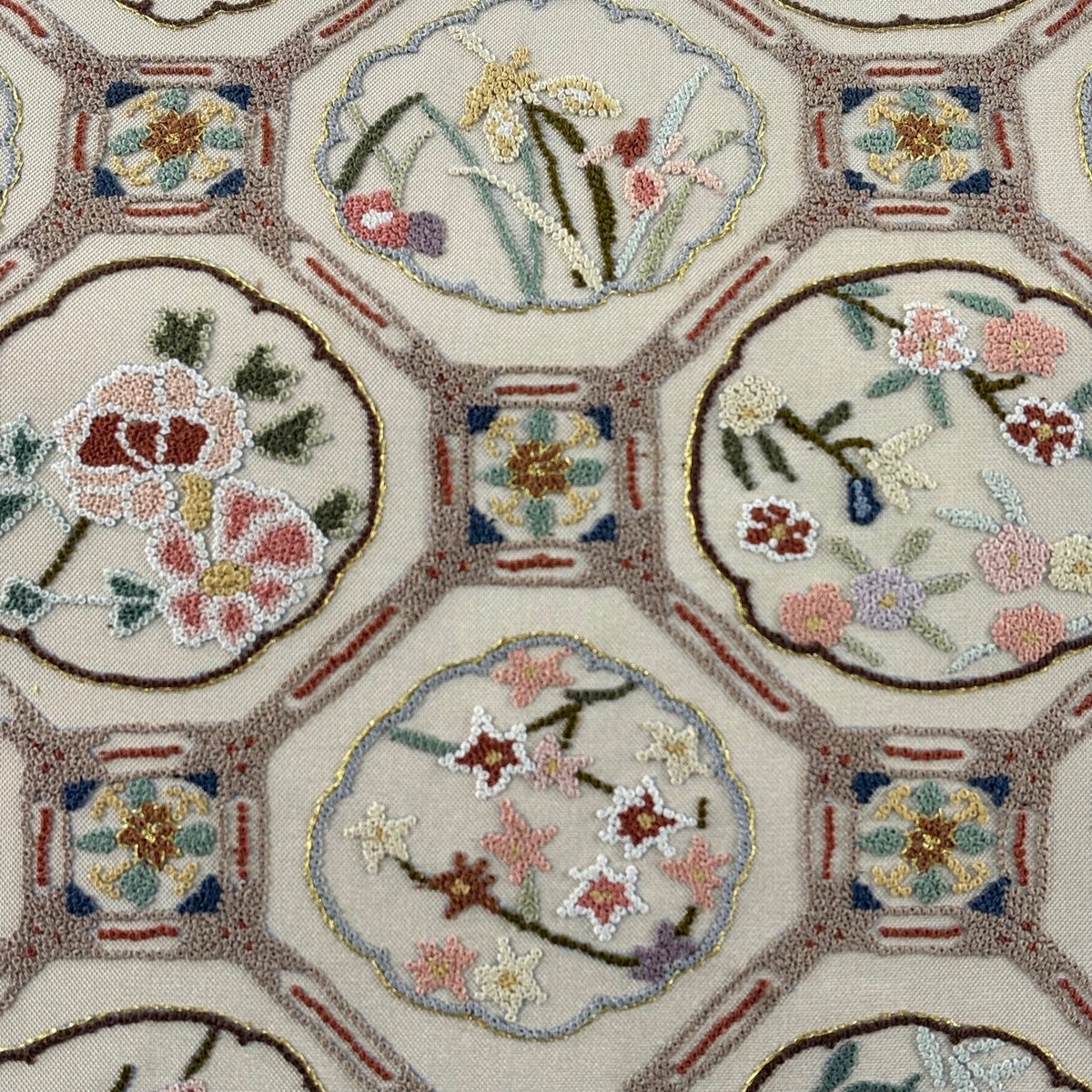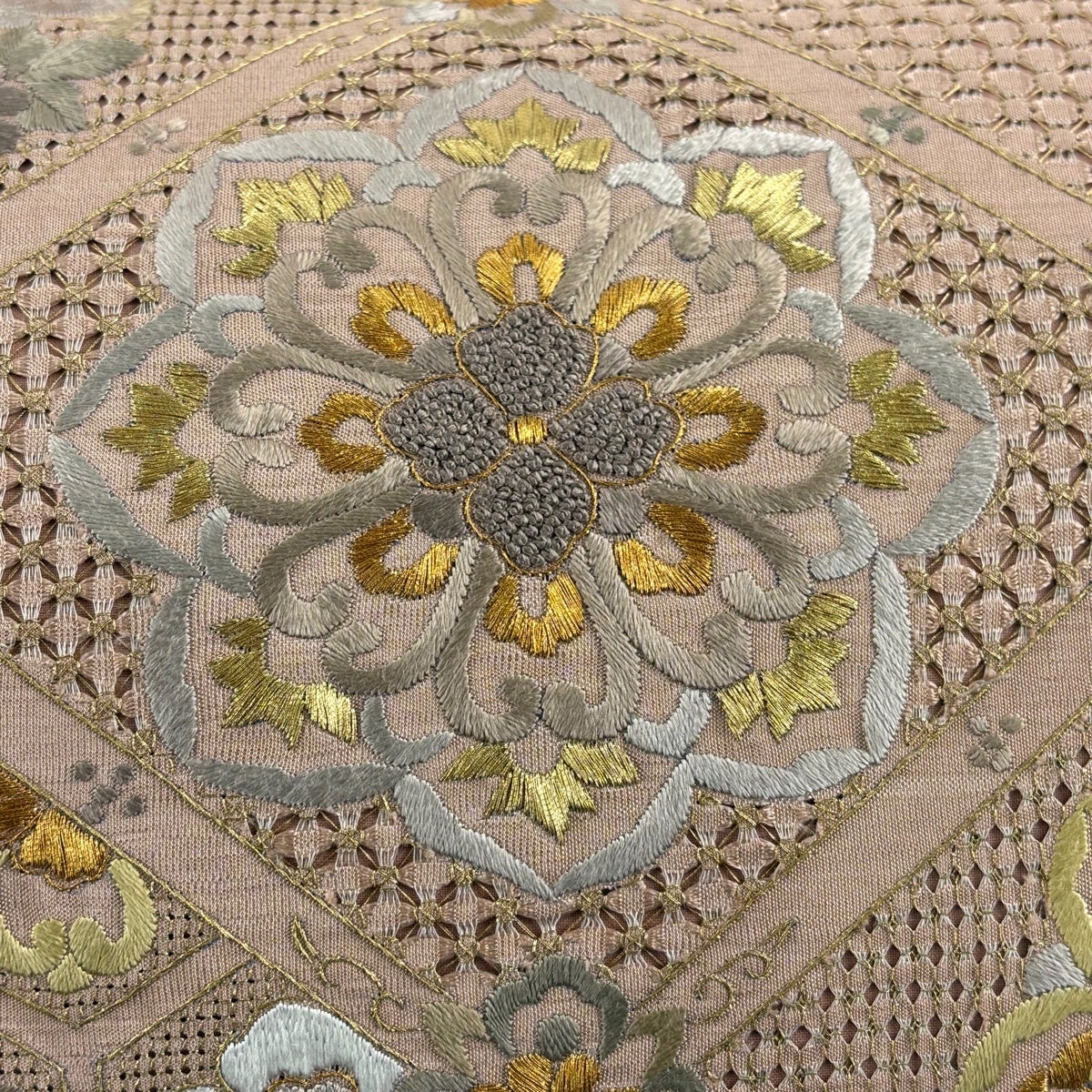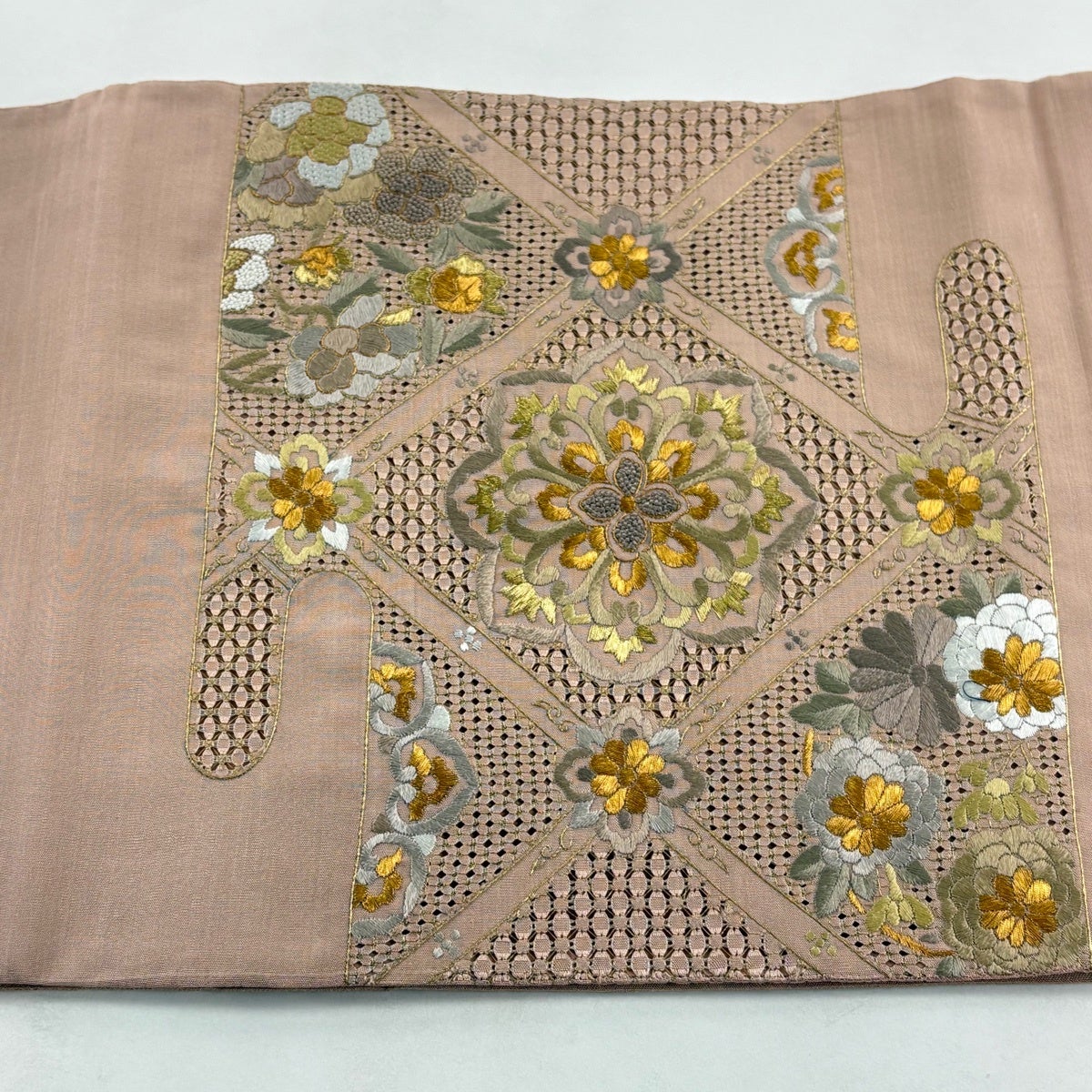 袋帯 秀品 関西仕立て 蜀江華文 七宝 箔 刺繍 ベージュ お太鼓柄 正絹