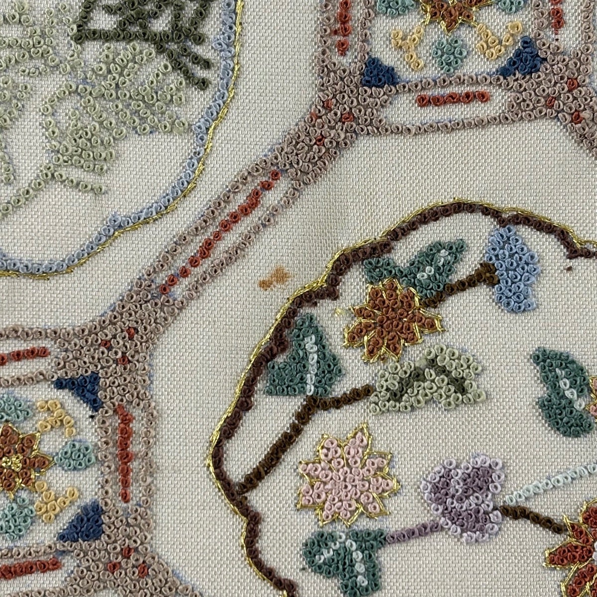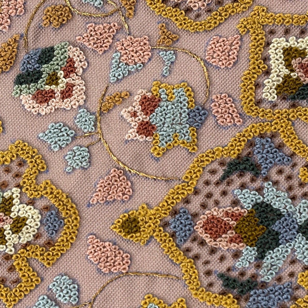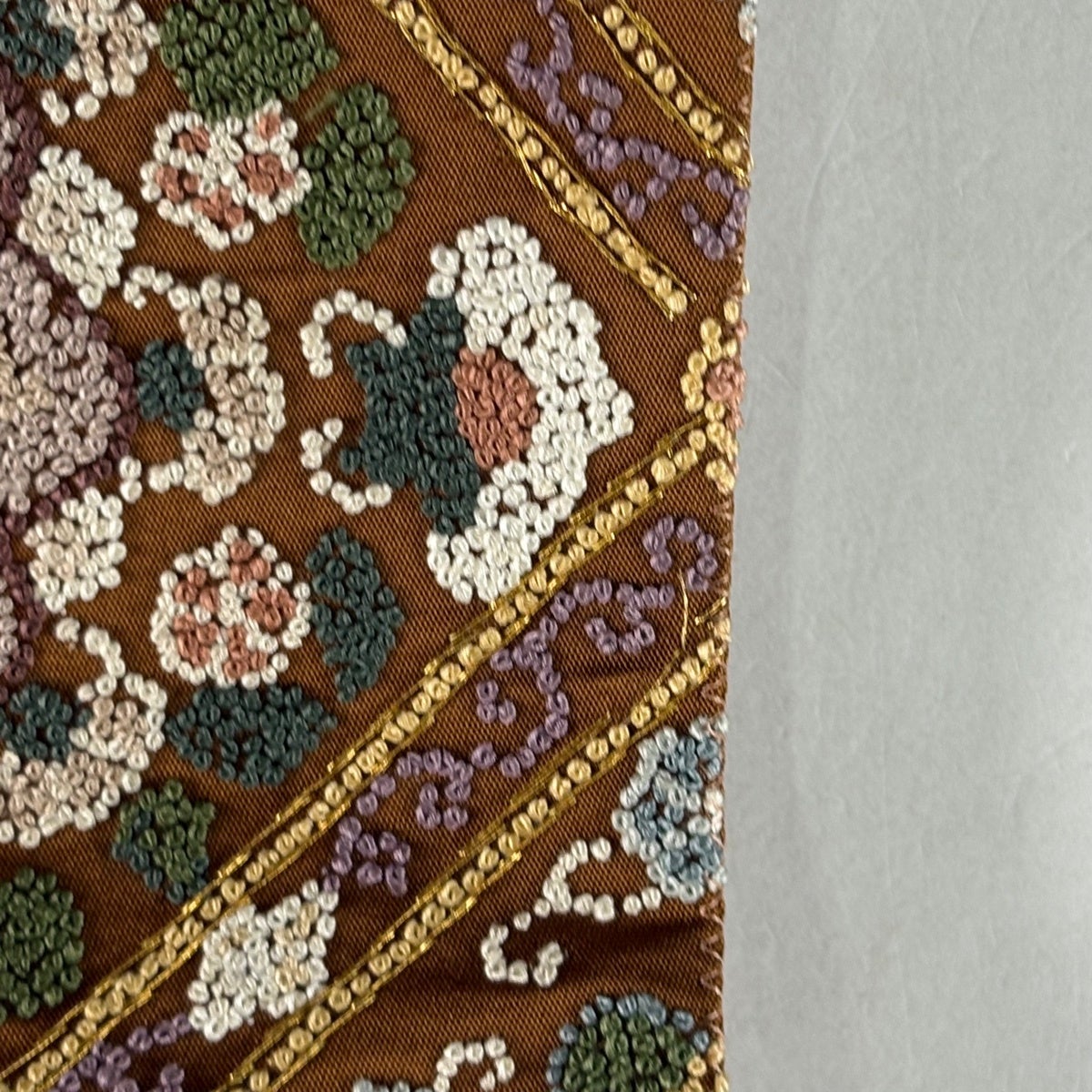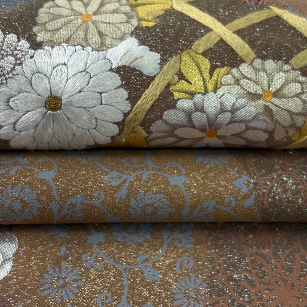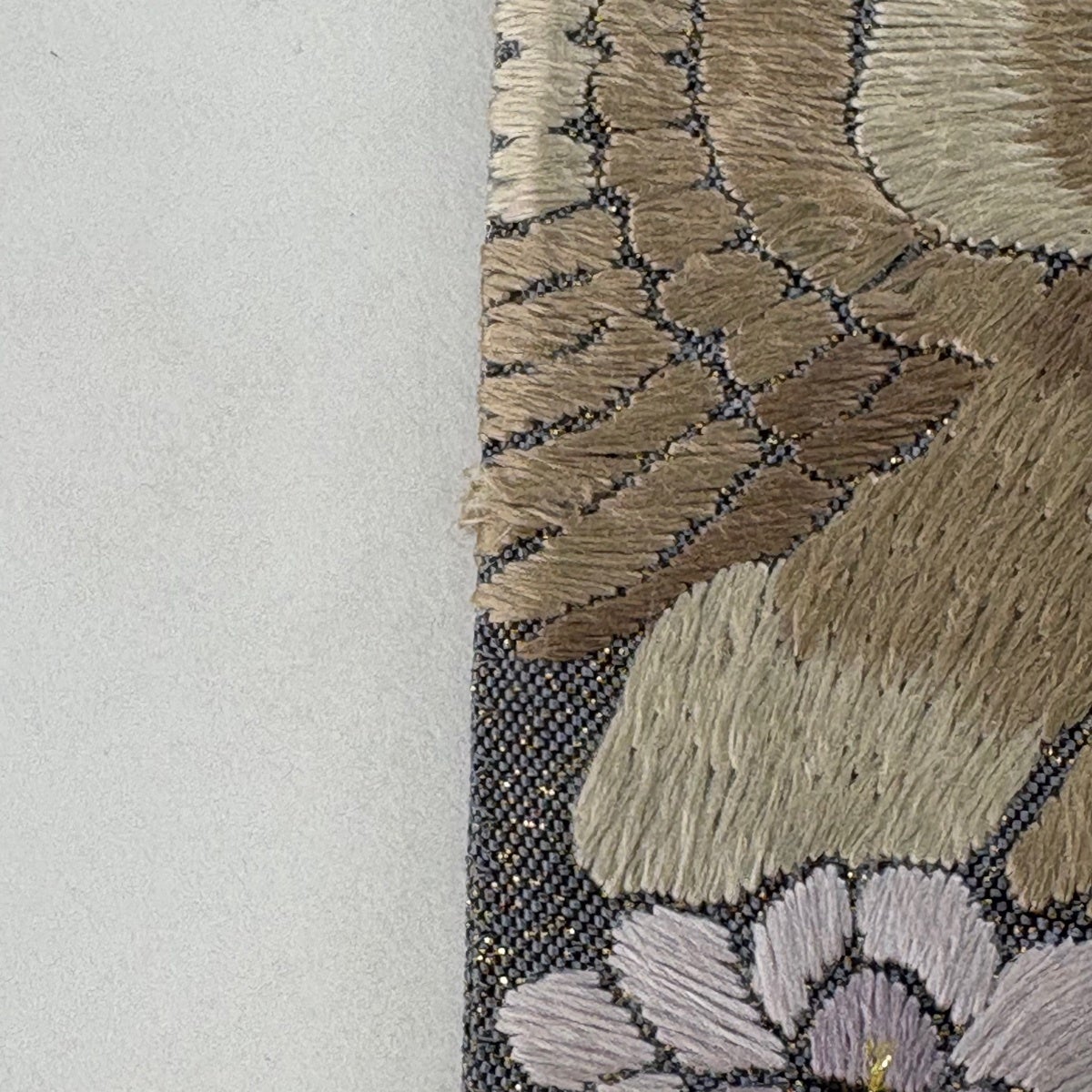 名古屋帯 秀品 紬地 花唐草 刺繍 灰茶 正絹