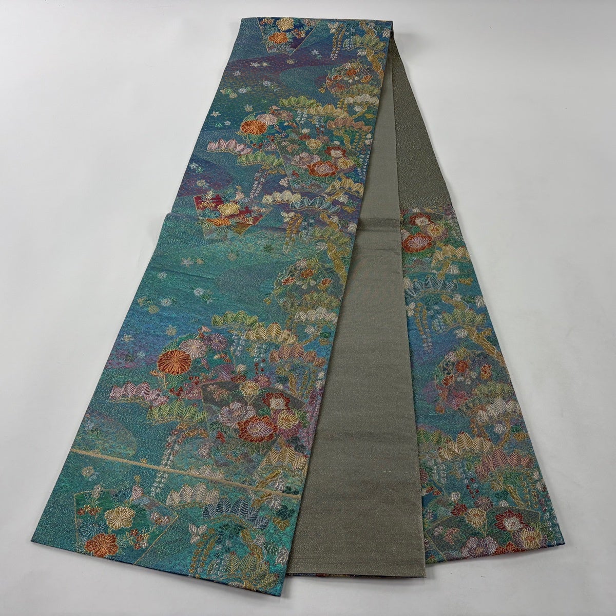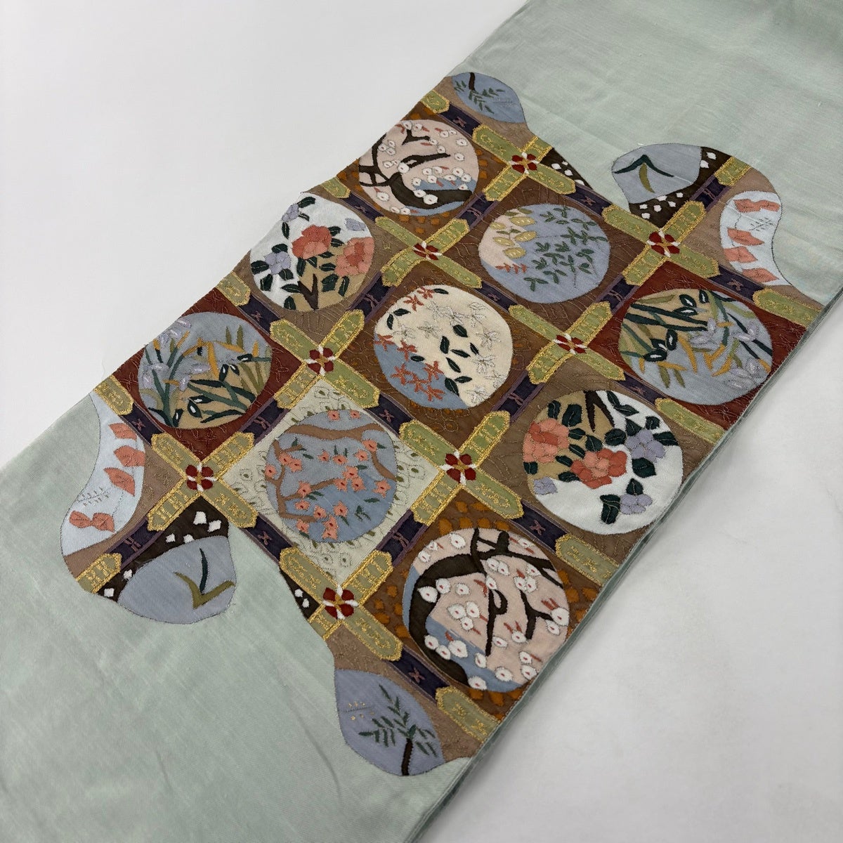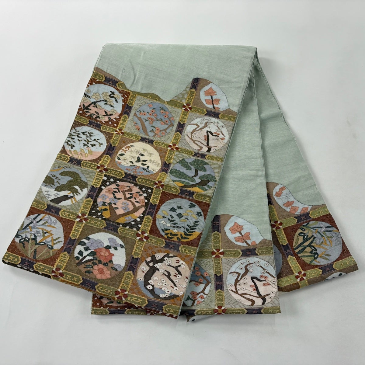 50%OFF 【美品】 袋帯 名品 華文 動物 刺繍 金糸 灰緑 お太鼓柄 正絹 K50