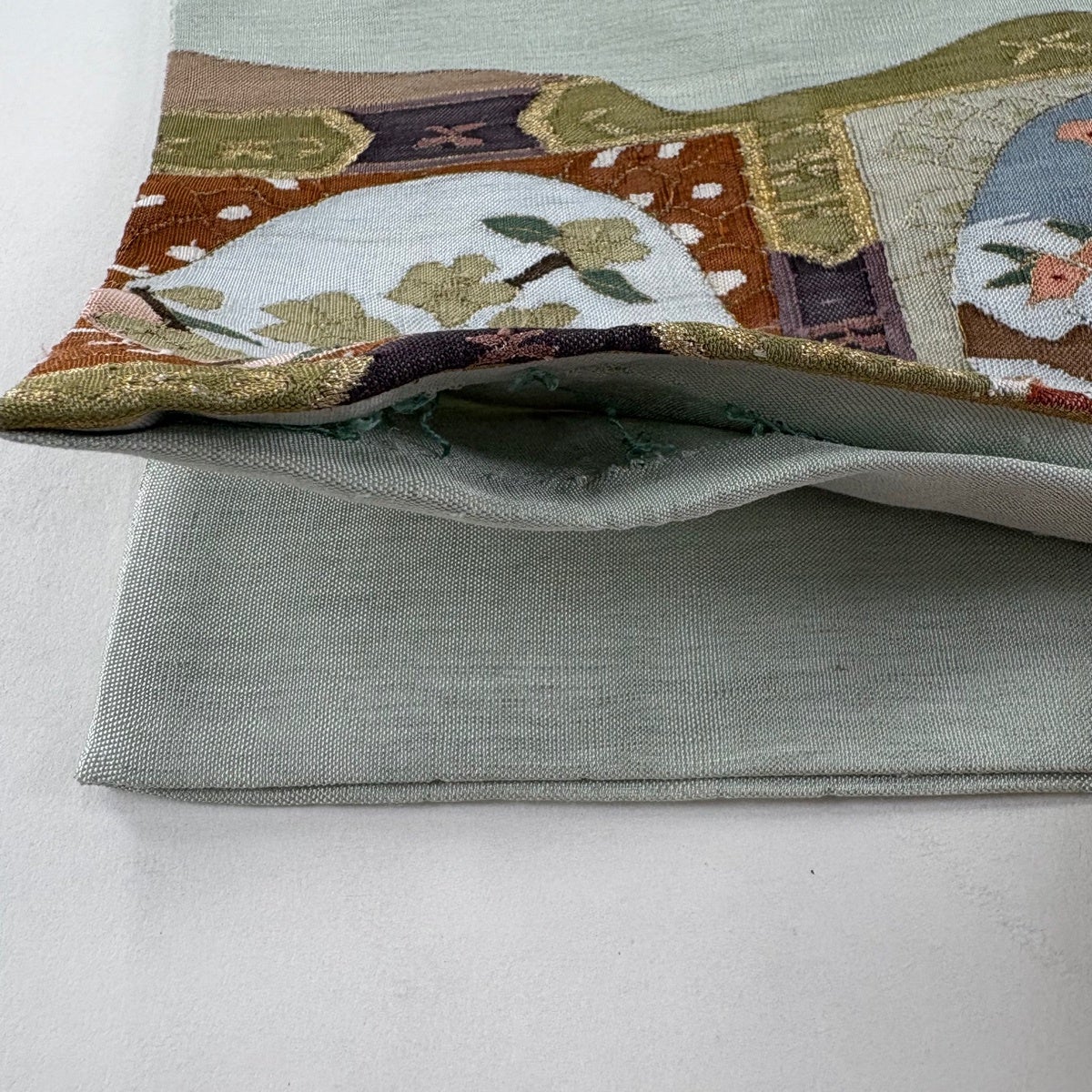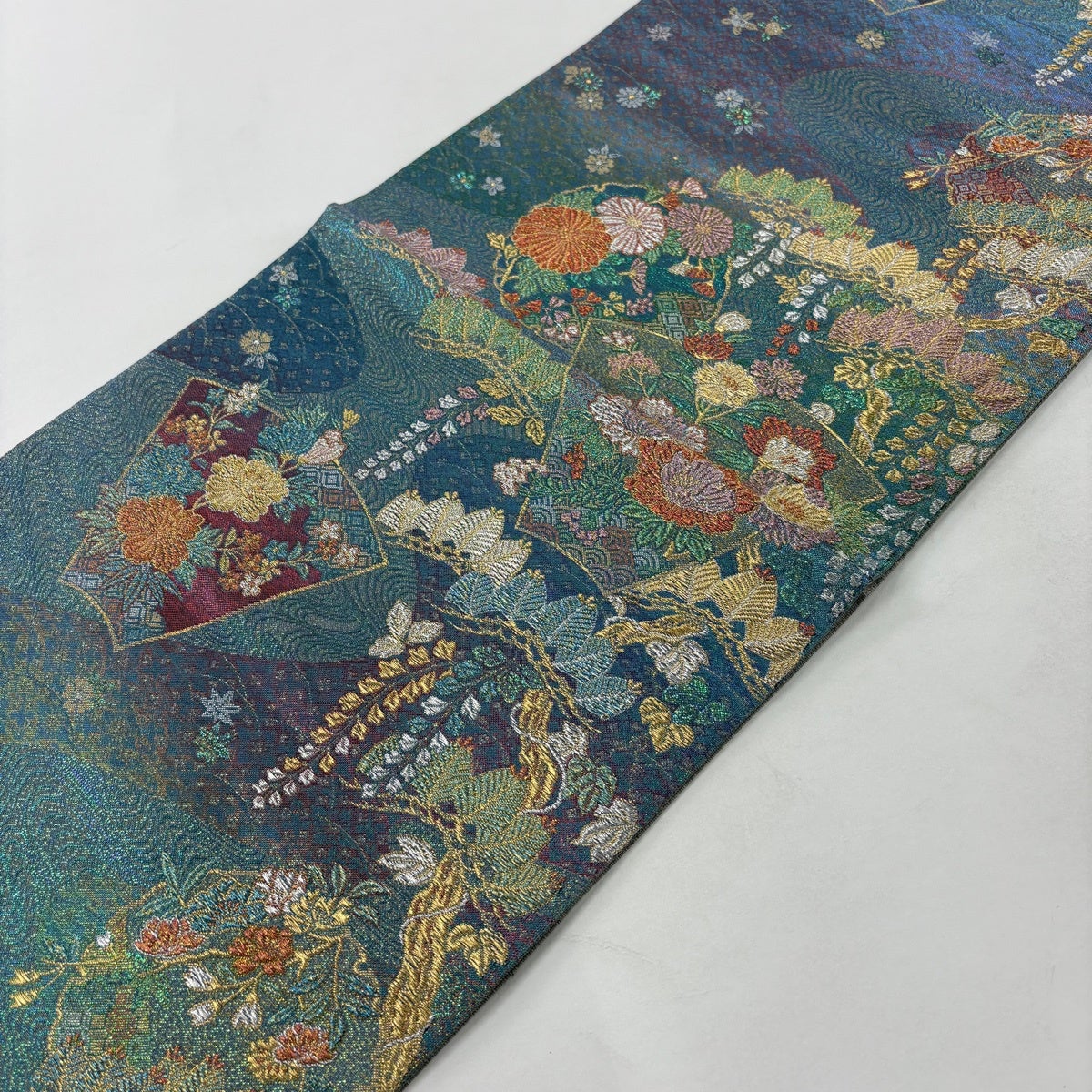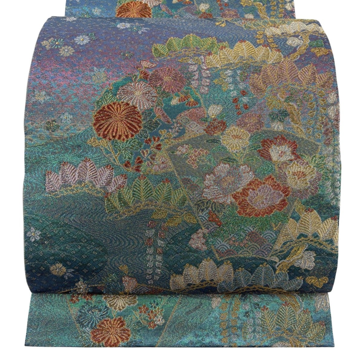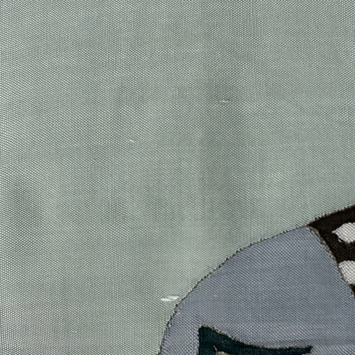 50%OFF 【美品】 袋帯 名品 華文 動物 刺繍 金糸 灰緑 お太鼓柄 正絹 K50