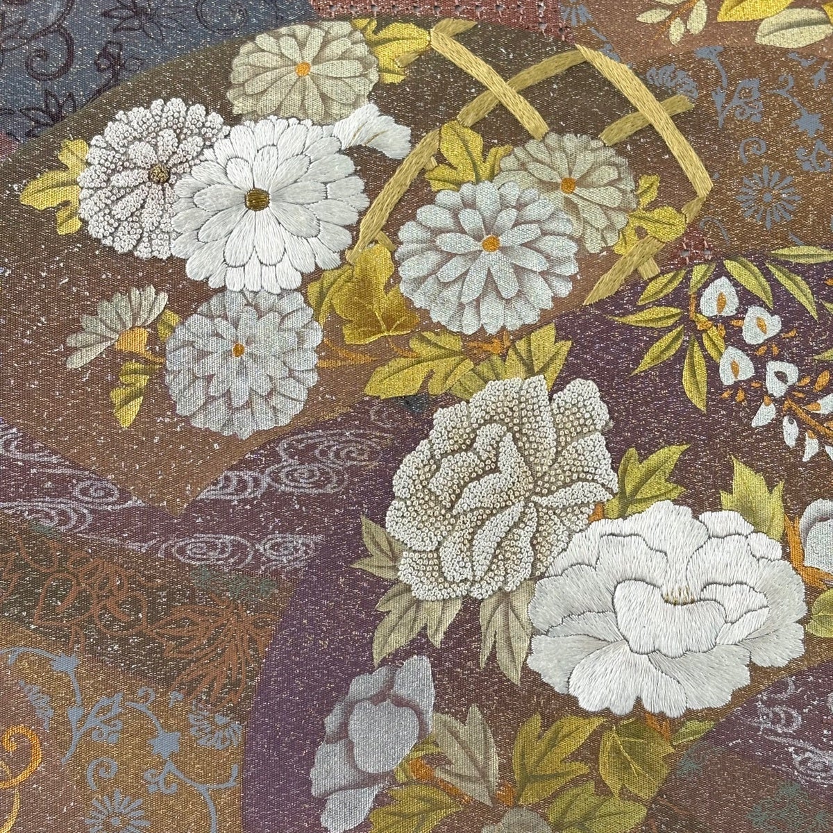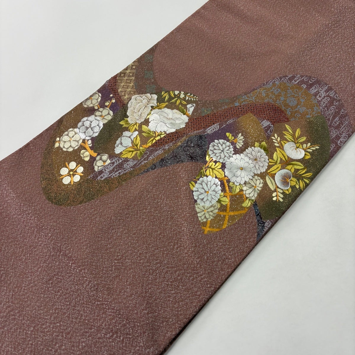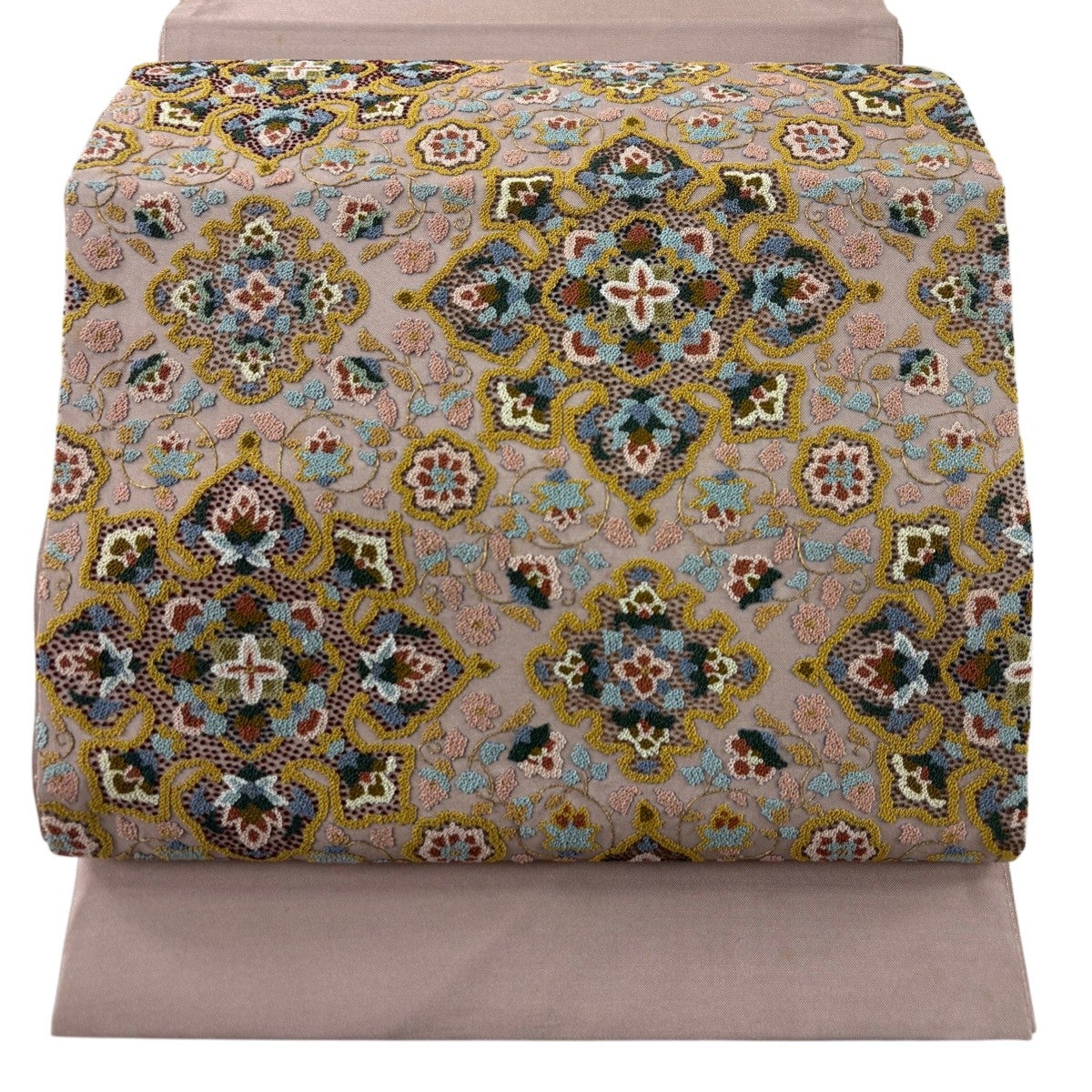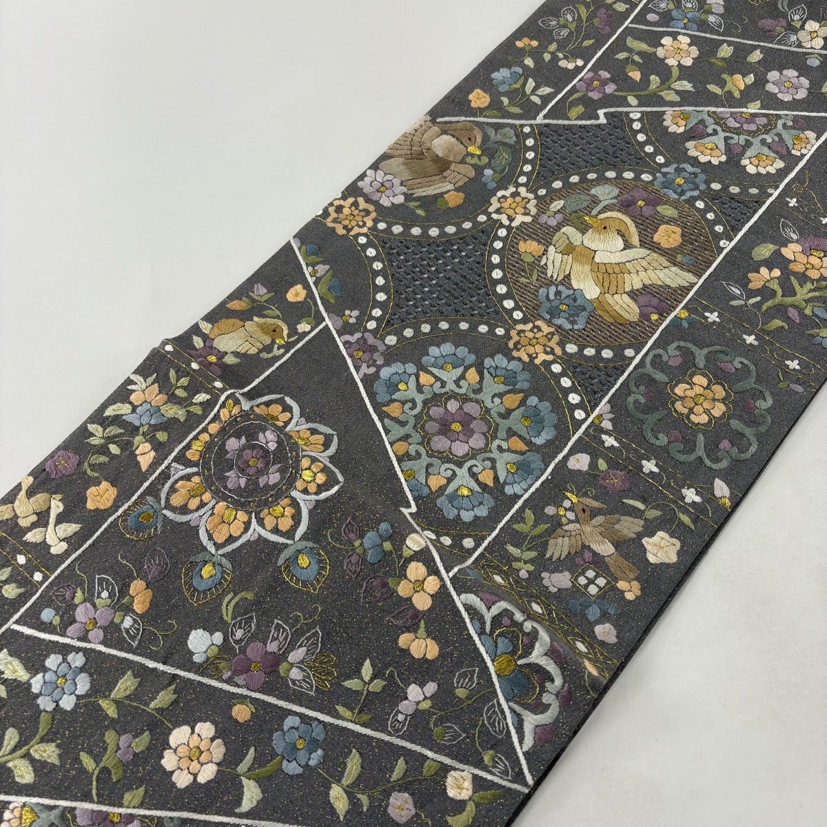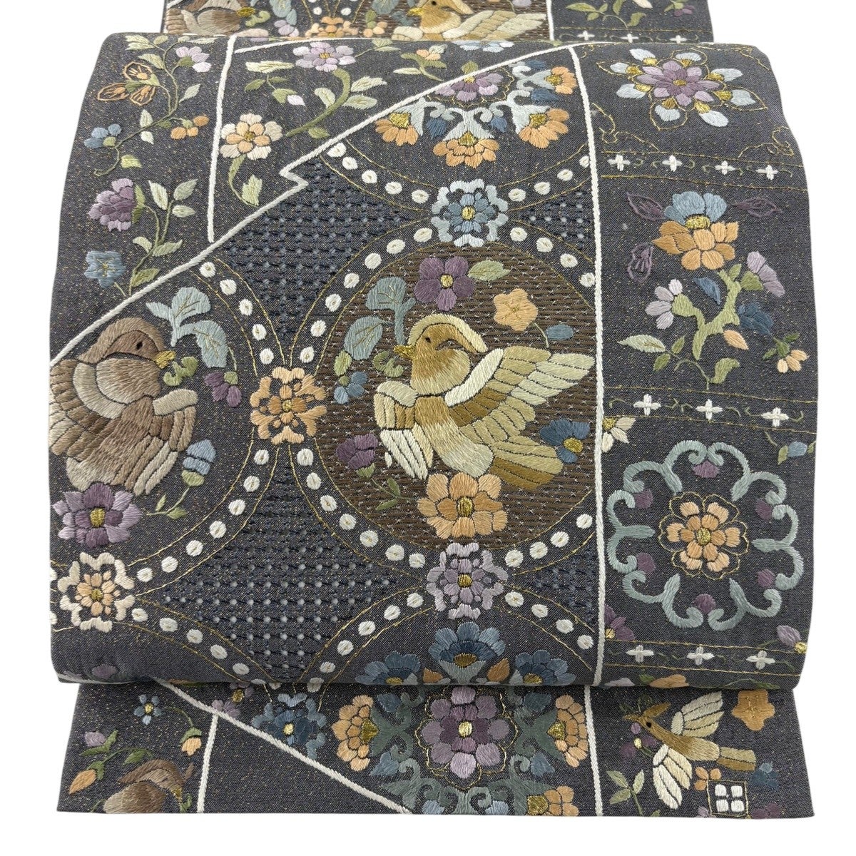 袋帯 名品 華文 草花 刺繍 螺鈿 灰紫 お太鼓柄 正絹