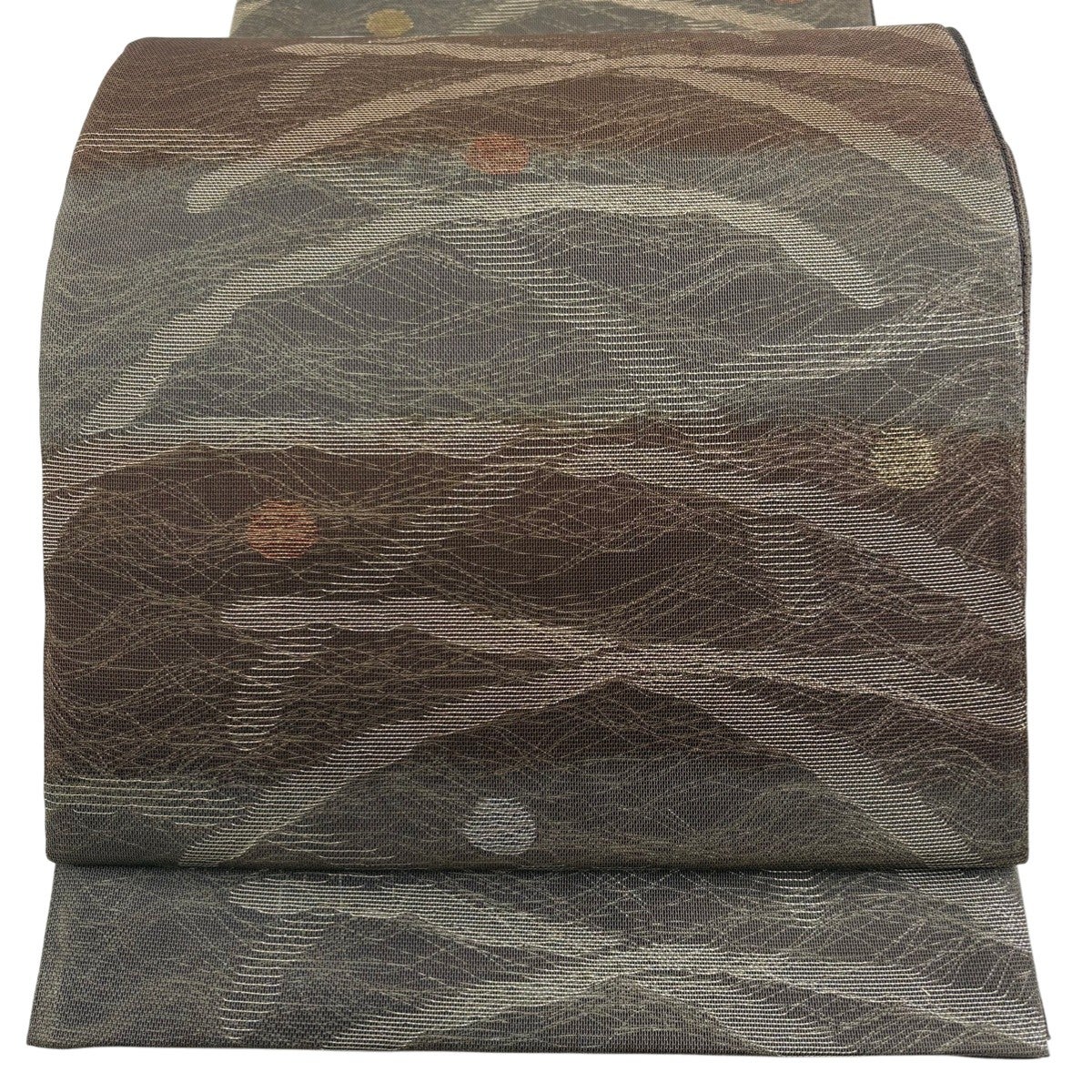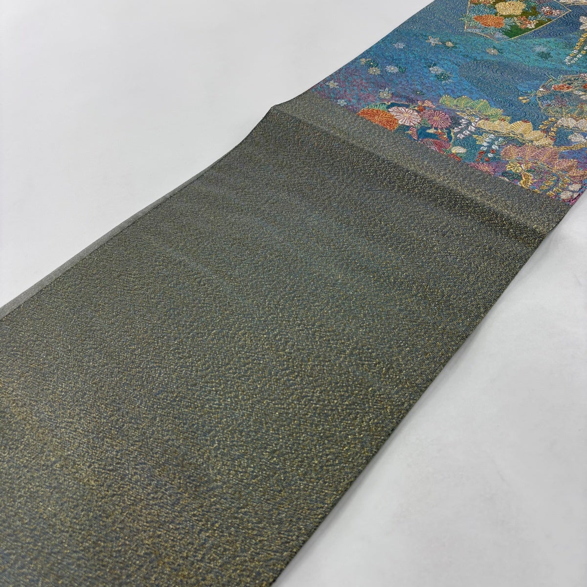 50%OFF 【美品】 袋帯 秀品 落款あり 水辺の風景 樹木 箔 灰緑 お太鼓柄 正絹 K50