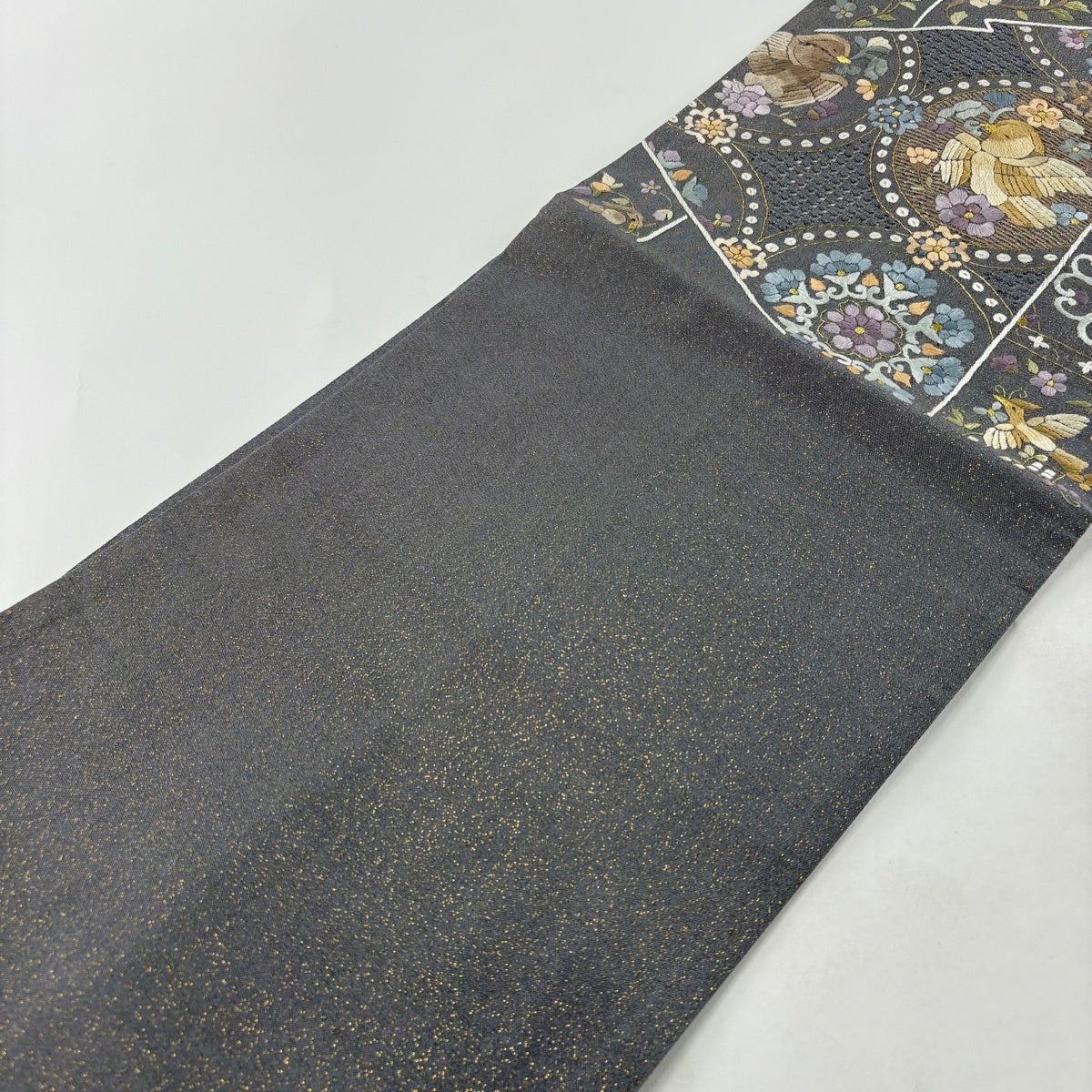【美品】 名古屋帯 秀品 華文 立涌 刺繍 墨色 正絹