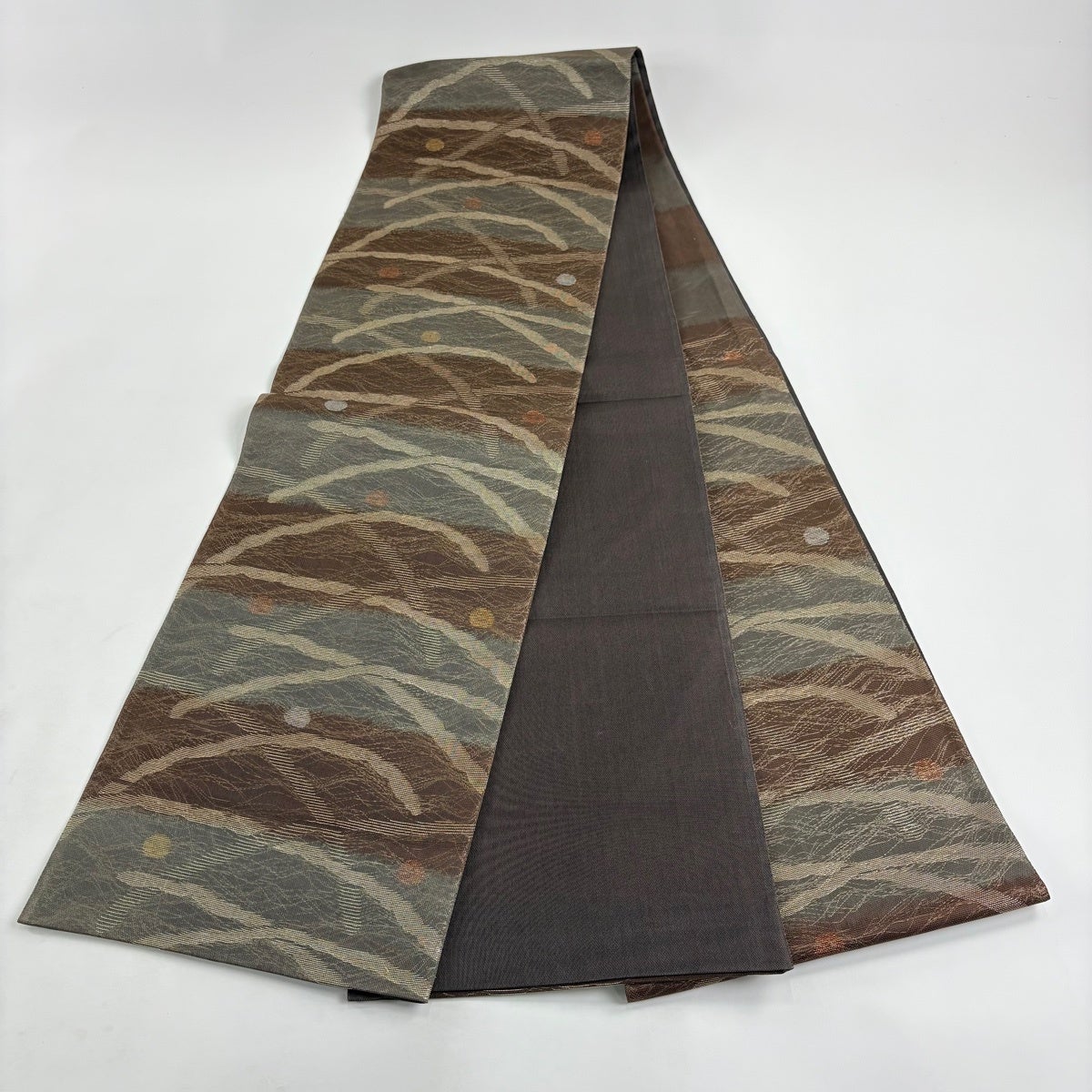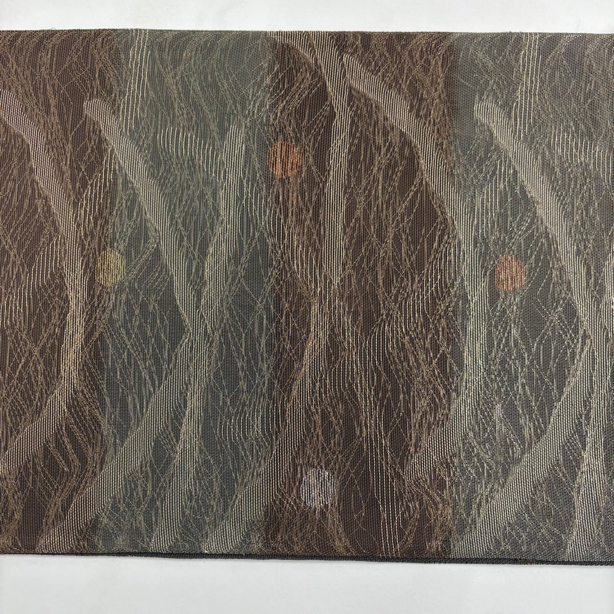 【美品】 袋帯 秀品 紬地 唐草 ぼかし 茶緑色 全通 正絹