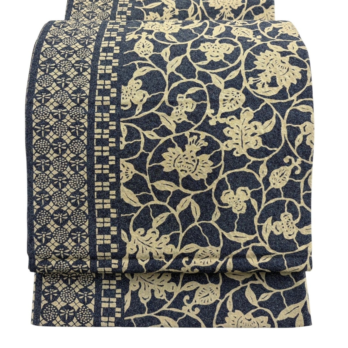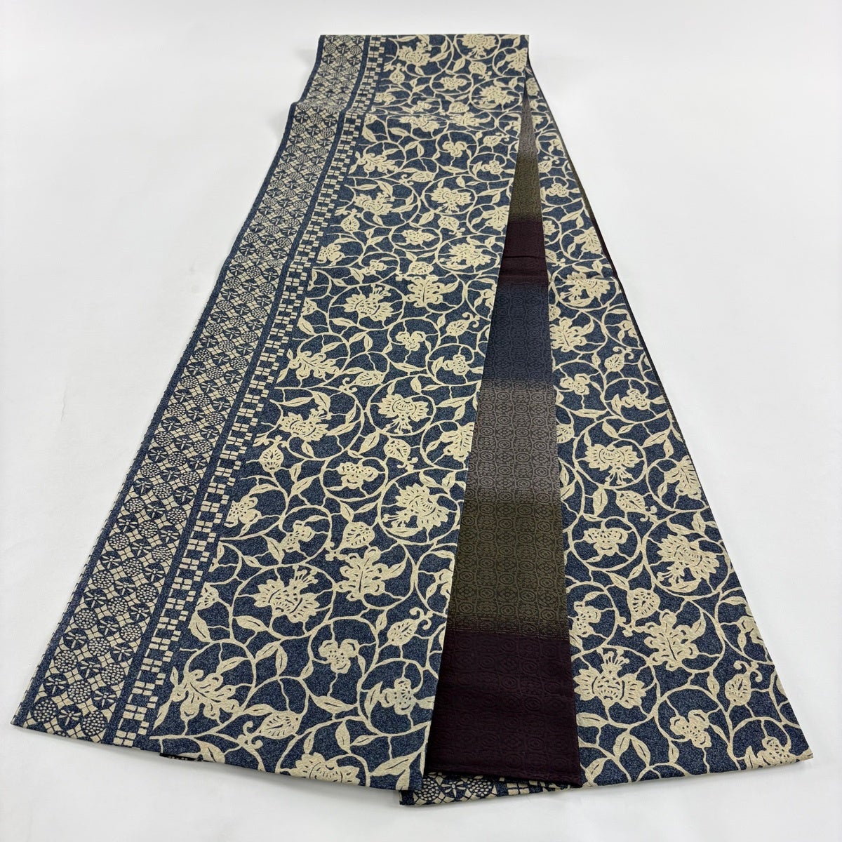 袋帯 秀品 花唐草 トンボ 金通し 紺色 全通 正絹