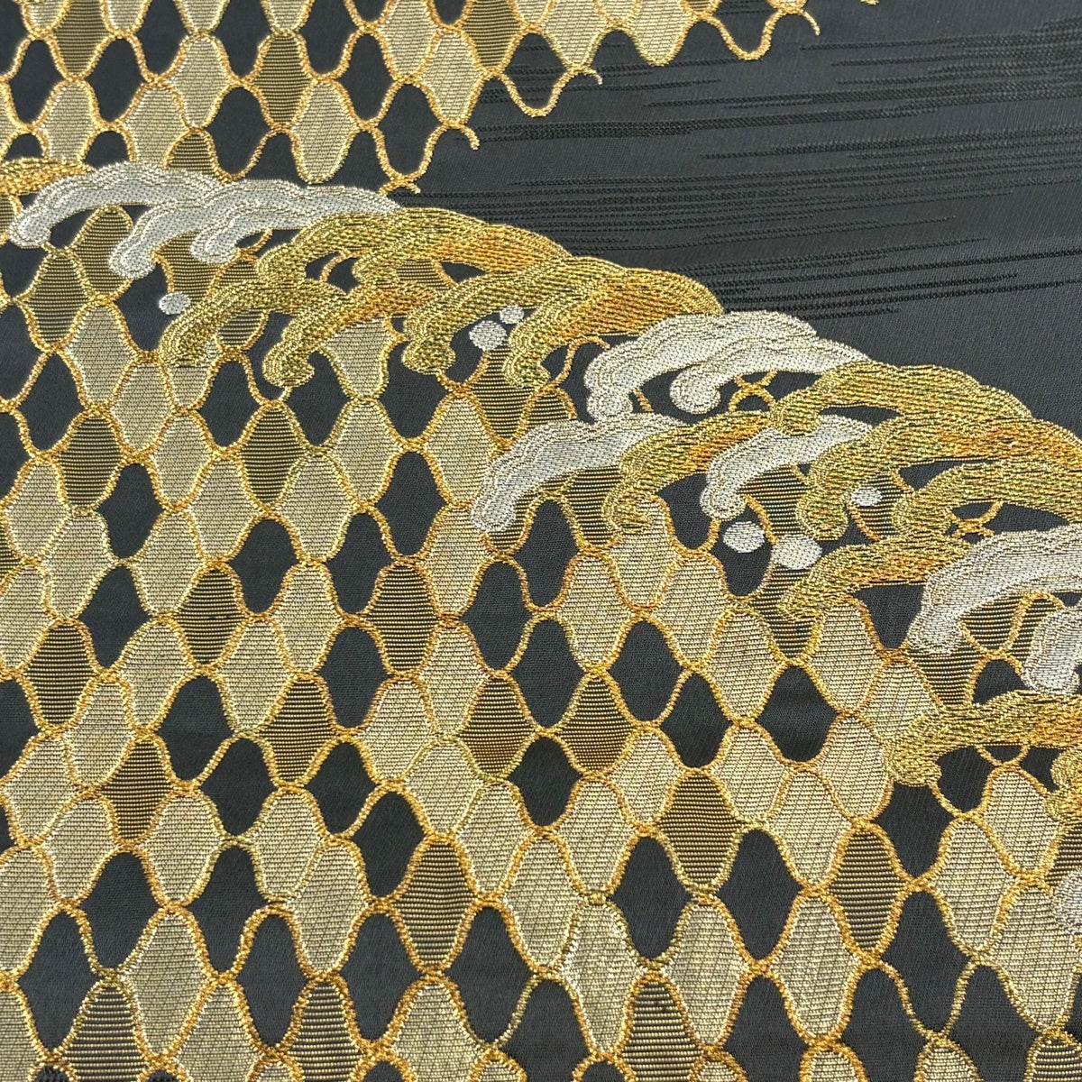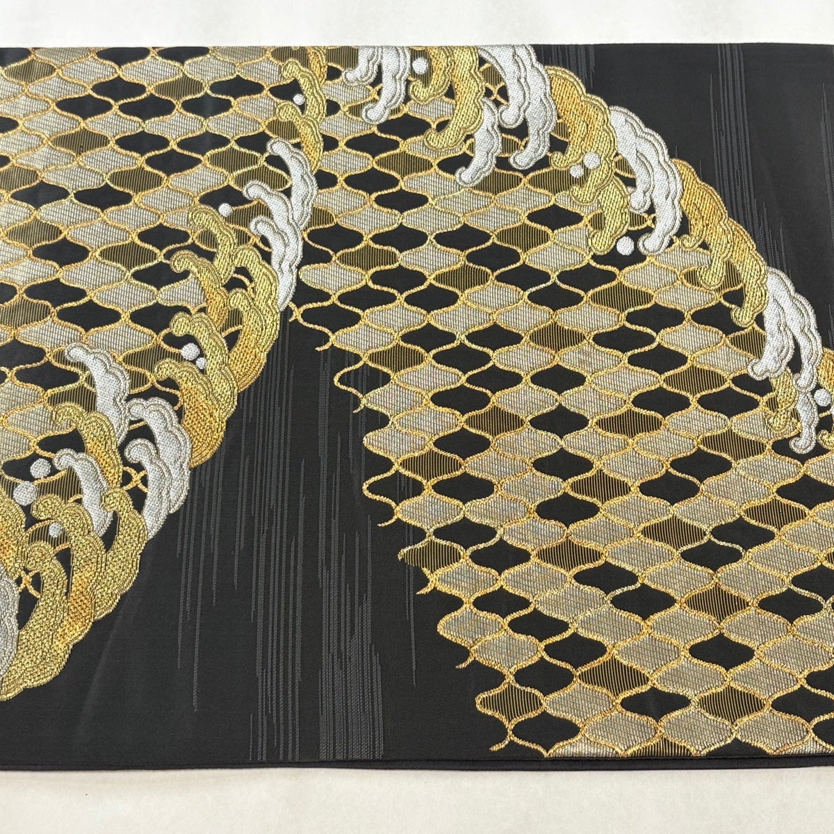 名古屋帯 秀品 幾何学模様 金糸 灰白 正絹