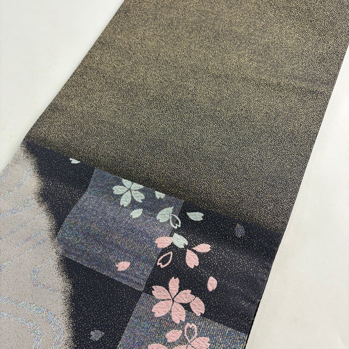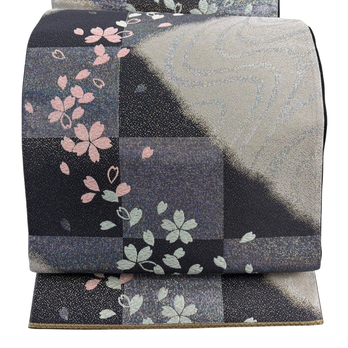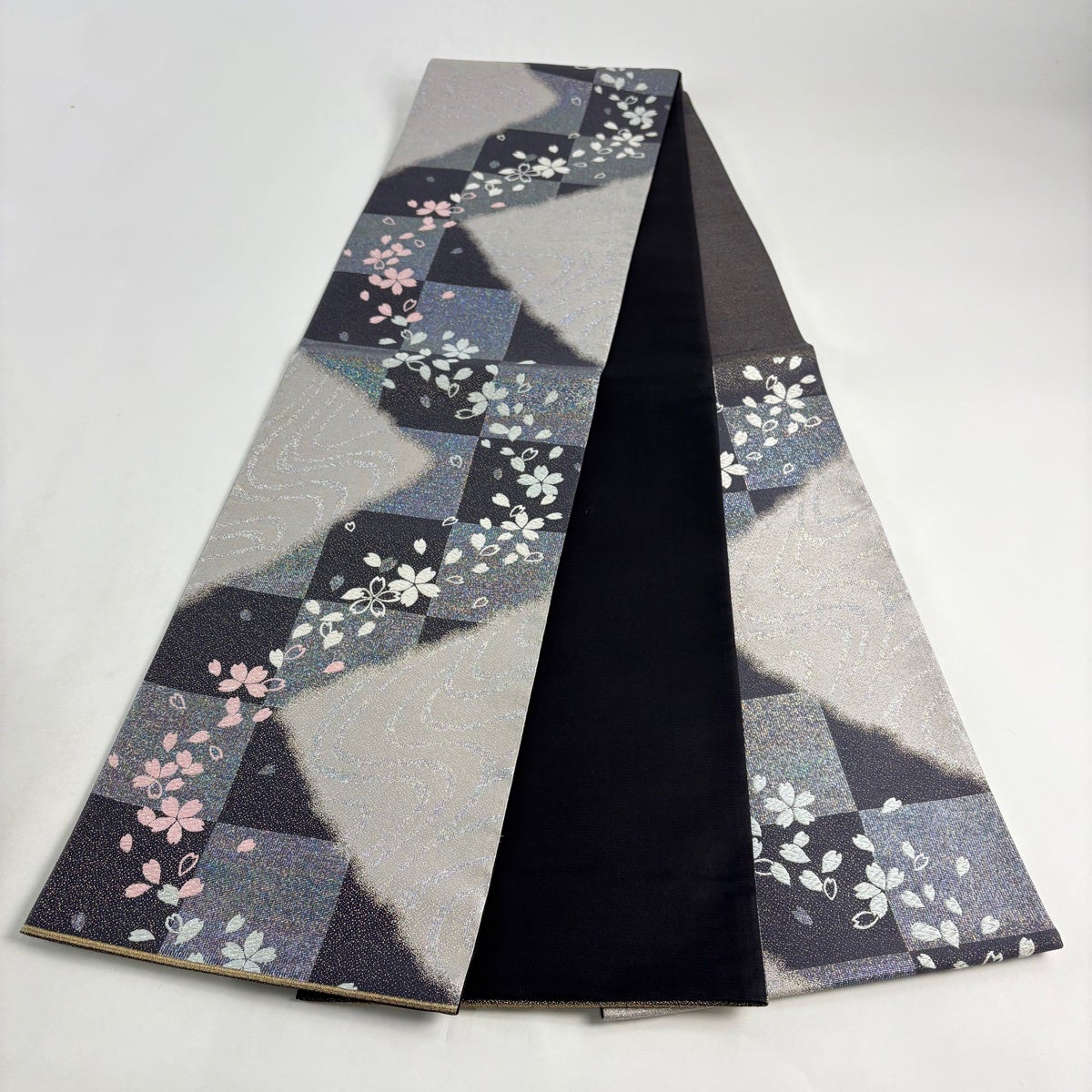 【美品】 袋帯 名品 桜 市松 金糸 ラメ箔 濃紫 六通 正絹