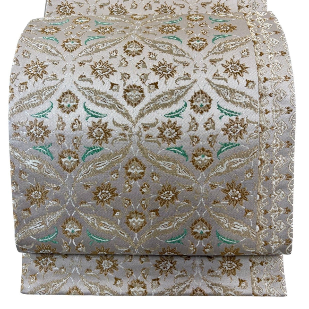 【美品】 袋帯 秀品 川島織物 落款あり 花唐草 金糸 箔 灰緑 六通 正絹